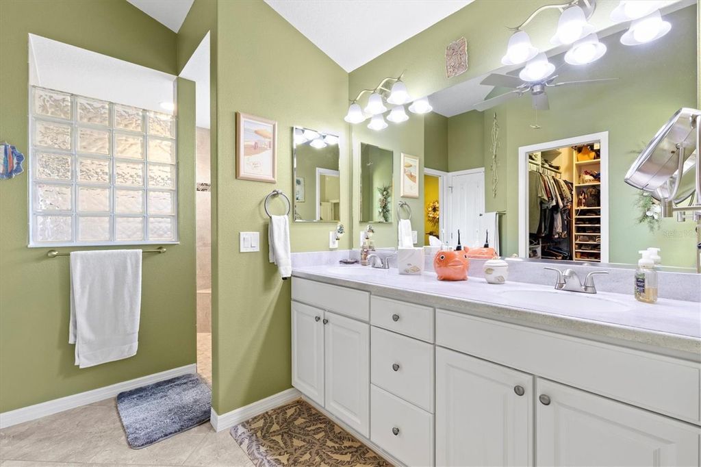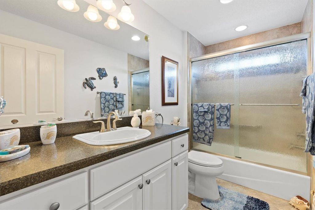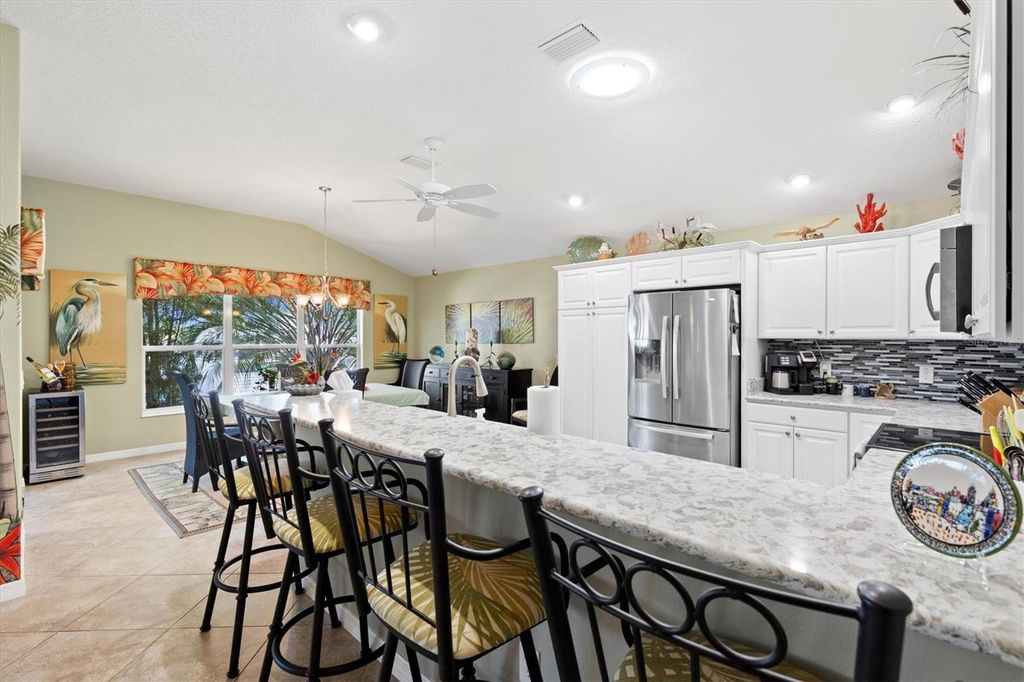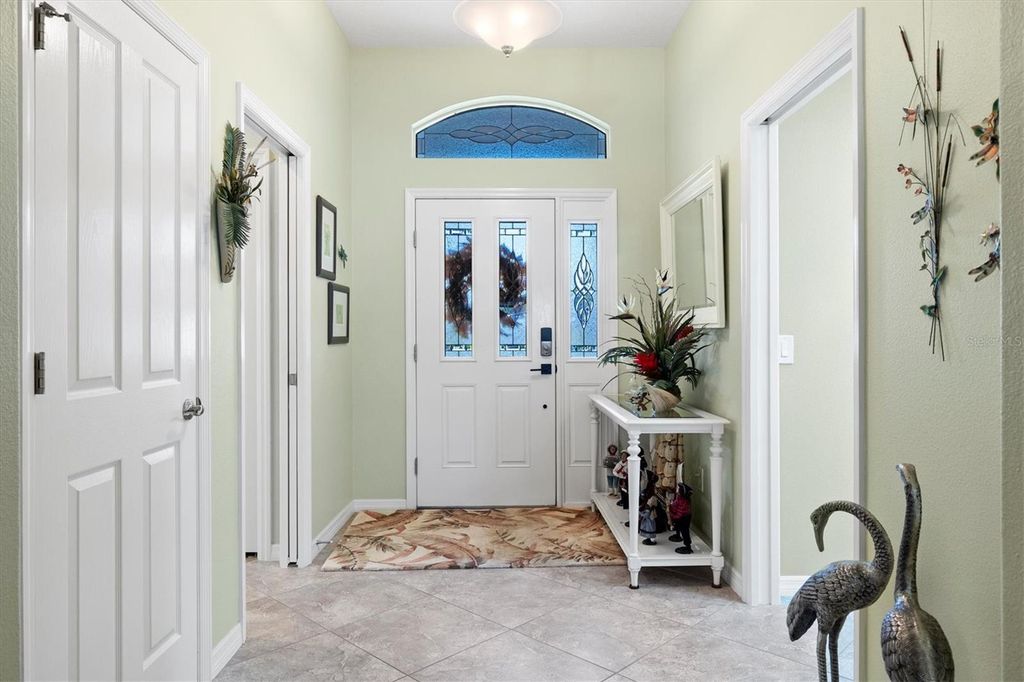 Tucked away on a quiet cul-de-sac, this beautifully maintained home offers outstanding curb appeal, highlighted by a decorative painted driveway and lush, well-designed landscaping that set the tone from the moment you arrive. Inside, the home is filled with natural light thanks to multiple solar tubes, adding energy-efficient brightness throughout the living areas. The 1,842 sq ft of living space does not include the glass-enclosed lanai, which is under air and extends the usable living space even further. The lanai opens to a charming pergola, creating the perfect setting for relaxing or entertaining both indoors and out. The kitchen features stainless steel appliances, hard quartz countertops, a stylish tile backsplash, and ample workspace"”ideal for everyday living or hosting guests. The spacious primary suite offers a walk-in Roman shower and Corian countertops in the master bath, delivering comfort and functionality. Additional upgrades include attic pull-down stairs, a solar attic fan, and a painted garage floor and walls for a clean, finished look. The garage is further enhanced with an electrical garage-door screen, allowing fresh airflow whenever desired. And of course, the highly desirable golf cart garage"”a must-have in The Villages®"”completes the package. This thoughtfully updated home offers a combination of comfort, efficiency, and lifestyle, all in a peaceful cul-de-sac setting and ready for its next owner to enjoy.