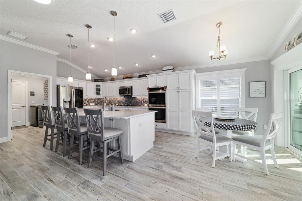 Waterfront Designer Iris (room for a pool) home built in 2021 like no other, located in The Villages of Southern Oaks, with an astonishing 2,930 living square feet and a splendid view of the lake and room for a pool. Buckle up, because everything coming next is mind-blowing. An additional 872 square feet of open floor space was added to the rear of the house with oversized glass windows giving wonderful panoramic views of the lake, including roller shades to keep the sun off - you can see out, but others cannot see in. The space also features three mini splits and raised floors to eliminate any step-downs. An elegantly laid-out flagstone patio with lighting is available if you care to venture outside for fresh air. The kitchen is a chef's dream come true, with two full-sized double ovens, a gas stove, ample quartz countertops, a backsplash, stainless steel appliances, barstool seating, endless sparkling white cabinets with pull-out drawers, and a breakfast nook. The primary bedroom is simply majestic, with everything jumbo-sized, from the closet to the walk-in shower, dual sinks with plenty of drawers and counter space. The home features sealed porcelain tile flooring, plantation shutters, crown molding throughout, a tankless water heater, shiplap on two accent walls, a queen-size Murphy bed that transitions into a desk in one of the spare bedrooms, custom closets in the master closet and garage, security cameras, a whole-home surge protector, 4 solar tubes, and keyless entry at the front door. Even the garage has a mini-split, extra insulation, plywood flooring in the attic, and magic stairs with a lift to get all your belongings up safely. Absolutely unequivocally, one of the most pristine homes in all of The Villages awaits you. Call today to schedule your very own private showing.