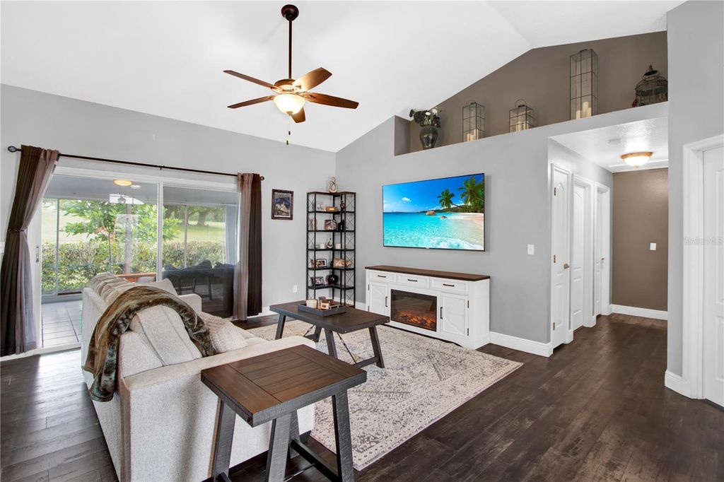 Cul-de-sac location with direct golf course frontage and no rear neighbors, overlooking the 13th green of Green Valley Country Club. This move-in-ready 3-bedroom + office, 2-bath home sits on a spacious .36-acre lot and offers panoramic fairway views, exceptional privacy, and a flexible layout in a standard residential community with a low HOA and optional golf membership. The remodeled kitchen features solid wood cabinetry, granite countertops, soft-close drawers, and brand-new upgraded Samsung stainless steel appliances. Luxury vinyl plank flooring runs throughout the main living areas, with upgraded ceramic tile in both bathrooms. The primary suite includes golf course views, a walk-in closet, and a newly renovated bathroom with dual sinks, a garden tub, and a separate shower. A tiled family room and enclosed Florida room both open to unobstructed golf course views, making indoor-outdoor living easy. Additional features include an irrigation well and full sprinkler system, a quiet cul-de-sac setting, and convenient access to SR-50, Florida's Turnpike, Lake Minneola, shopping, dining, and medical facilities. Approximately 30 minutes from Disney. Golf-front homes in this price range and location are limited, schedule your private showing today.
