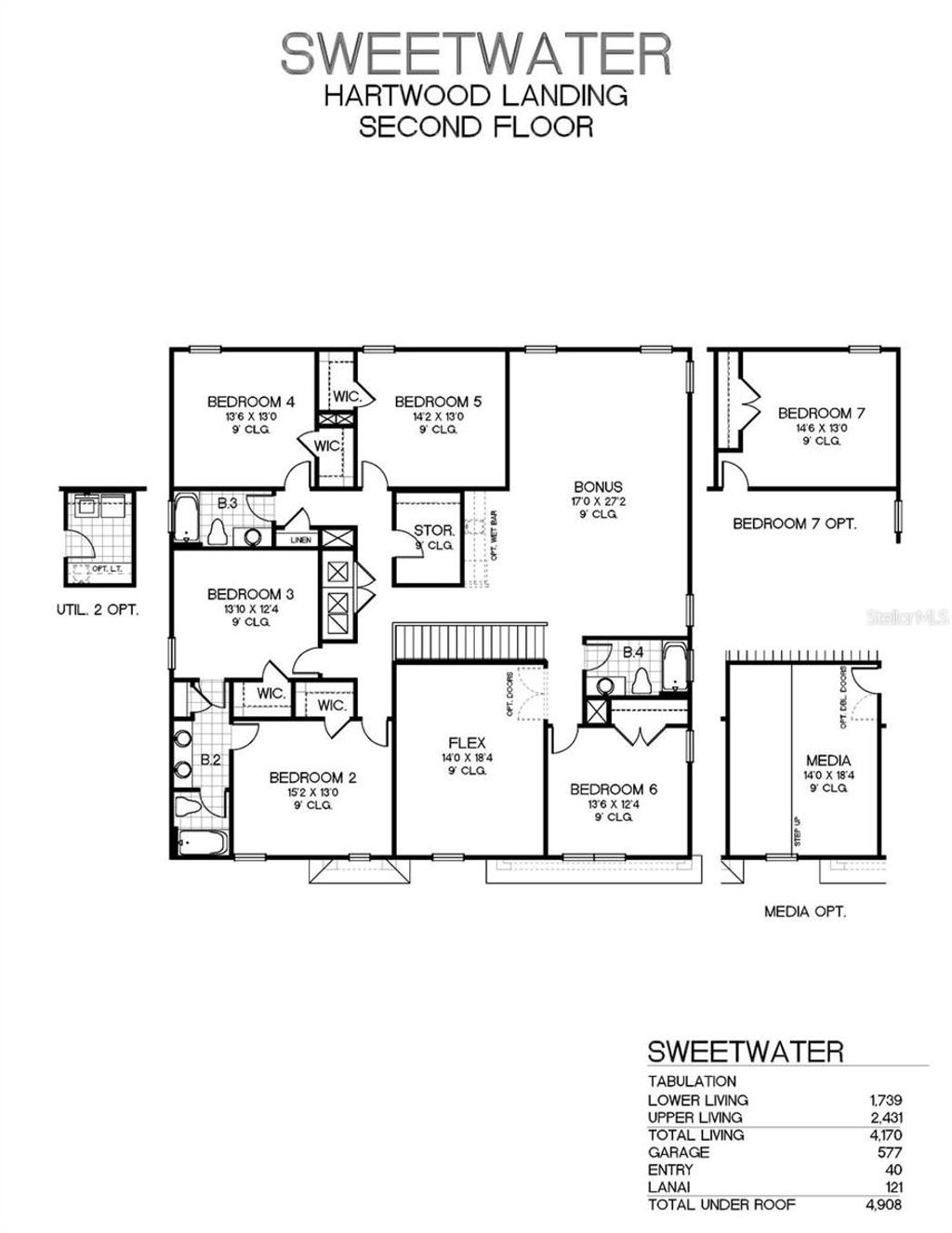 Under Construction. The Sweetwater floorplan offers expansive living with its thoughtfully designed two-story layout. This home features six spacious bedrooms and four and a half bathrooms, perfectly accommodating larger households or guests. With over 4,400 square feet of living space, the Sweetwater includes both a flex room and multiple bonus spaces, offering flexibility for hobbies, workspaces, or entertainment areas. The first floor houses the luxurious owner's suite, complete with dual walk-in closets and a spacious bath, as well as an additional flex room for a home office or creative space. A hobby/work area near the two-car garage further enhances the functionality of the layout. The great room flows seamlessly into the dining area, creating a perfect environment for entertaining, with access to the covered patio for outdoor relaxation. Upstairs, the second floor offers five more bedrooms and additional flex and bonus rooms. This floorplan provides abundant storage, with walk-in closets for most bedrooms, and a convenient second-floor laundry room. Whether you're entertaining guests or enjoying everyday family life, the Sweetwater offers all the space and amenities needed for modern living.