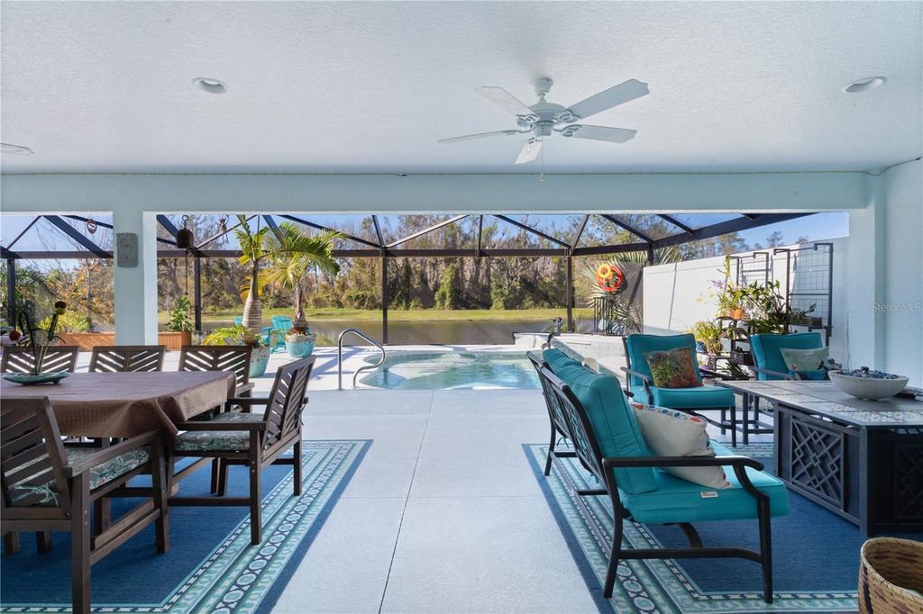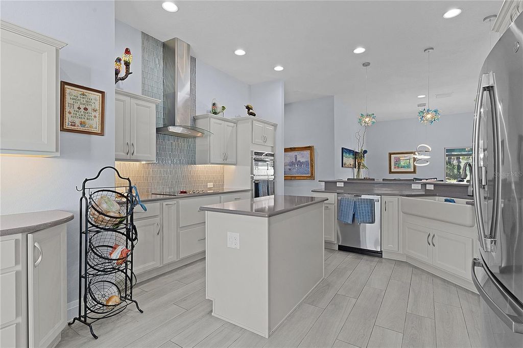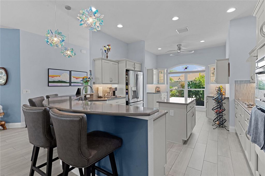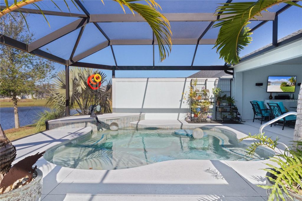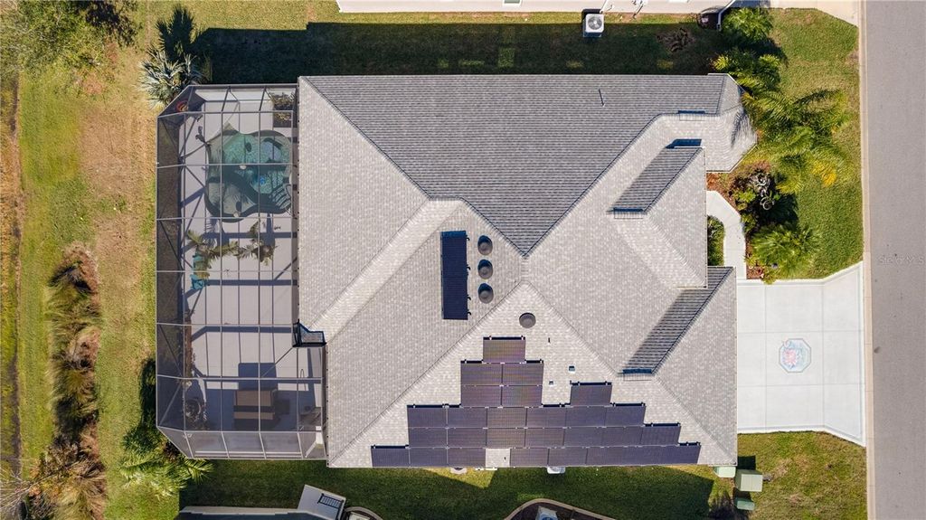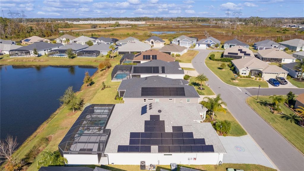 ~WATER VIEW~ ~POOL & SPA HOME~ ~2020 ROOF~ ~GC GARAGE~ ~SOLAR SAVINGS~ ~FURNITURE PACKAGE AVAILABLE SEPARATELY~ This stunning 4/3 WOODSIDE DESIGNER POOL home, nestled in the Village of CHITTY CHATTY, offers a blend of elegance, comfort, and functionality. Its inviting exterior features a PAINTED DRIVEWAY, 2-CAR GARAGE, GOLF CART GARAGE, and a charming courtyard leading to a LEADED GLASS front door with a matching sidelight. Upon entering, your eyes are drawn to the sliding doors in the living room, revealing a spectacular view of the SOLAR HEATED SALTWATER POOL, WATER VIEW and LARGE BIRDCAGE ENCLOSURE"”ideal for relaxation or entertainment. The interior boasts 5-1/2" BASEBOARDS and exquisite PORCELAIN TILE FLOORING throughout, enhancing the seamless flow of space. There is also UPDATED LIGHTING and FANS in each room. The dream kitchen is paradise, featuring QUARTZ countertops, a FARMHOUSE SINK, stainless steel appliances, a TILE BACKSPLASH, under- and over-cabinet lighting, rollout shelves, wall oven, electric cooktop and stylish PENDANT LIGHTING above the spacious BREAKFAST BAR. Additional storage is provided by a central island, a hallway pantry, as well as extra cabinetry in the eat-in area - perfect for all your culinary needs. The primary suite offers a serene retreat with its tray ceiling, ceiling fan, 2 oversized closets, and a luxurious en-suite bath. The en-suite features elegant cabinetry, NEW DOUBLE GLASS SINKS, GRANITE countertops, a tiled ROMAN SHOWER, and a separate commode. Guests will feel at home in the generously sized secondary bedrooms, 2 with a MURPHY BED and the other with ample space and built-in drawers in the customized closet, both conveniently located near the stylish guest bath. A versatile 4th bedroom can serve as an office or hobby space with another full bath with WALK-IN SHOWER just across the hall. Both guest baths have GRANITE countertops. The laundry room includes upper and lower cabinets and a laundry sink for added convenience. Step outside to the expansive 38' x 9' lanai with a birdcage enclosure, covering the pool and HOT TUB. The serene water view enhances the outdoor experience, making it perfect for relaxing afternoons or lively gatherings. The garage also has ATTIC STAIRS for additional storage, a WATER PURIFIER and WATER SOFTENER plus EPOXY floors. The ROOF, HVAC & Hot Water Heater are all 2020. Solar panels also provide monthly savings on your electric bills! The Chitty Chatty Pool is just down the street, and you are conveniently located near Route 44, shopping, dining, and via the CHITTY CHATTY BRIDGE, minutes from LAKE DEATON PLAZA and BROWNWOOD TOWN SQUARE! This home truly embodies luxury living in a prime location.