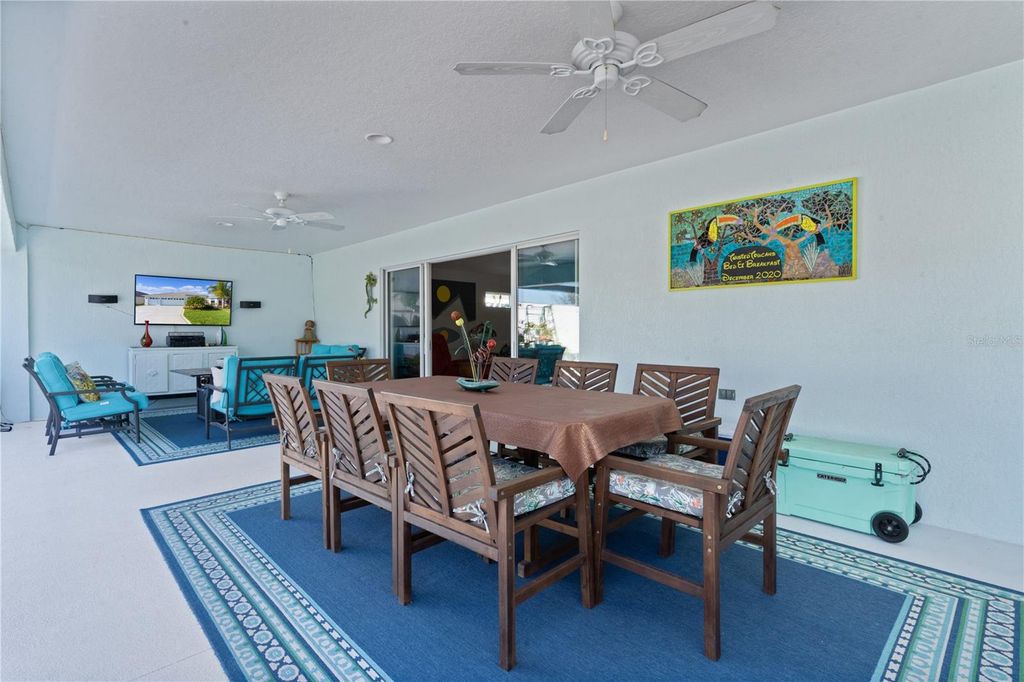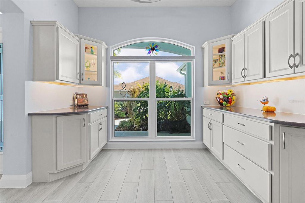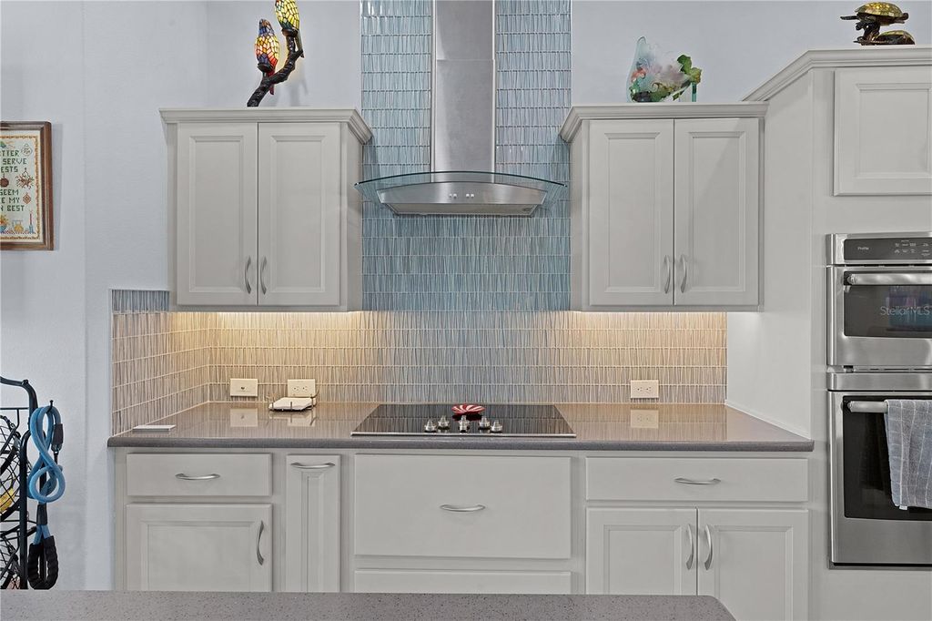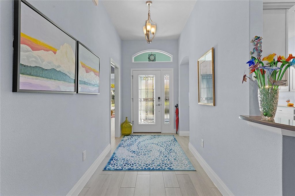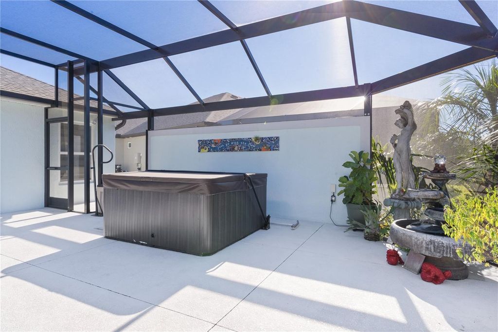 ~WATER VIEW~ ~POOL & SPA HOME~ ~2020 ROOF~ ~GC GARAGE~ ~SOLAR SAVINGS~ ~FURNITURE PACKAGE AVAILABLE SEPARATELY~ This stunning 4/3 WOODSIDE DESIGNER POOL home, nestled in the Village of CHITTY CHATTY, offers a blend of elegance, comfort, and functionality. Its inviting exterior features a PAINTED DRIVEWAY, 2-CAR GARAGE, GOLF CART GARAGE, and a charming courtyard leading to a LEADED GLASS front door with a matching sidelight. Upon entering, your eyes are drawn to the sliding doors in the living room, revealing a spectacular view of the SOLAR HEATED SALTWATER POOL, WATER VIEW and LARGE BIRDCAGE ENCLOSURE"”ideal for relaxation or entertainment. The interior boasts 5-1/2" BASEBOARDS and exquisite PORCELAIN TILE FLOORING throughout, enhancing the seamless flow of space. There is also UPDATED LIGHTING and FANS in each room. The dream kitchen is paradise, featuring QUARTZ countertops, a FARMHOUSE SINK, stainless steel appliances, a TILE BACKSPLASH, under- and over-cabinet lighting, rollout shelves, wall oven, electric cooktop and stylish PENDANT LIGHTING above the spacious BREAKFAST BAR. Additional storage is provided by a central island, a hallway pantry, as well as extra cabinetry in the eat-in area - perfect for all your culinary needs. The primary suite offers a serene retreat with its tray ceiling, ceiling fan, 2 oversized closets, and a luxurious en-suite bath. The en-suite features elegant cabinetry, NEW DOUBLE GLASS SINKS, GRANITE countertops, a tiled ROMAN SHOWER, and a separate commode. Guests will feel at home in the generously sized secondary bedrooms, 2 with a MURPHY BED and the other with ample space and built-in drawers in the customized closet, both conveniently located near the stylish guest bath. A versatile 4th bedroom can serve as an office or hobby space with another full bath with WALK-IN SHOWER just across the hall. Both guest baths have GRANITE countertops. The laundry room includes upper and lower cabinets and a laundry sink for added convenience. Step outside to the expansive 38' x 9' lanai with a birdcage enclosure, covering the pool and HOT TUB. The serene water view enhances the outdoor experience, making it perfect for relaxing afternoons or lively gatherings. The garage also has ATTIC STAIRS for additional storage, a WATER PURIFIER and WATER SOFTENER plus EPOXY floors. The ROOF, HVAC & Hot Water Heater are all 2020. Solar panels also provide monthly savings on your electric bills! The Chitty Chatty Pool is just down the street, and you are conveniently located near Route 44, shopping, dining, and via the CHITTY CHATTY BRIDGE, minutes from LAKE DEATON PLAZA and BROWNWOOD TOWN SQUARE! This home truly embodies luxury living in a prime location.