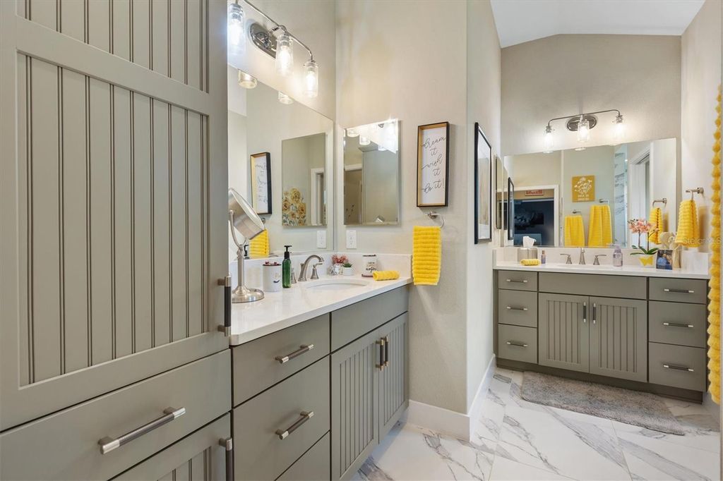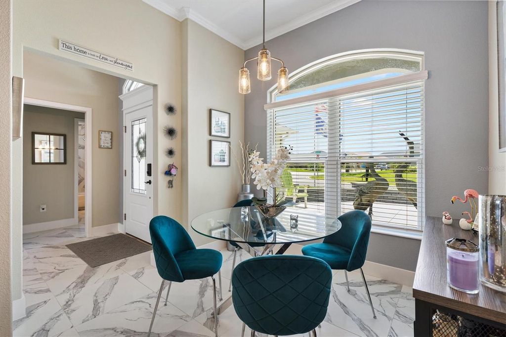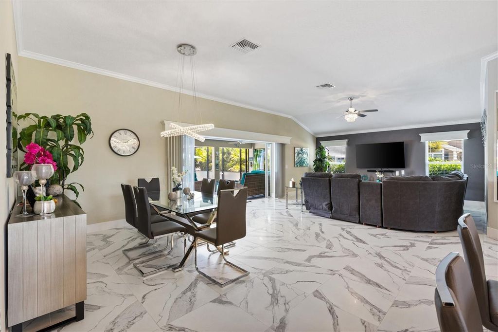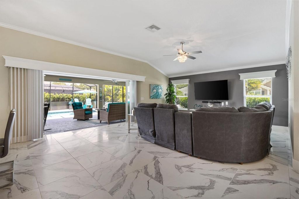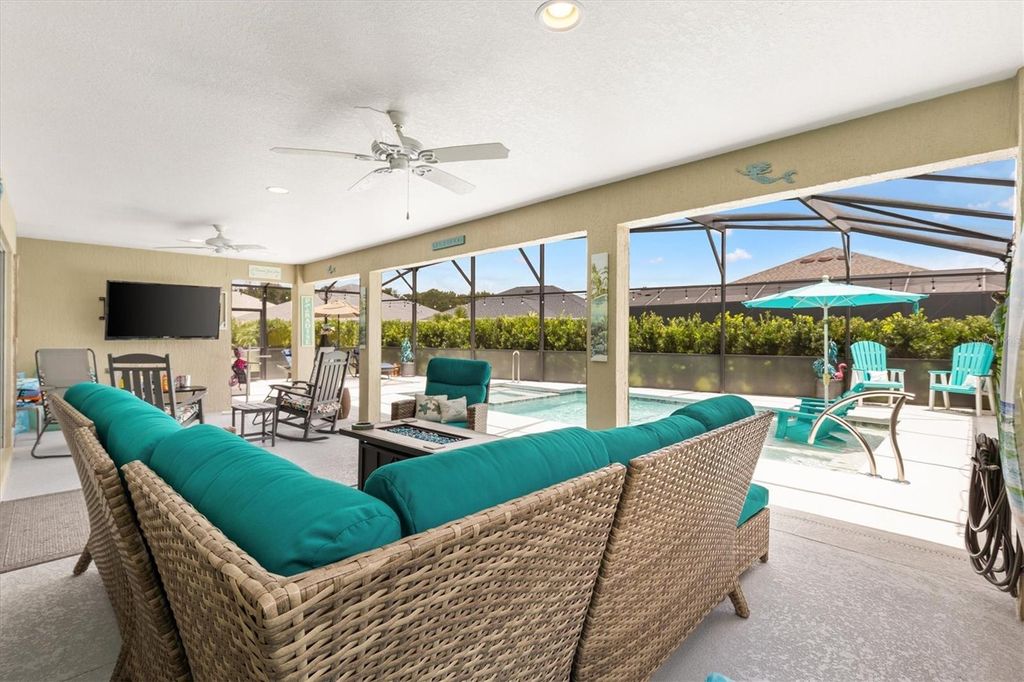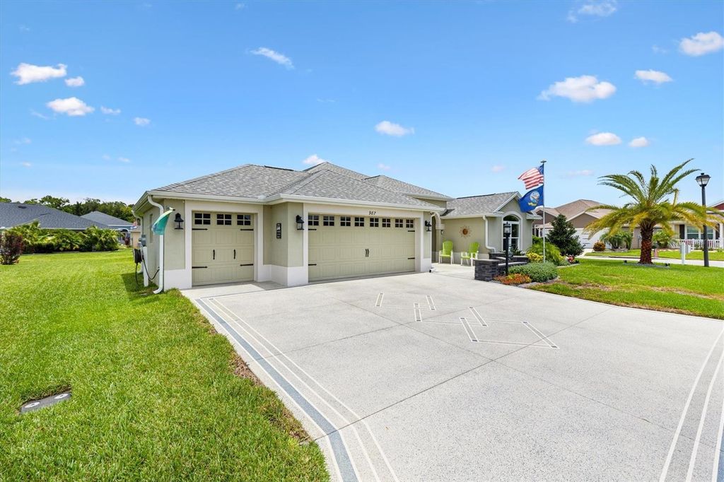 Price Reduction! Welcome to 987 Frederick Terrace, an exquisite Three Bedroom, Two Bathroom, Pool home, built in 2020, with approximately 2060 Square Feet of Living Space, located in the Village of Bradford in The Villages. This beautiful modern Designer Home features a split floor plan, and a spacious and open Living Room/Dining Room, leading to a truly spectacular private Outdoor Oasis. There is an inviting Heated Pool and Spa in this Extended Outdoor Space, with an Enclosed Screened Lanai, surrounded by Lush Tropical Landscaping, making the outdoor living space very private., with relaxing lounge areas, perfect for entertaining family and friends! The Primary Bedroom has a Tray Ceiling, with Two Custom Walk-In Closets, and an En Suite Bathroom with a Tiled Floor, private Toilet Room and a Roman Shower. There is a privacy pocket door leading to the Guest Bedrooms, which share an Upgraded Bathroom with Maple Cabinets, Quartz Counters, Tiled Floor and Tiled Bath/Shower Enclosure. The Kitchen has Custom Stacked Aloe Maple Cabinets, with elegant Quartz Countertops and Tile Backsplash, an Eating Area, Stainless Steel Appliances, and a Pantry Closet. Additional features include Crown Molding, Window Valances, gorgeous Tile Floors, an Indoor Laundry Room, a large Extended Garage and Golf Cart Garage with Epoxy Floors, an attic with pull down stairs, a spacious, beautifully Landscaped Corner Lot on a Quiet Interior Street, Painted Driveway, Low-E Double Pane Windows, Rounded Corner walls, and Smooth Skip Trowel Ceilings. This home is conveniently located near Shopping, Medical Facilities, Village's Entertainment and Restaurants. It is very close to The Bradford Recreation Area, as well as both the Everglades and the Rohan Regional Recreation Centers. There is also the Marsh View Pitch and Putt and the Lowlands Executive Golf Course to practice your golf game!! Come take a look at this wonderful custom home as it will not be on the market for very long!