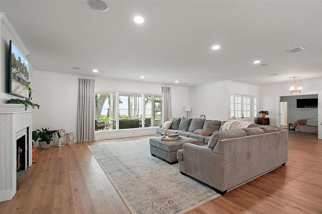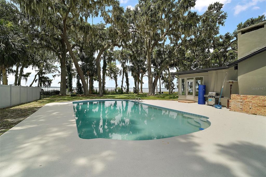 Welcome to this beautifully updated ranch-style lake home nestled on just under an acre, offering the perfect blend of modern comfort and waterfront charm. Located on the sought-after Chain of Lakes, this 3-bedroom, 3.5-bath retreat features an open-concept layout with seamless flow between the kitchen, dining, and living areas ideal for entertaining and everyday living. The heart of the home is the warm and inviting kitchen, thoughtfully outfitted with an expansive 11x4 island, a beautifully Italy crafted Verona electric range, a charming pot filler, built-in wine rack, and a convenient mini fridge. Each bedroom features its own walk-in closet and bathroom. Enjoy breathtaking lake views from the expansive 48x15 Florida room, designed to bring the outdoors in. The primary suite boasts a private en-suite bathroom, a custom California closet, and a spacious office complete with a stunning picture window overlooking the water. Recent upgrades include brand-new Pella windows throughout, grand expanded hallway, new interior and exterior paint, new flooring, new base boards, a new insulated garage door, and a 65x40 freshly poured concrete surrounding the pool. The fully fenced backyard is perfect for pets and entertaining while the cleared beachfront area provides easy access to the lake for swimming or launching your boat. Also this home is equipped with exterior security cameras and built-in music speakers inside and out, perfect for peace of mind and effortless entertaining. This home is the complete package ready with room to enjoy every season lakeside.