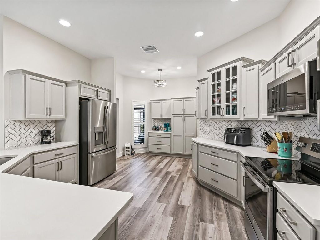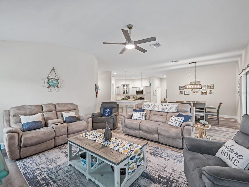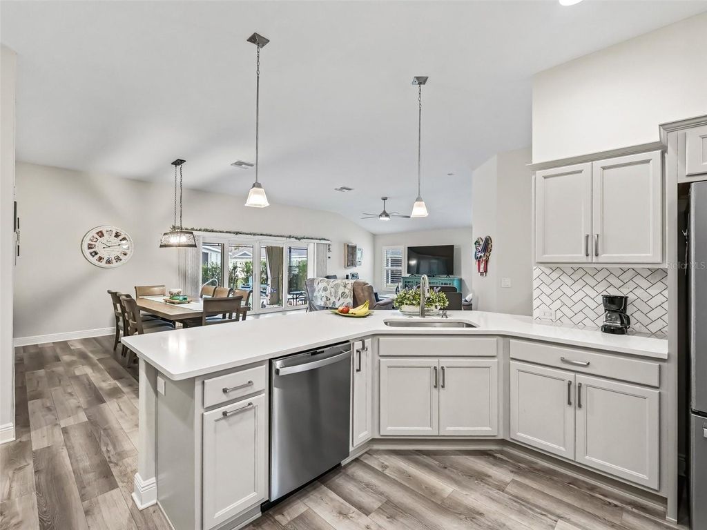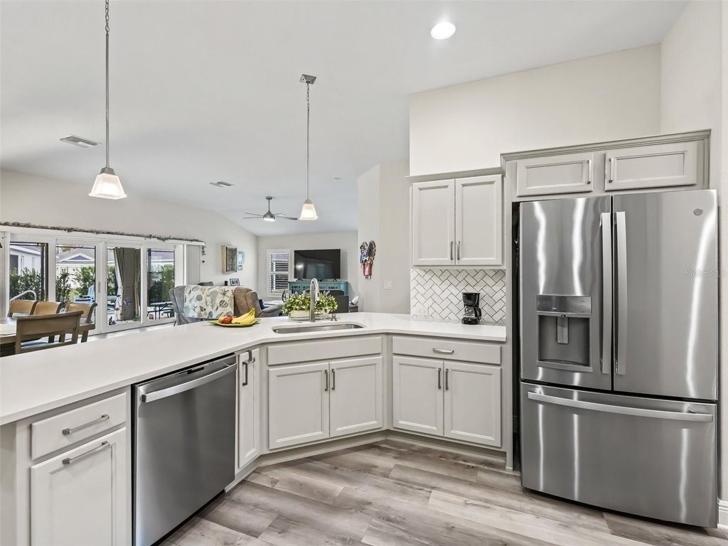 Welcome to this beautifully custom-designed 3-bedroom, 2-bathroom Expanded Begonia POOL Home, located in the desirable Village of Richmond. With over 2,000 square feet of luxurious living space and only 2 1/2 years old, this thoughtfully designed pool home offers both elegance and functionality. As you approach the property you will notice the professional landscaping and custom screened entryway. Step inside to find luxury vinyl plank flooring and plantation shutters on windows. The open floor plan features high ceilings, creating a bright and spacious atmosphere. The heart of the home is the chef's kitchen, featuring extra cabinets, quartz countertops, a stainless steel sink and appliances, and an open layout overlooking the Dining and Living space making it ideal for entertaining. The primary suite is a true retreat, complete with dual walk-in closets, sliders leading to the lanai/pool, and a spa-like bathroom with quartz countertops, dual sinks, a separate water closet, and a Roman Shower. Guests will enjoy the privacy of their own wing, separated by a pocket door, providing a serene and comfortable space. The front bedroom is enhanced by charming bay windows, perfect for a sitting area with streaming natural light. Disappearing sliders off the living area lead to a private outdoor oasis with a lanai measuring 30x8 and an expanded patio area with a sparkling gas-heated saltwater pool, and being under a birdcage makes it perfect for relaxing or hosting gatherings. An expanded 2-car garage (by 4 feet with an 18-foot garage door) with a golf cart garage is epoxy-coated and provides ample storage for vehicles and hobbies. This home truly embodies the luxury and lifestyle of The Villages. Don't miss your opportunity to make it yours! Close to Brownwood Paddock Square, recreation centers, shopping, dining, golf/sports, and easy access in and out of the Villages.