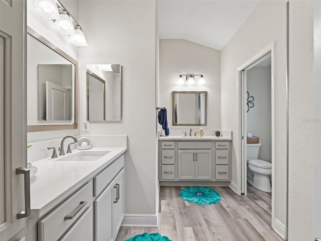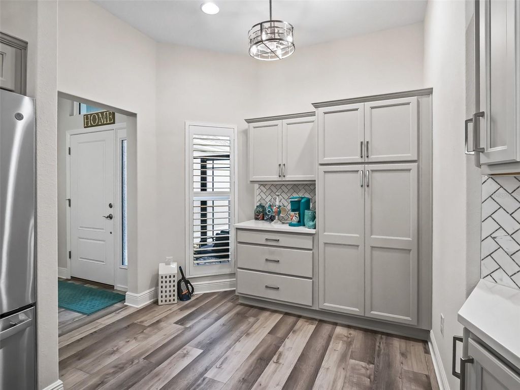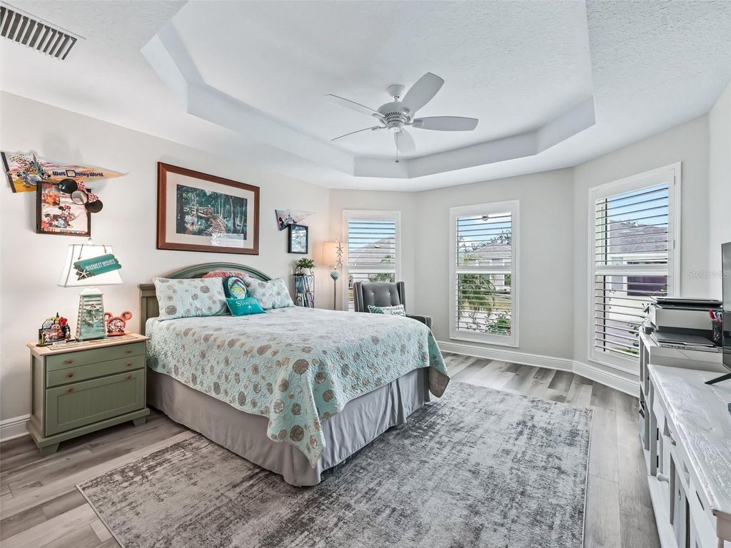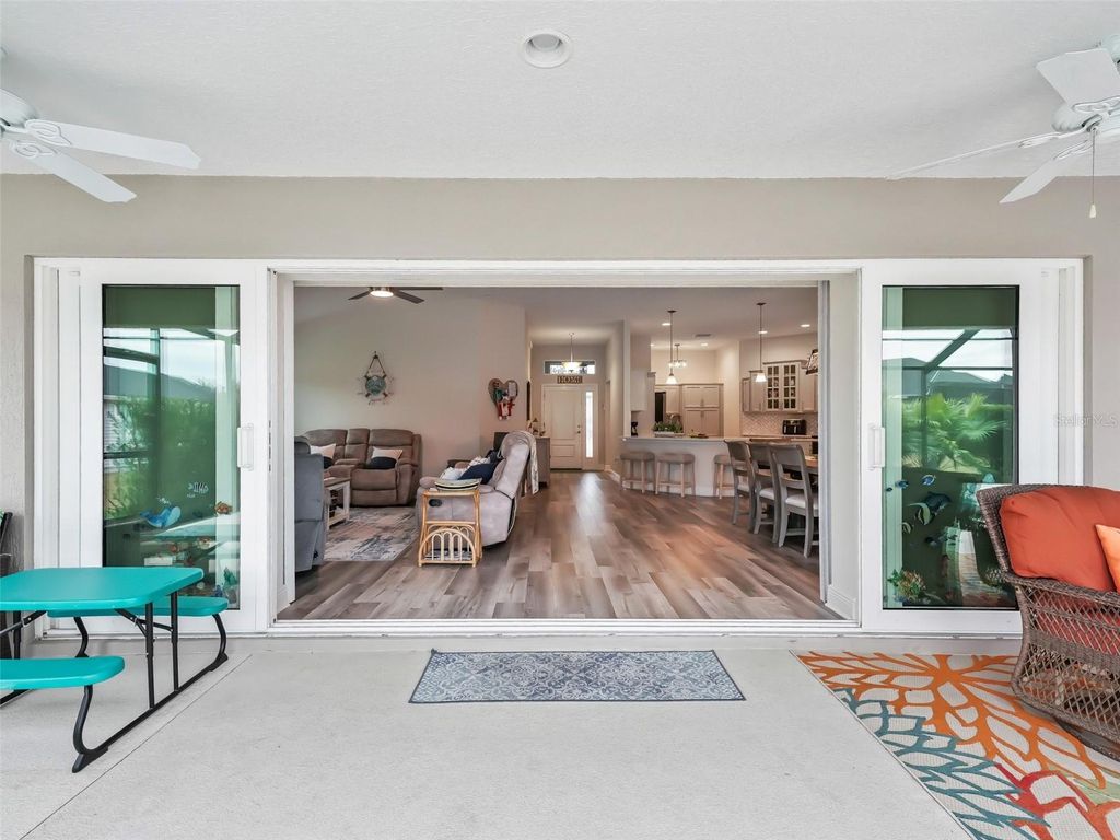 Welcome to this beautifully custom-designed 3-bedroom, 2-bathroom Expanded Begonia POOL Home, located in the desirable Village of Richmond. With over 2,000 square feet of luxurious living space and only 2 1/2 years old, this thoughtfully designed pool home offers both elegance and functionality. As you approach the property you will notice the professional landscaping and custom screened entryway. Step inside to find luxury vinyl plank flooring and plantation shutters on windows. The open floor plan features high ceilings, creating a bright and spacious atmosphere. The heart of the home is the chef's kitchen, featuring extra cabinets, quartz countertops, a stainless steel sink and appliances, and an open layout overlooking the Dining and Living space making it ideal for entertaining. The primary suite is a true retreat, complete with dual walk-in closets, sliders leading to the lanai/pool, and a spa-like bathroom with quartz countertops, dual sinks, a separate water closet, and a Roman Shower. Guests will enjoy the privacy of their own wing, separated by a pocket door, providing a serene and comfortable space. The front bedroom is enhanced by charming bay windows, perfect for a sitting area with streaming natural light. Disappearing sliders off the living area lead to a private outdoor oasis with a lanai measuring 30x8 and an expanded patio area with a sparkling gas-heated saltwater pool, and being under a birdcage makes it perfect for relaxing or hosting gatherings. An expanded 2-car garage (by 4 feet with an 18-foot garage door) with a golf cart garage is epoxy-coated and provides ample storage for vehicles and hobbies. This home truly embodies the luxury and lifestyle of The Villages. Don't miss your opportunity to make it yours! Close to Brownwood Paddock Square, recreation centers, shopping, dining, golf/sports, and easy access in and out of the Villages.
