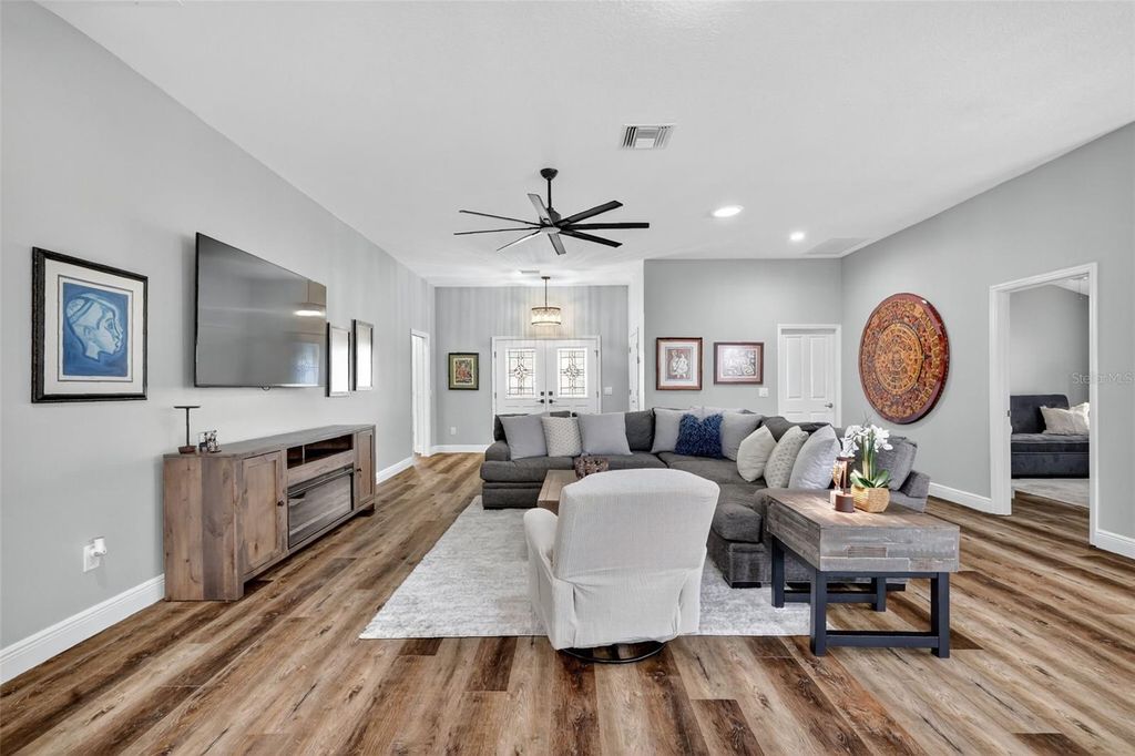 ABSOLUTELY STUNNING, COMPLETELY RENOVATED, 3/2 BLOCK and STUCCO CUSTOM Grand Ficus with REAR WATER VIEWS on a CUL-DE-SAC road in the highly desirable Village of Poinciana! - ONLY MINUTES from BOTH Lake Sumter Landing and Brownwood Paddock Town Squares! LOW BOND! NEW ROOF (2025)! Updated landscaping boasting a grand live oak and a QUAINT front porch welcome you in to this METICULOUSLY-MAINTAINED home! Step inside the ELEGANT leaded-glass DOUBLE ENTRY DOORS into a GENEROUS 12'x8' foyer with a CONVENIENT entry closet. Setting a tone of ELEGANCE throughout the ENTIRE home are PLANTATION SHUTTERS; rich, wood-grain LUXURY VINYL PLANK flooring; OVERSIZED baseboards; and MODERN lighting and fans. The VOLUMINOUS, OPEN CONCEPT floor plan of the living, dining, kitchen, and dinette enhance the GRANDEUR of the main living area. The PHENOMENAL kitchen showcases STAGGERED, WHITE SHAKER cabinetry; QUARTZ countertops; TILE backsplash; BLACK STAINLESS appliances; GAS cooking; BUILT-IN, DOUBLE PANTRY with PULL-OUTS; UNDER CABINET lighting; and a LARGE CENTER ISLAND with WATERFALL QUARTZ top and sides, pop-out outlets, and an EAT-IN breakfast bar. The ADJACENT DINETTE features a BAY window for an ABUNDANCE of natural light. TWO SOLAR TUBES also grace the main living area. From the dining area, step through a LEADED-GLASS French door to the REAR PATIO with WATER VIEWS and PRIVACY landscaping - the perfect spot to relax and enjoy the beautiful Florida weather! Retreat indoors to the LUXURIOUS primary bedroom featuring DOUBLE ENTRY doors, VAULTED ceiling, and a CUSTOM WALK-IN closet. It's en suite bathroom boasts light grey cabinetry with GRANITE tops, DOUBLE sinks, TILED WALK-IN shower with built-in bench, and a LINEN closet. Near the front of the home, a POCKET DOOR separates the second bedroom and bath creating a PRIVATE guest wing. Bedroom two boasts an extended BAY window and a CUSTOM built-in closet. The second bathroom features a dark GRAY vanity with GRANITE top and a TILED tub and shower combination. For added CONVENIENCE, the washer and dryer are located behind bifold doors in the corridor between the second bedroom and bath. Bedroom three is just off of the main living area and offers a VAULTED ceiling, DOUBLE windows, and a built-in closet. Completing the package is a 2-CAR GARAGE with PAINTED floors, a utility sink, additional shelving, and PLENTY of room for parking and storage! DON"T MISS the OPPORTUNITY to make this MAGNIFICENT HOME YOUR OWN! The Village of Poinciana is IDEALLY LOCATED - JUST MINUTES from BOTH Lake Sumter Landing and Brownwood Paddock Town Squares - where you'll have EASY ACCESS to world-class live nightly entertainment, shopping, and dining! Nearby pool and recreation centers include: Poinciana, Allamanda, Hibiscus, and Lake Miona. For golf enthusiasts, Cane Garden Country Club is just a short drive away, featuring a well-equipped pro shop, and 27 holes of challenging championship golf on the Jacaranda, Hibiscus, and Allamanda courses. Nearby CR466 and CR466A also offer an ABUNDANCE of shopping, restaurants, banks, medical and more!. PLEASE WATCH OUR WALKTHROUGH VIDEO of this EXCEPTIONAL HOME in a FABULOUS LOCATION and call today to schedule your Private Showing or Virtual Tour!