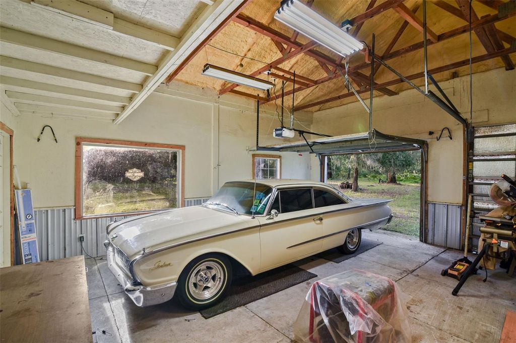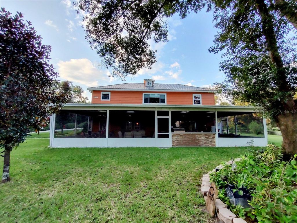 Welcome to 35126 William Lane, a rare 20-acre Eustis estate offering rolling pastures, multiple metal buildings, and a spacious 5,536 sq ft residence designed for privacy and upscale country living. The 4-bedroom, 6.5-bath custom home features a durable metal roof, dual tankless water heaters, a fully renovated kitchen, and a main-floor primary suite. An expansive 46.5' x 24' screened lanai with outdoor kitchen overlooks panoramic pasture views, and a wraparound porch adds classic Southern charm. Additional highlights include an upstairs office, abundant natural light, and generous living spaces ideal for entertaining or multi-generational living. This property includes several high-value outbuildings: a 56' x 28' red-iron metal building with air-conditioned office and full bathroom; a 35' x 48' workshop with car lift and its own bathroom; and a 15' x 30' storage building for equipment. Lifestyle amenities include a free-standing sauna with shower and a treehouse with full bathroom. With 20 fenced acres suitable for equestrian use, agriculture, recreation, or business needs, this estate offers exceptional flexibility. Located minutes from grocery stores, 10 minutes to Downtown Eustis, 15 minutes to Mount Dora, 45 minutes to Orlando, and under an hour to theme parks. This is a rare opportunity to own a multi-use luxury estate in North Lake County.