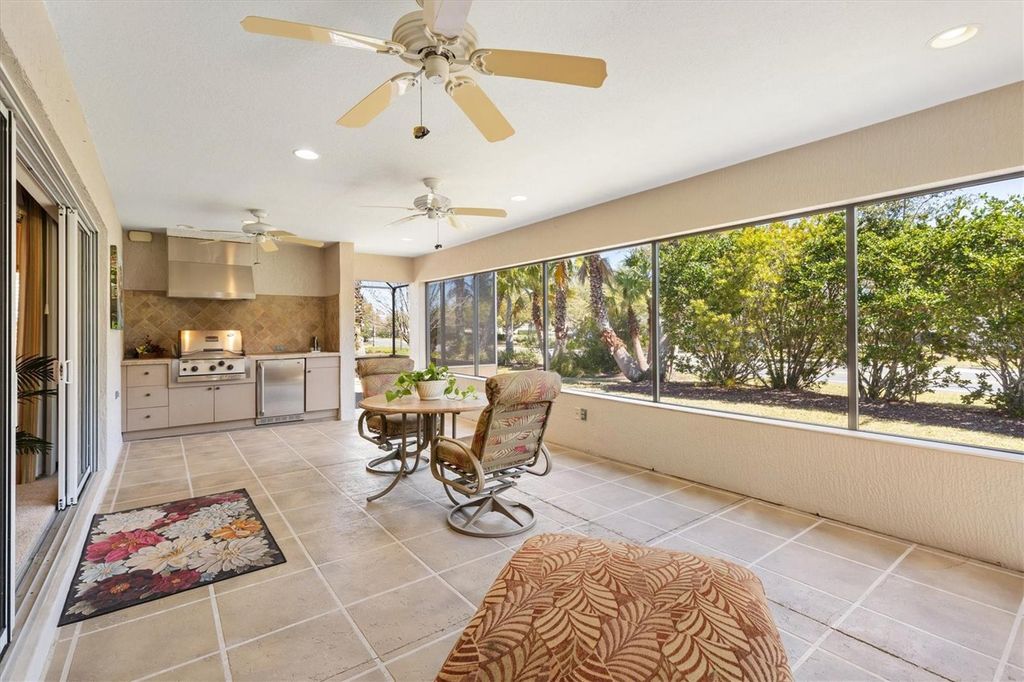 MINUTES TO SUMTER LANDING! This beautifully furnished 3-bedroom, 2-bathroom Gardenia model is nestled on a peaceful cul-de-sac in the Village of Virginia Trace. As you approach, you'll be greeted by a charming covered front porch that invites you into an expansive interior foyer, illuminated by a transom window and glass side panel. The layout is thoughtfully designed with an open and split floor plan, featuring carpet in the living and dining areas, while the wet areas and hallways have tile flooring. The kitchen boasts granite countertops, breakfast bar, and pull-out shelves that seamlessly connects to a cozy dining nook. From the open living and dining room, step out to the covered lanai with an outdoor kitchen and attached birdcage, complete with a hot tub for ultimate relaxation after a day of activities in The Villages. The two carpeted bedrooms off the foyer share a well-appointed bath with a convenient tub-shower combo, making it perfect for guests or family. The carpeted master suite is a true retreat, featuring two large walk-in closets and an ensuite bath equipped with dual split vanities, a vanity make-up table, a linen closet, and a shower with a built-in bench. This bedroom has sliding door access to the lanai for easy outdoor enjoyment. Additional highlights include a gas-wired home, HVAC recently serviced and in excellent working order, a screened and glass front door, a water filtration system, and solar tubes in the kitchen and laundry room, making this home ideal for entertaining and comfortable living. This is a centrally located home between Lake Sumter Landing and Brownwood town centers for dining, entertainment and shopping. With the Sabal Chase Pool and Postal Station a quick golf cart ride from your doorstep, you'll love the convenience and lifestyle this location offers. Watch our video tour and schedule your appointment today to experience all that The Villages has to provide!