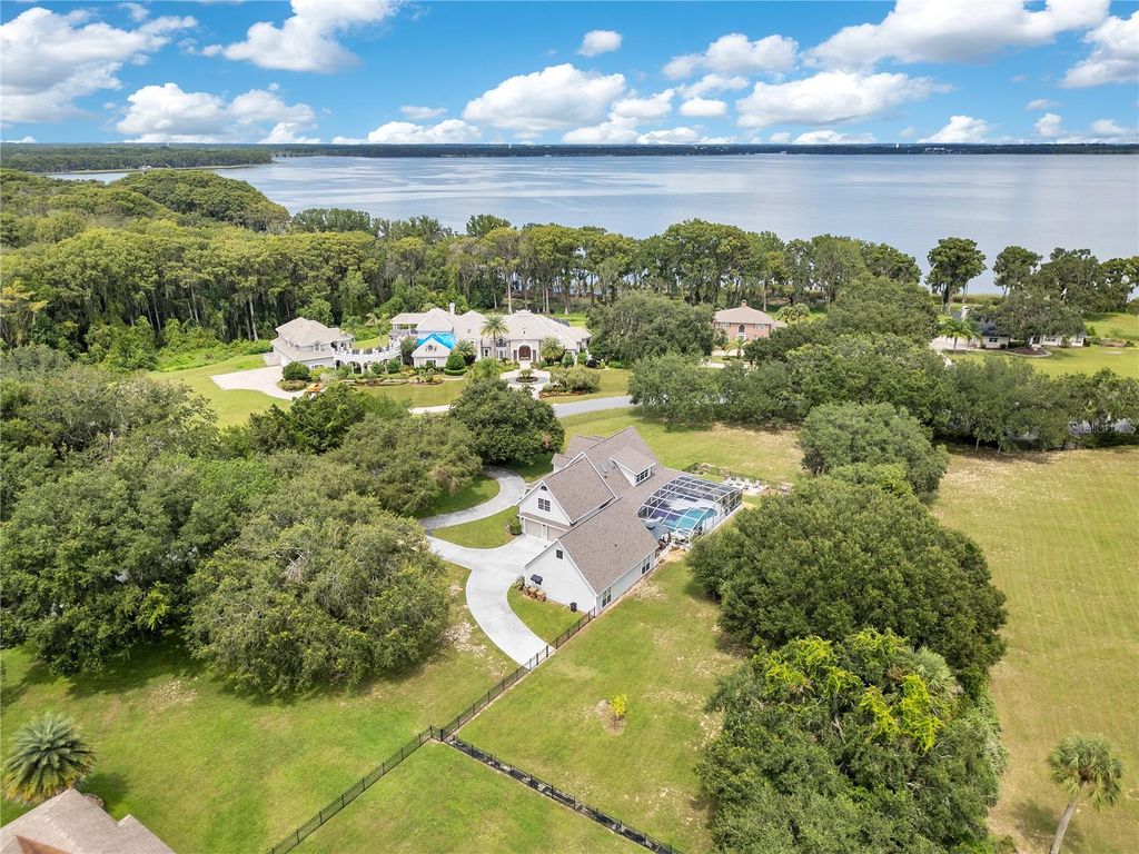 Welcome to 5150 Banana Point, a spectacular custom Southern estate set on 1.318 acres of tranquil privacy beneath a canopy of majestic century-old oaks. Thoughtfully designed and meticulously maintained, this 5-bedroom, 3.5-bath residence offers flexible living with a 22x13 media room"”complete with a closet"”that easily serves as a spacious 6th bedroom. Adding to its appeal, the property features an attached 1,300+ sq. ft. guesthouse, seamlessly blending timeless Southern charm with modern comforts"”an ideal setup for multi-generational living, extended guests, or a private retreat for a nanny or caregiver. The main home showcases solid oak finishes, vaulted ceilings, and a stone propane fireplace with remote control, creating a warm and inviting atmosphere. The gourmet kitchen offers a large island, breakfast nook with a bay window overlooking the pool (with attached salt system), and easy flow into the dining room. The downstairs primary suite features dual vanities, a jetted hydro-massage tub, custom walk-in shower, and oversized closet. Upstairs, you'll find three spacious bedrooms, a full bath, a media room or versatile bonus/game room. Step outside to your private resort-style oasis with a heated, screened pool and spa (recently resurfaced with LED color-changing lights), expansive 47x50 pool enclosure, child safety fence, and a full outdoor kitchen with propane hookup"”perfect for entertaining. The attached guesthouse offers a full kitchen, large bedroom, bath with walk-in shower, soaring 10' ceilings, and direct pool access. This home is loaded with thoughtful upgrades, including: new roof (2023) and cement Hardie siding; two new 50-gallon water heaters (2025); whole-house Generac generator with owned underground propane tank; water softener system and irrigation filtration system (2024); double-pane windows & automatic sprinkler system; vented hurricane/storage room for added peace of mind; three HVAC systems (2 years, 7 years, and original"”recently serviced); home is pre-wired for solar panels; new light fixtures and ceiling fans throughout, and two septic systems and private well. Located just minutes from the Florida Turnpike, with easy access to Orlando, Tampa, and The Villages, this retreat is also only 3.9 miles from The Villages' newest expansion (Middleton, Eastport, and the planned Wellness Village), 20 minutes to historic Mount Dora, and 45 minutes to Orlando International Airport and world-famous theme parks. Blending modern updates with timeless character, this home offers a rare opportunity for private, resort-style living in the heart of Central Florida. Schedule your private showing today.