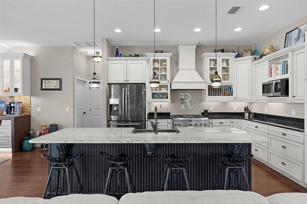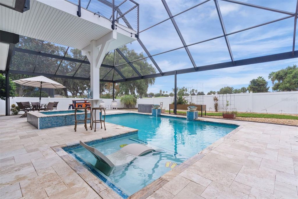 STUNNING GOLF FRONT OASIS WITH RESORT-STYLE OUTDOOR LIVING & UNFORGETTABLE VIEWS! Prepare to fall in love with this Custom "Michelle Boone" one-of-a-kind 4-br + 2 other bonus rooms, pool/spa home that brings the WOW factor from the moment you arrive. A spacious 2,710 sq ft of main living area plus an additional 640 sq ft of fully conditioned bonus space - offering a total of 3,350 sq ft of heated and cooled comfort to enjoy. Stunning golf front oasis with resort-style outdoor living and unforgettable views. Perfectly placed homesite with no rear neighbors, this home backs directly Redfish Run Golf Course in The Villages, offering long panoramic views of golf and water that feel straight out of a painting. If you've dreamed of resort-style living at home"”this is it. The backyard is your private fenced paradise, featuring a sparkling custom-designed pool and spa with sun shelf, and tranquil waterfalls. Exquisite Travertine tile in this expansive lanai. Whether you're hosting a summer bash or enjoying a peaceful solo swim, you'll feel like you're on vacation every day. Three remote controlled roll-down shades add comfort in the rain and extra privacy if needed. You'll never want to leave. Step inside and find a home equally impressive in comfort and elegance. The owner's suite is a showstopper with high ceilings, dual walk-in custom closets, rich tile flooring. The spa-inspired bathroom features dual vanities, a walk-in shower, creating the perfect retreat after a day of fun in the sun....and must -see hidden laundry slide. The spacious open floor plan with natural light that pours through oversized windows, makes every room feel bright and welcoming. The kitchen is designed with both style and function, the 36'" gourmet gas stove(dual-fuel) under custom hood and tall cabinets with under-cabinet lighting, modern appliances, a sunny dining area overlooking the pool. You'll find even more additions like built-in desk area"”ideal for recipes, work-from-home tasks, or organizing the day. In addition to the four spacious bedrooms, there's a 2 versatile den/home office/flex room/guest room on 2nd floor all in conditioned space (split system control). This thoughtful layout offers plenty of flexibility to grow with your needs. Got toys? The 960 sq ft car garage with room for 4 vehicles is a dream come true with plenty of space for vehicles, golf carts, storage, or a workshop. An oversized driveway offers even more parking for guests or gatherings. Notable Upgrades & Features Include: New 2025 HVAC System, Tankless Gas Water Heater "¢ Power Roll-Down Shades (perfect for year-round outdoor living) 2nd floor outdoor (polymer) deck overlooks pool/spa golf and water. Spray foam insulation for home & garage helps immensely with efficiencies. Family Room Fireplace (insert in stone floor to ceiling white stone) for cozy indoor ambiance. Jack & Jill bathroom located in the guest bedroom wing has walk-in shower, 2 sinks all private access directly off bedrooms. Located just minutes from The Villages Charter School, major shopping, dining, entertainment, and medical services, this home gives you the rare balance of peaceful privacy and urban convenience. Whether you're lounging poolside, watching golfers from your lanai, or entertaining under the stars, this home brings together luxury, function, and fun in a way that's hard to find"”If storage and space is your need, this home is a MUST SEE.