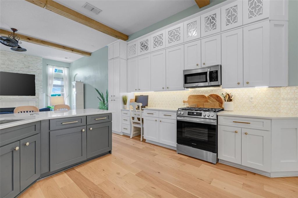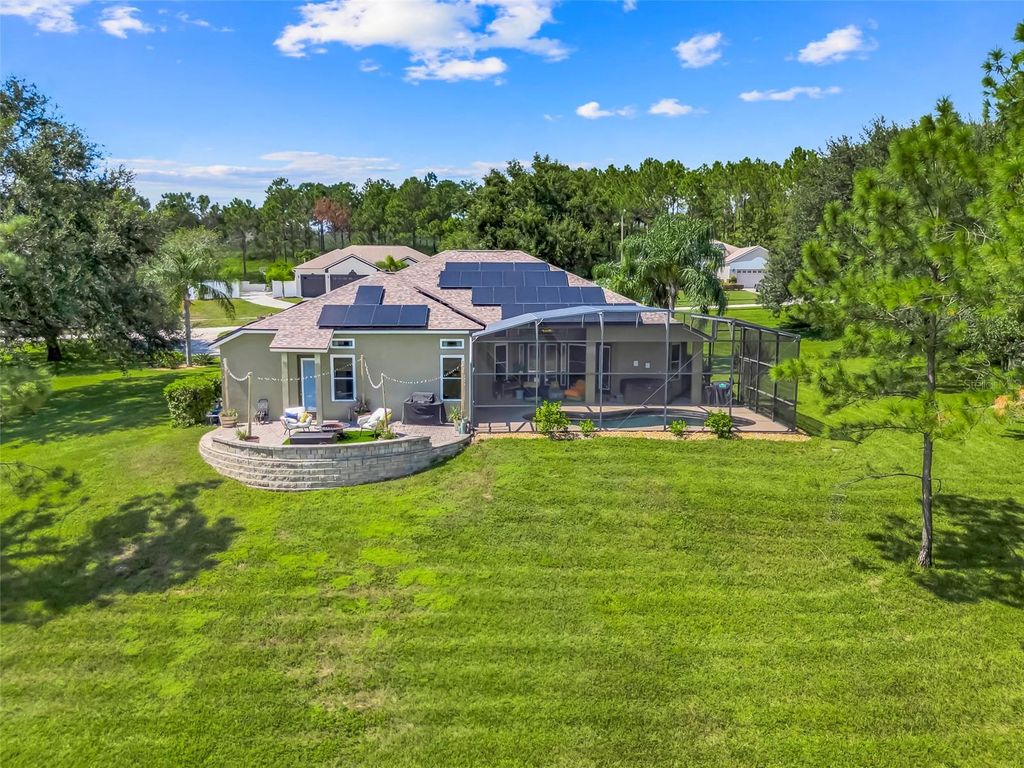 Step inside this beautifully updated residence where every detail has been thoughtfully elevated all within the last five years. Rich real White Oak hardwood floors flow seamlessly throughout the living spaces, accented by bullnose cornering, 5-inch baseboards (without quarter round), and elegant crown molding in the kitchen and living room. The open-concept design draws the eye upward to faux wood beams and soaring ceilings, while a sleek tile accent wall with faux fireplace and mounted TV creates the perfect centerpiece for relaxation or entertaining. The chef's kitchen features newly refaced cabinetry with contrasting white uppers and deep blue base cabinets, a quartzite island with seating for five or more, and a stainless-steel farmhouse-style single-basin sink. Every detail shines"”from the custom upper cabinets for additional storage, to the new stainless-steel appliances, modern backsplash, and upgraded lighting fixtures. Additional enhancements include wainscoting in the formal dining room, all new interior paint, updated door casings and molding, 10-foot exterior doors, and new ceiling fans throughout, including in the pool enclosure. Updated windows ensure energy efficiency, while the addition of a whole-home solar system dramatically reduces electric bills"”from nearly $800 in peak summer months to just around $10 monthly. The home's split floor plan offers privacy, with upgraded guest baths featuring new vanities, tile, and fixtures. The primary suite is a retreat with private pool access, two expansive walk-in closets (one with a custom organizer), and a spa-inspired ensuite featuring dual vanities, makeup station, walk-in shower, soaking tub, linen closet, and water closet. Enjoy year-round Florida living with a Gunite pool, hot tub, freshly repainted pool deck, and an added paver retaining wall with built-in seating overlooking serene Lost Lake"”with no rear neighbors. A screened lanai expands the living space, while the 3-car garage with upgraded screen system creates the perfect spot for projects or game day. The home also boasts a newer roof, newer A/C, and freshly painted exterior, set on just over 1 acre of lush property. Don't miss this rare opportunity to own a move-in ready, fully upgraded home on over an acre with breathtaking lake views. Schedule your private showing today! Please note: Some photos have been digitally enhanced.