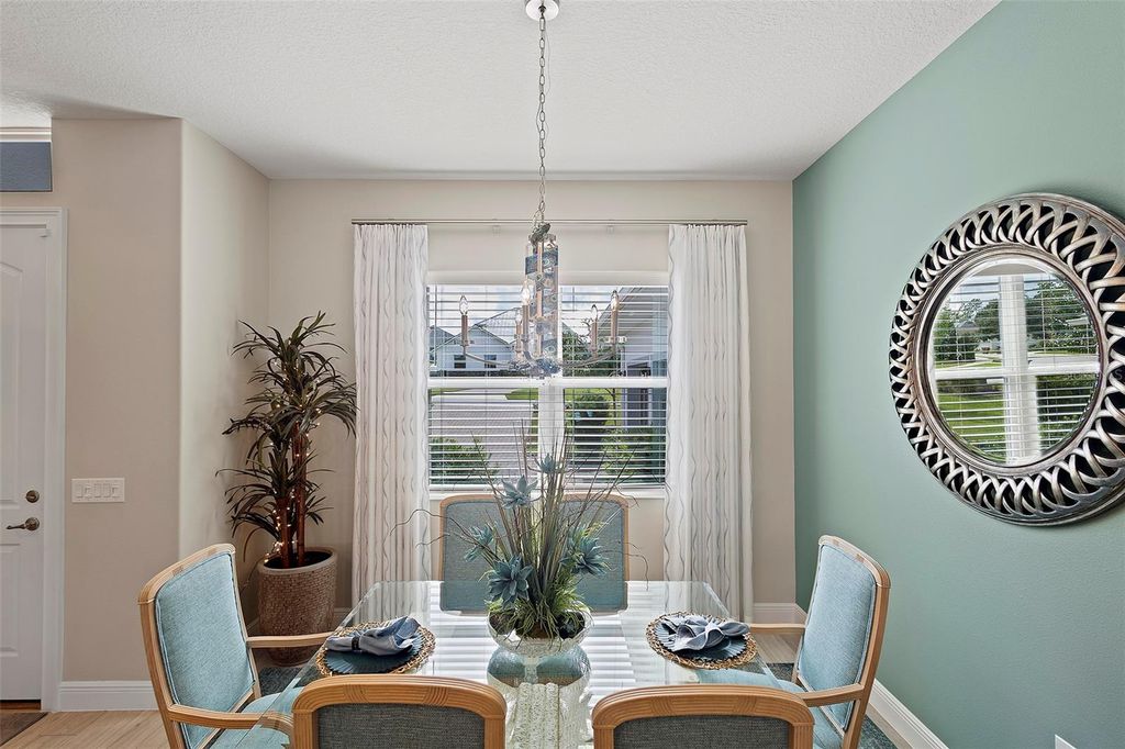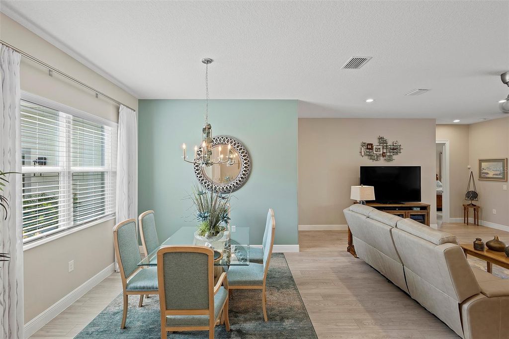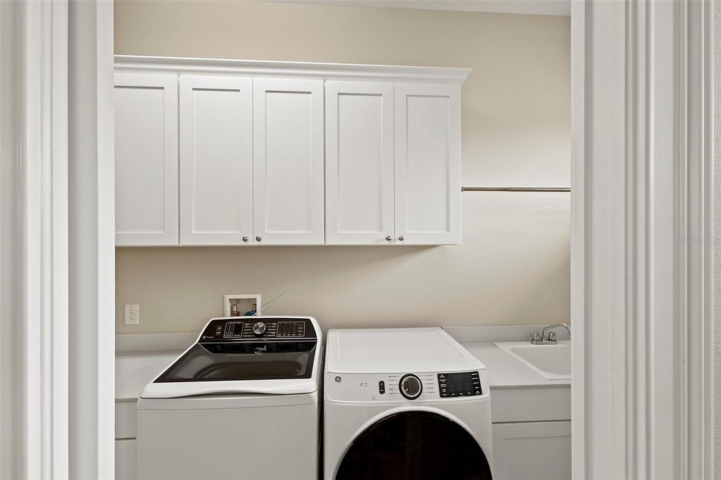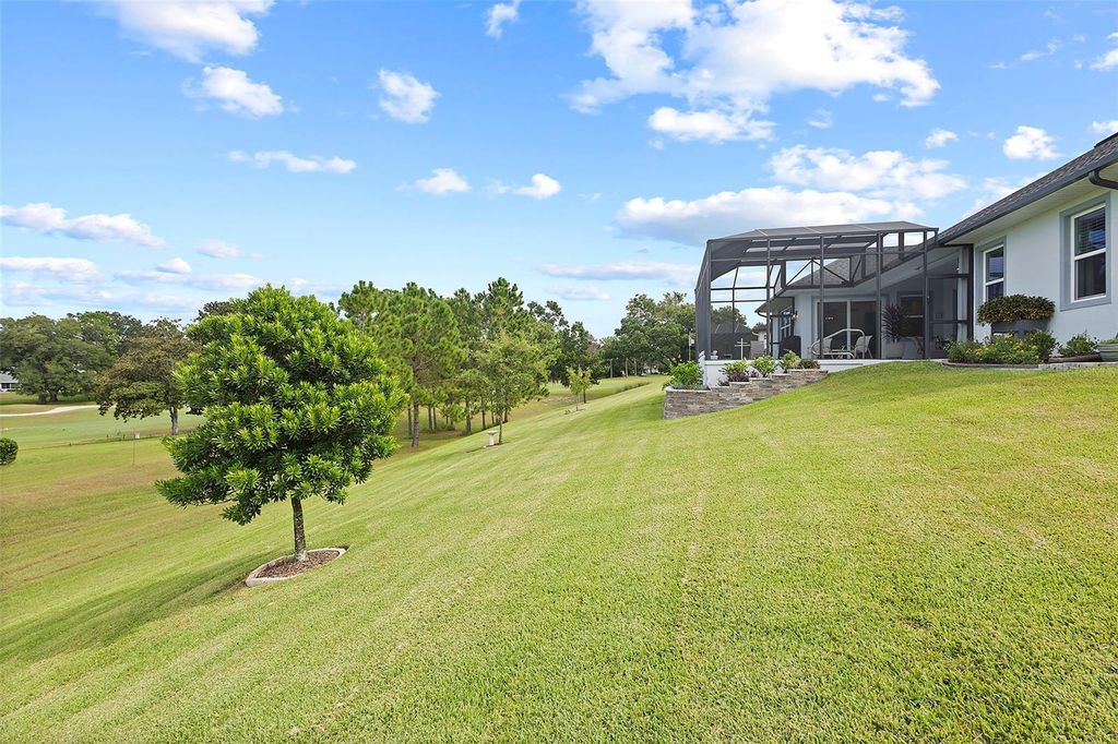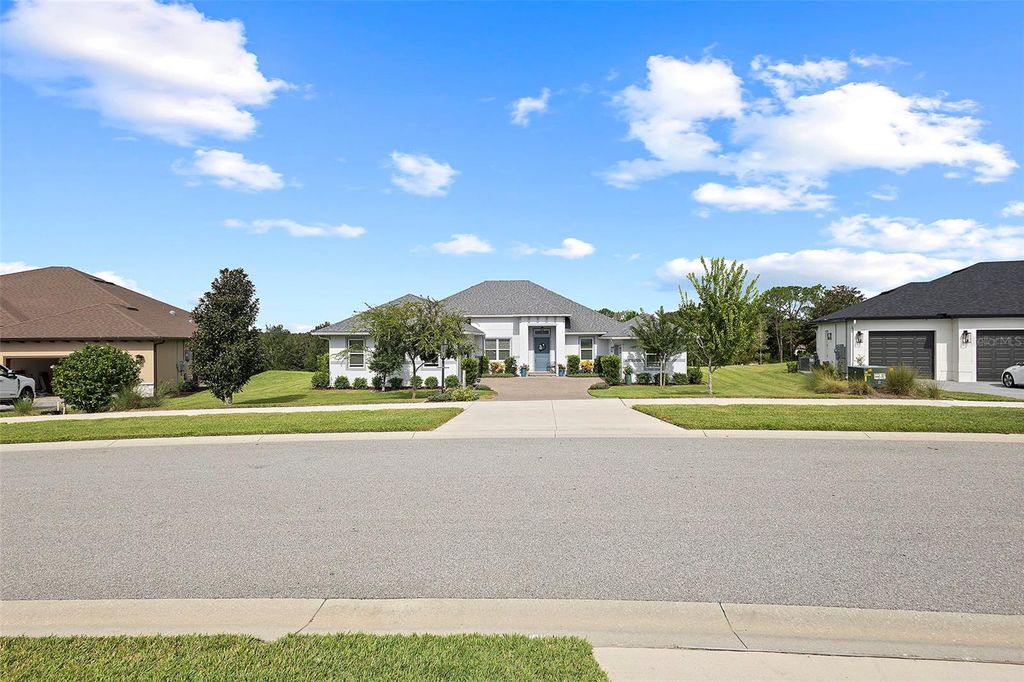 Welcome Home to this beautifully expanded Royal Palm in the Bella Vista section of Harbor Hills Country Club, a truly gated golf community in Lady Lake just minutes to The Villages. Built in 2020, this home offers 2,466 square feet of thoughtfully designed living space and 3,526 total square feet, including a 2-car garage PLUS a expanded golf cart garage with an additional bonus storage room, and no major updates needed. Nestled on an oversized, elevated lot, the property offers panoramic golf course views and serene wooded privacy behind. The backyard is a true retreat, featuring a saltwater inground pool framed by a fully enclosed lanai, with both covered and open areas perfect for relaxing, entertaining, or simply soaking in the tranquil views. Inside, luxury vinyl plank flooring stretches throughout the home in soft, neutral tones, enhancing the light-filled, open layout. Volume ceilings and modern, updated light fixtures add to the bright, airy atmosphere. The kitchen is the heart of the home, anchored by a generous 5x8 island with pull-outs, granite countertops, and soft-close cabinetry illuminated by both upper and lower lighting. A sleek glass black backsplash and built-in beverage refrigerator add style and convenience. Sliding doors from the kitchen open seamlessly to the lanai and pool area, bringing the outdoors in. Pool was installed and professionally serviced by T&D Pools, a local pool company. The primary suite has been expanded for added comfort, featuring his-and-her closets, dual vanities, a soaking garden tub, and a separate shower, with an adjacent laundry room offering built-in cabinetry for additional storage. Guest bedroom 2 includes a pocket door closure for privacy, ideal for guests, and the modern-styled guest bathroom is thoughtfully sized with an oversized vanity and step-in shower surrounded by seamless glass. The 2-car PLUS expanded golf cart garage is side-facing garage is finished with poly epoxy flooring, plenty of storage and includes a Nova whole-house water filtration and softener system. Beyond the home, Harbor Hills Country Club offers an exceptional lifestyle with a championship golf courses, a recreation center for public and private gatherings , tennis, pickleball, and a variety of social and fitness amenities such as a private fully updated and equipped and includes a private sauna. This home combines elegant finishes, functional design, and a serene, active Florida lifestyle, creating the perfect setting for both everyday living and entertaining.