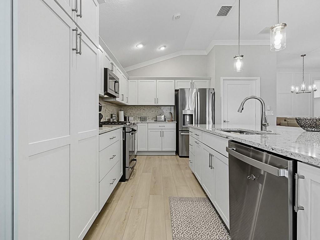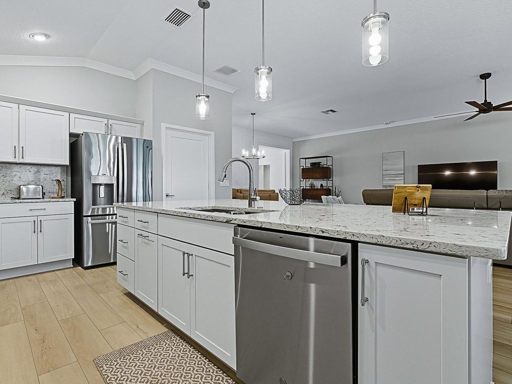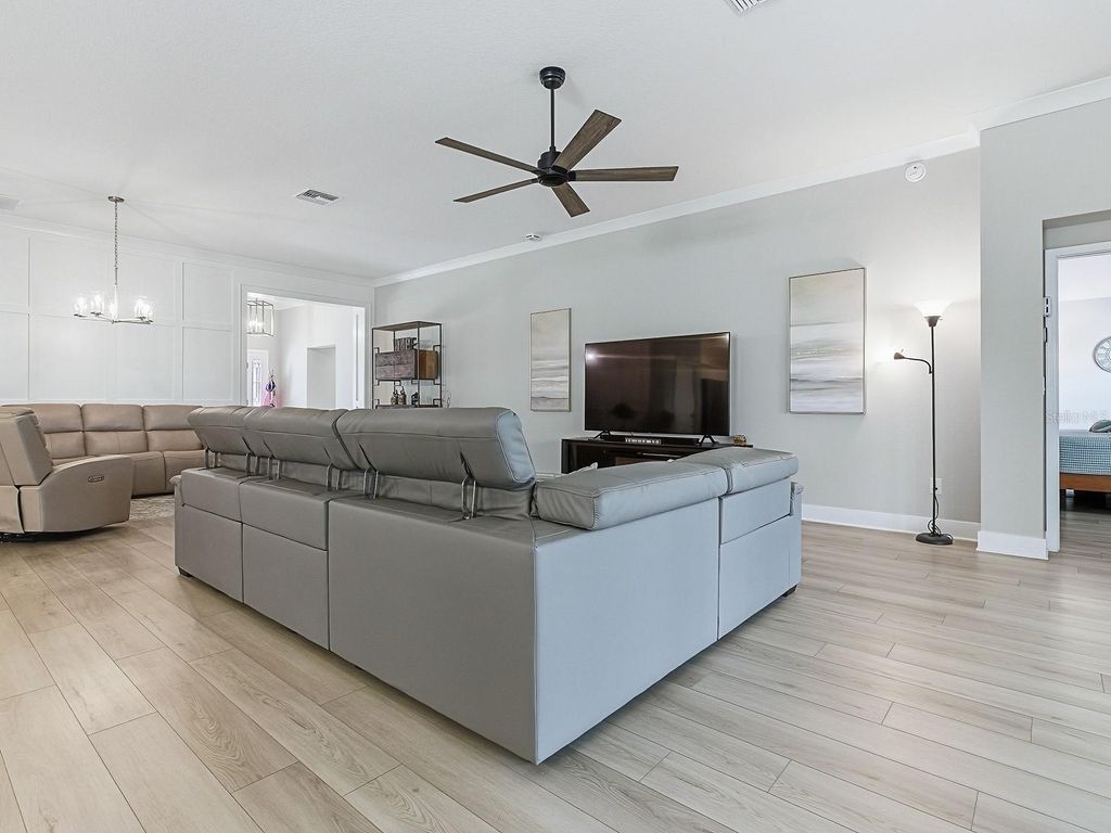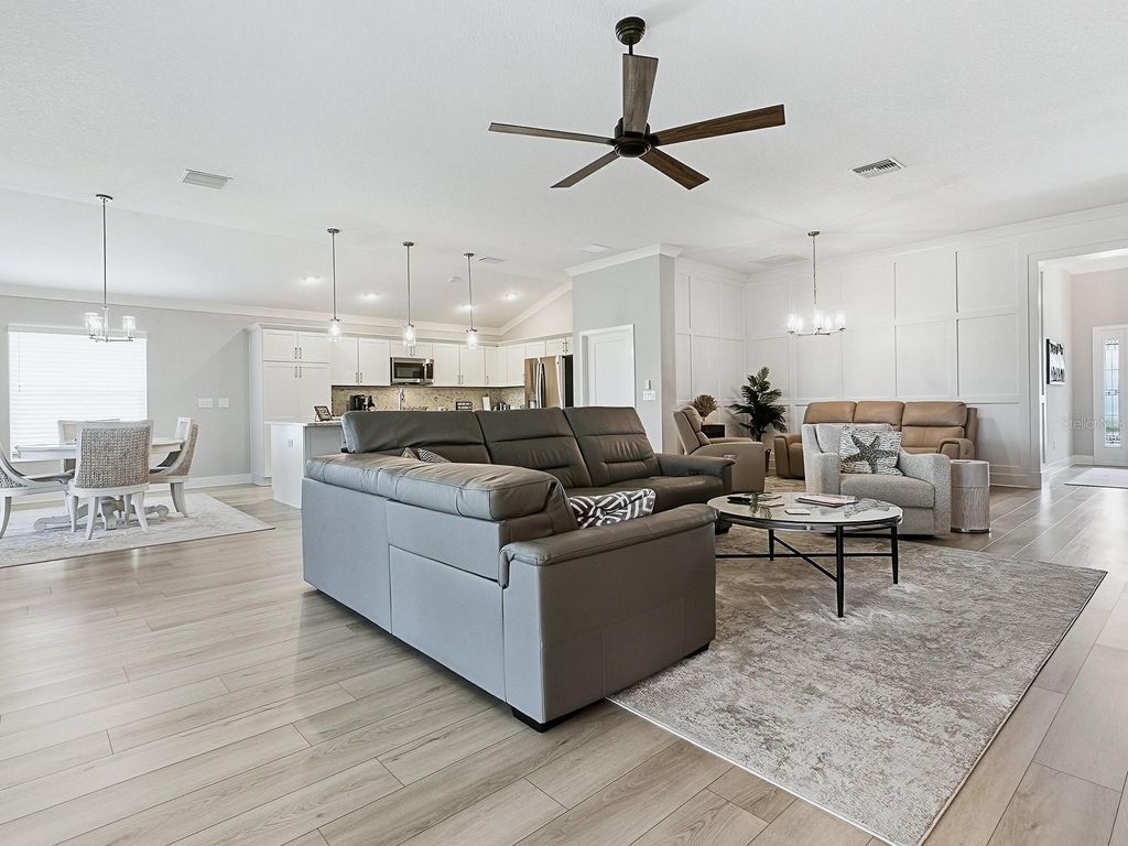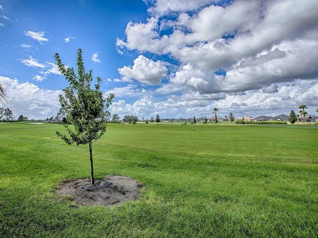Discover your new Jackson Model home at Moultrie Creek Verandas East"”approx. 2335 square feet of Village Luxury situated on the scenic Shallow Creek Golf Course with a motivated seller. This spacious 3-bedroom, 2-bath residence boasts a 2-car garage plus an extended golf cart garage that fits two carts. Enjoy elegant touches like crown molding, kitchen cabinet pull-outs, an Omni Shield safety system, and an oversized lanai with full view glass sliding doors overlooking the 8th hole tee box of the SC Championship course. The backyard offers ample space for a pool (see pool design pics attached) also room for a putting green, or other enhancements, while stacked block landscaping and palm trees create impressive curb appeal. Relax or entertain on the expansive patio and grilling area, both with stunning golf course views. The garage features ceiling rack storage, metal attic stairs, and a floored attic for extra convenience. Inside, the laundry room is equipped with abundant cabinetry, a built-in desk, and a mud sink. Shutters, window treatments, and vertical blinds on the large sliding doors complete the home's polished look. Cook like a pro in the chef's kitchen with its gas stove and gigantic island, and dine in style with the formal dining room's elegant Bead and Batton wooden wall. Located close to Eastport"”the Villages' premier square"”and equally close to Middlebrook square, where you'll have access to more dining and shopping options than ever. There's no need to wait"”this home is move-in ready with quick closing available.