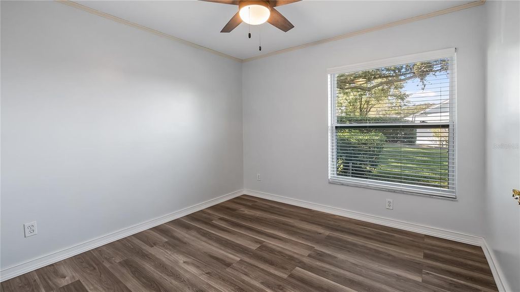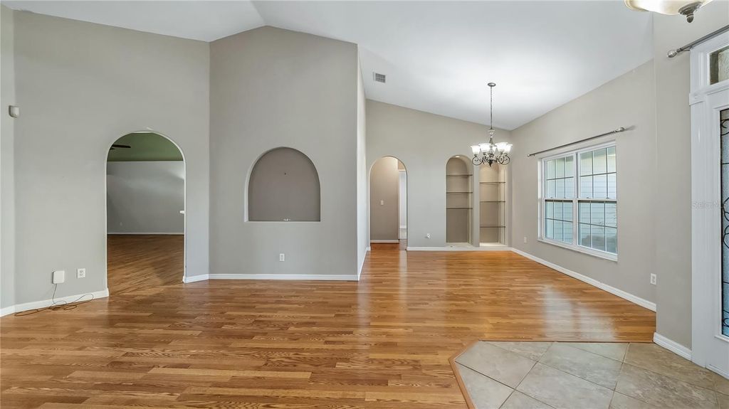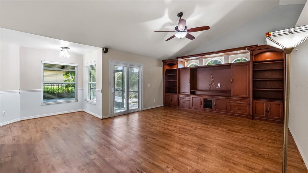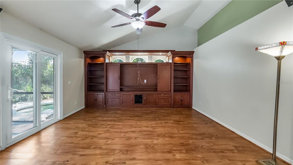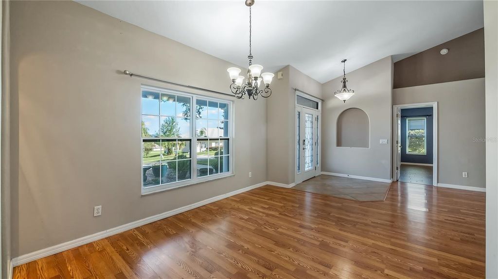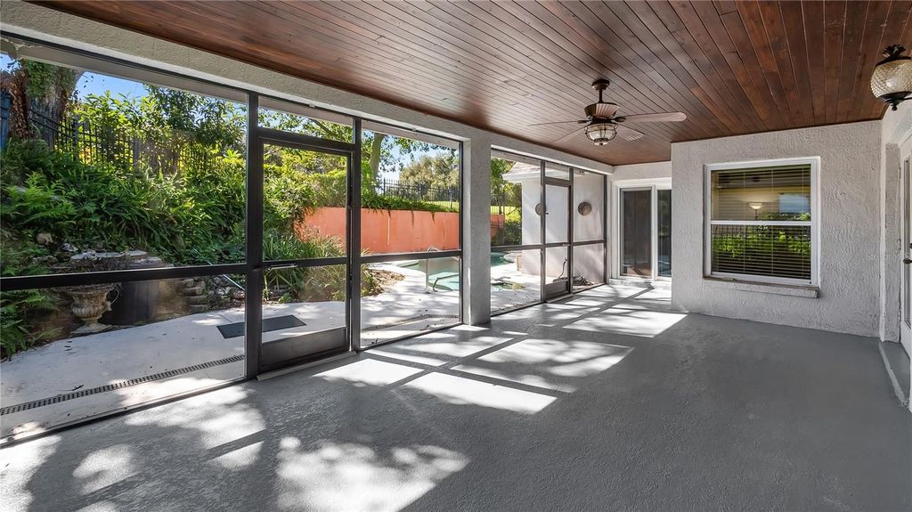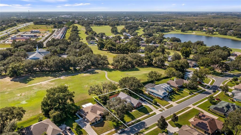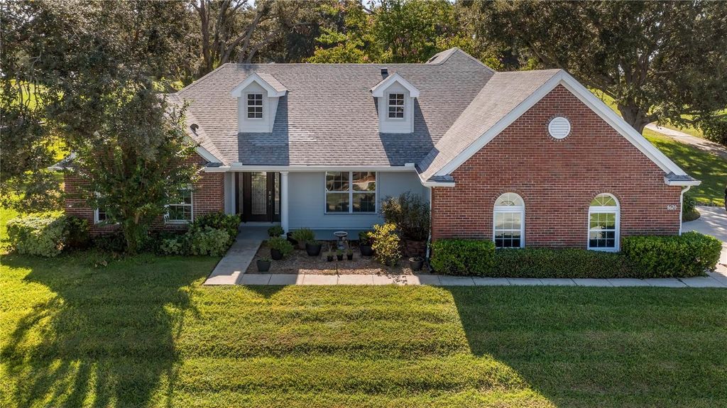 Welcome to your dream retreat in this exceptional golf course community where luxury living meets remarkable affordability! This stunning brick home sits majestically high on a hill, positioned to capture amazing natural breezes while offering captivating views of golfers perfecting their game right from your charming front porch. With an incredibly low HOA of just $150 per year and affordable golf memberships available at several levels, this community offers an unparalleled lifestyle without breaking the bank. This beautifully designed pool home features three spacious bedrooms, two full baths, plus a dedicated office for working from home or pursuing creative endeavors. The thoughtful split bedroom floor plan ensures maximum privacy, with expansive primary suite serving as your personal sanctuary. Go directly from the primary bedroom onto the screened lanai and out to your sparkling pool, creating a seamless indoor-outdoor flow that's ideal for starting your mornings with a refreshing swim or ending evenings under the stars. The primary bath features dual sinks for busy mornings, a luxurious garden tub ideal for long relaxing soaks, and a separate shower. Soaring vaulted ceilings throughout the home create an impressive sense of space and elegance, while abundant natural light fills every corner. The heart of this home is the spectacular kitchen, boasting tons of cabinet space for all your culinary tools solid surface counters that provide style and durability. The open layout allows you to overlook the inviting family room while preparing meals, making it easy to stay connected with loved ones. The family room showcases a newer custom-built entertainment center complete with shelving, a dedicated space for speakers and even a clever pullout drawer designed specifically for your record player, letting you enjoy your treasured vinyl collection in style. French doors with built-in blinds lead from the family room to the screened lanai, where you can relax in comfort while enjoying your private backyard oasis. Fire up the grill for weekend barbecues, host unforgettable gatherings with friends and family, then cool off with a refreshing dip in your pool. The screened enclosure ensures you can enjoy outdoor living year-round. For more formal occasions, the home offers a gracious living room and a dining room with attractive built-in shelving, ideal for displaying treasured collections or hosting elegant dinner parties. The convenient side entry garage adds practicality and curb appeal to this impressive brick home. Roof 2016 and new windows in 2017! This is more than just a house, it's a lifestyle opportunity in a fabulous community where neighbors become friends and every day feels like a vacation. Don't miss your chance to own this exceptional property.