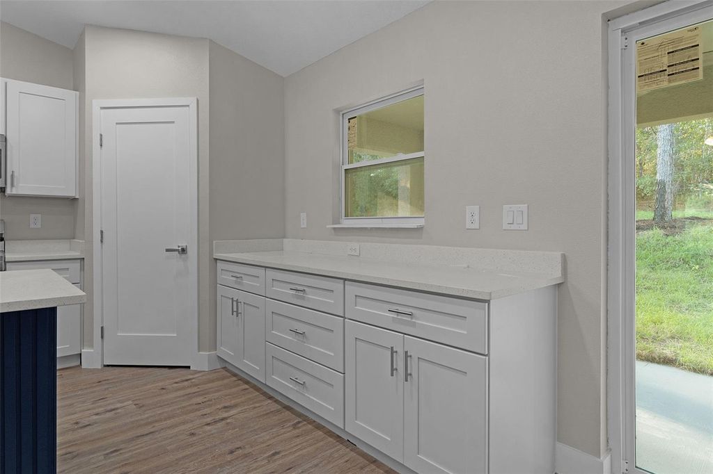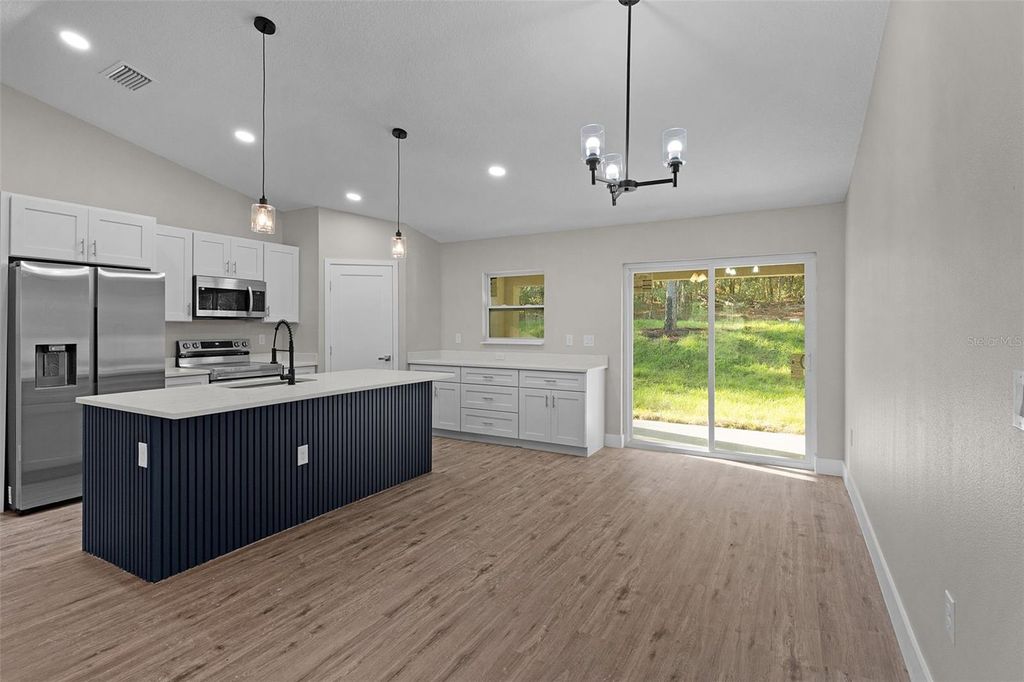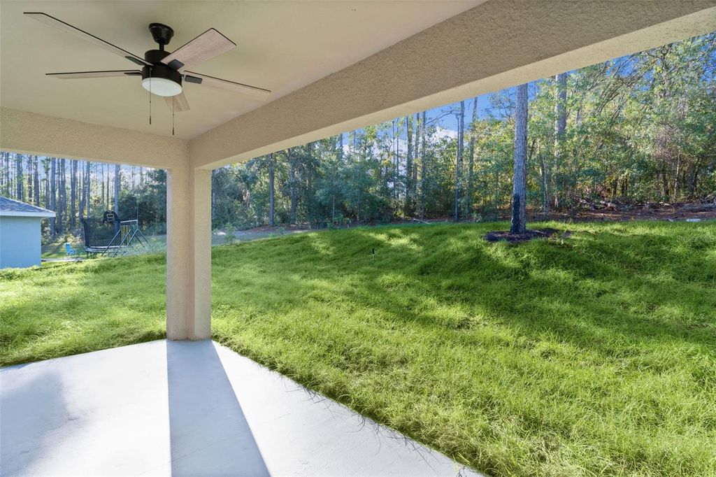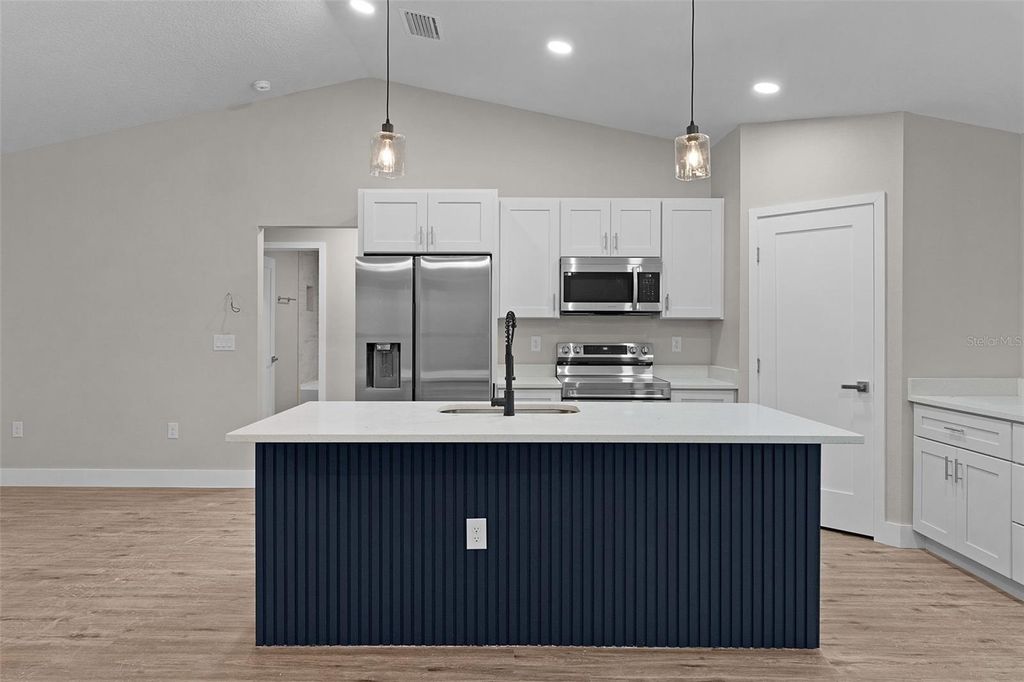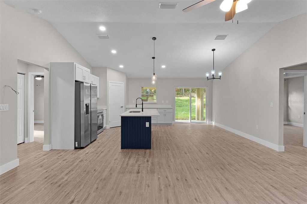 This beautiful MOVE-IN READY new construction home has all the features and finishes you're looking for in an affordable quality home. Come take a look at the large OPEN CONCEPT entertaining area featuring VAULTED CEILINGS, where the living/dining/kitchen areas combine. Notice the Luxury Vinyl throughout, ceiling fans in all the bedrooms, living room, and COVERED REAR LANAI, and QUARTZ COUNTERTOP in the kitchen and baths. The kitchen is equipped with Samsung stainless steel appliances, and a WALK-IN CORNER PANTRY. With it's SPLIT BEDROOM floor plan, the primary bedroom is through a doorway on the right side of the living area, and features a TRAY CEILING, WALK-IN CLOSET, and ENSUITE BATHROOM. This bathroom has DUAL SINKS, a SUNKEN TILED SHOWER, and a SEPARATE TOILET ROOM. The indoor laundry occupies the space between the primary bedroom door and the door to the garage. Moving to the other side of the house, you will find 2 bedrooms of a good size, with the guest bathroom between them. Access to the lanai and back yard is through the sliding doors located on the back wall of the home in the dining area. Call today to schedule a showing on this home, and you'll want to make it yours!
