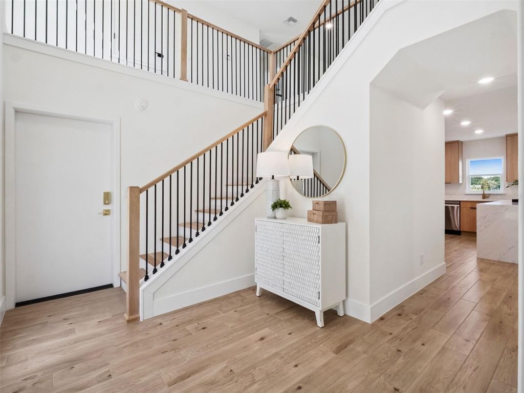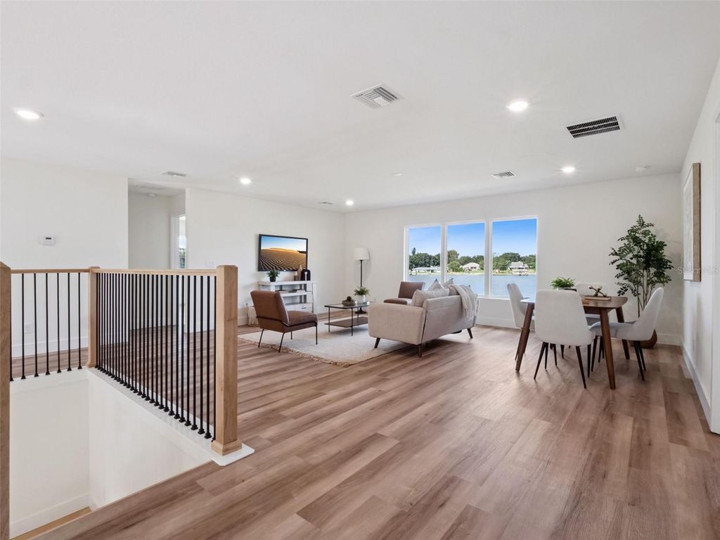 Discover the completely renovated lakefront lifestyle awaiting you at this beautiful 4 bedroom, 3 bathroom home on Autumn Ln in Clermont. From the moment you approach, the residence presents a captivating two-story exterior and a driveway running parallel to the water, where a private dock extends into the serene lake, offering stunning views and tranquil access for waterfront enjoyment, particularly beautiful at sunset. Step inside to find an interior bathed in natural light, featuring a modern, open-concept design and beautiful wood-look flooring that flows throughout the main living areas. The welcoming entryway sets a stylish tone with a contemporary staircase featuring light wood banisters and sleek black metal balusters, complemented by a chic white console and a circular mirror. The heart of the home is a seamless flow from the living room to the dining area, all enjoying spectacular lake views through expansive sliding glass doors. The living space is cozy and bright, perfect for relaxing while taking in the water scenery. The gourmet kitchen is a chef's delight, boasting ample light wood cabinetry, white quartz countertops, stainless steel appliances, and a large peninsula with a waterfall edge, providing plenty of prep space and a casual dining area, all while overlooking the lake through a window above the sink. Upstairs, the bedrooms continue the modern aesthetic with great natural light and peaceful views, including the primary bedroom which features a fantastic lake view, a contemporary ceiling fan, and a neutral color palette for a restful retreat. The luxurious bathrooms are fully updated, featuring modern vanities and high-end tile work, most notably a spacious walk-in shower with a glass enclosure and stunning scalloped marble-look tile, finished with contemporary matte black fixtures. This home is a perfect blend of modern luxury and idyllic lakefront living.