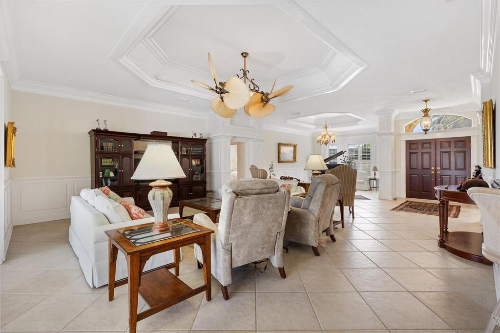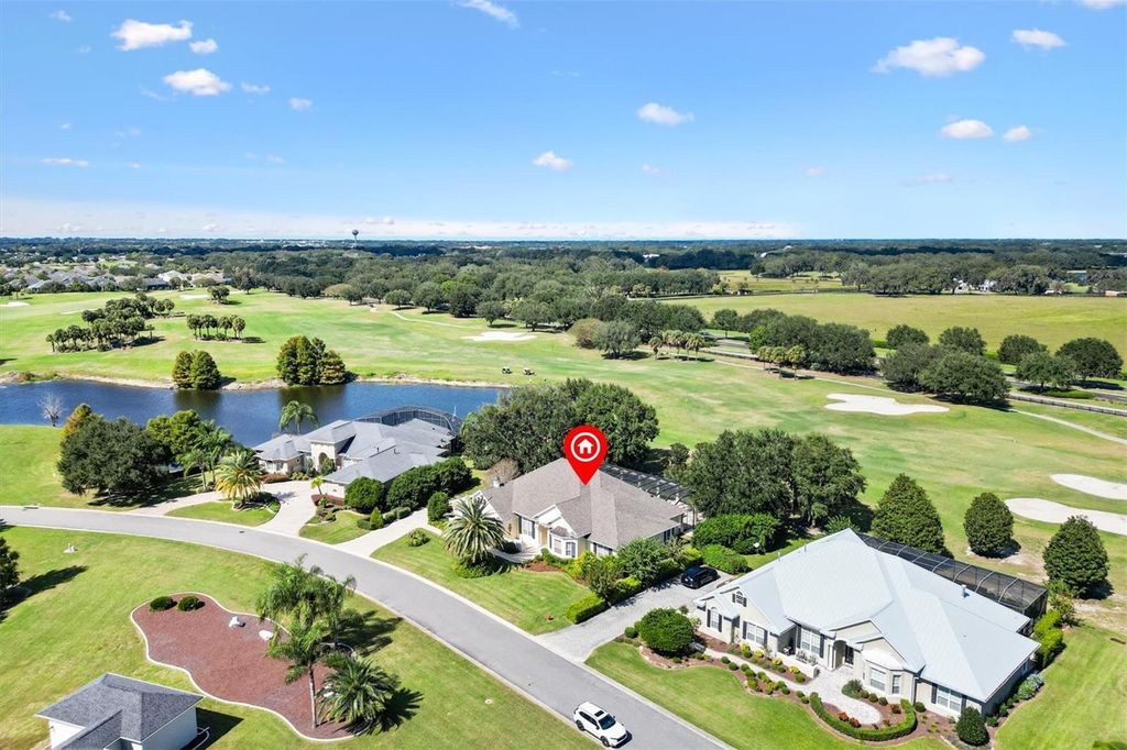 Premier Sanibel Estate in Bridgeport at Lake Sumter Landing Welcome to this exquisite Sanibel model "” a True Premier residence offering over 3,000 square feet of refined living space in the highly desirable Bridgeport at Lake Sumter Landing. This stunning three-bedroom, three-bath home combines timeless elegance with modern comfort, creating the perfect setting for both relaxation and entertainment. New Roof 2022, Air Conditioner 2021, Hot Water Heater 2024 Step inside to discover an open, light-filled floor plan showcasing rich crown molding in living room, dining room, den,and primary suite, custom door and window casings, as well as hardwood and designer tile flooring throughout. The chef's dream kitchen is a true culinary masterpiece, featuring a Wolf gas cooktop with copper pot filler and handcrafted cherry wood hood, a custom built-in Sub-Zero refrigerator, double Wolf wall ovens, and a built-in drawer microwave. The hammered copper farmhouse sink, granite countertops with double waterfall edges, custom cabinetry and custom kitchen island complete this breathtaking space "” truly a chef's delight. The expansive great room flows seamlessly to the outdoor living area, where you'll find a sparkling pool, fully equipped summer kitchen, and a huge covered lanai designed for year-round enjoyment. Whether hosting guests or enjoying quiet evenings, you'll love the sweeping golf course and tranquil pond views that make this home a true sanctuary. Each of the three bedrooms offers comfort and privacy, each with it's own bath (one pool planned). The luxurious primary suite features a beautiful tray ceiling with molding, French doors opening to the lanai and pool, hardwood flooring, generous walk-in closet, and a spa-like retreat with a soaking tub, walk in shower, and separate water closet. Located just a short golf cart ride from the Arnold Palmer Championship Country Club and Golf Course as well as Lake Sumter Landing, you'll enjoy quick access to dining, boutique shopping, grocery stores, medical offices, and all the conveniences The Villages has to offer. This is more than a home "” it's a lifestyle of luxury, comfort, and sophistication in one of the most sought-after locations in The Villages. Make an appointment for your private showing today, before it is gone!! (Most furniture available separately)