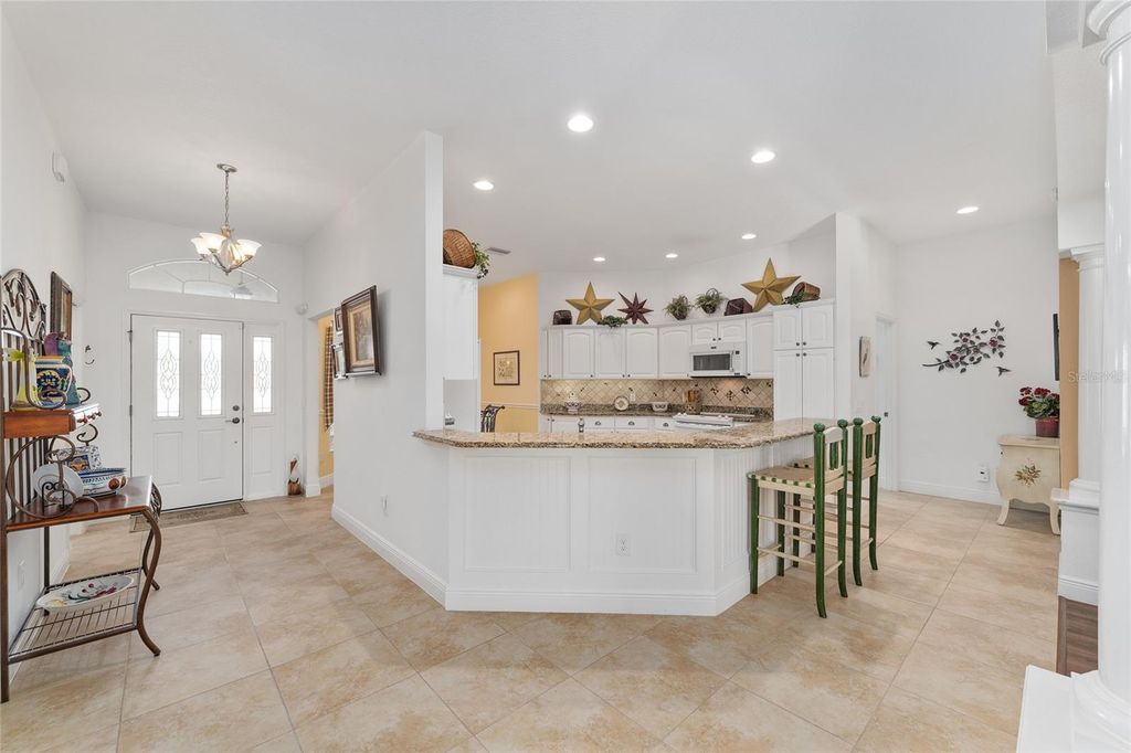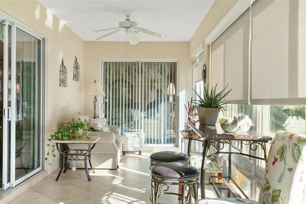 REDUCED BY MOTIVATED SELLER! BRIGHT, SUNNY AND READY FOR QUICK CLOSE! This former MODEL HOME with GREAT FEATURES & UPGRADES is ideally located in the Village of Buttonwood, between Lake Sumter Landing and Brownwood Paddock Square. The BEGONIA model is BLOCK & STUCCO construction with a NEW ROOF installed in 2025. The UPGRADED KITCHEN offers tile floors, GRANITE countertops, upgraded white cabinetry, roll out shelves, white appliances and a breakfast nook with chair rail outfitted with table and chairs. Wall art and the decorative items above the upper cabinets can remain with the home. The kitchen is open to the dining and living areas, offering ease in entertaining or every day living. These areas have LVP Flooring, HIGH CEILINGS, plenty of natural light and access to GLASS ENCLOSED LANAI. The DINING ROOM is furnished with an EXTENDABLE DINING TABLE, 8 CHAIRS and DOUBLE LIGHTED HUTCH. The LIVING ROOM will include WALL UNIT, TELEVISION and tables. (Sofas do not convey). The SPLIT BEDROOM PLAN has the GUEST WING at the front of the home. It includes two bedrooms with CEILING FANS. The front guest room is PARTIALLY FURNISHED with END TABLES, COFFEE TABLE, TELEVISION & SECRETARY CABINET, while the second guest room is furnished with QUEEN BED, LINENS and NIGHT STANDS. A POCKET DOOR offers added privacy to this area. The PRIMARY SUITE with ceiling fan, includes DOUBLE WALK IN CLOSETS and EN SUITE BATH with DOUBLE SINKS and WALK IN SHOWER. All furnishigs in the primary bedroom are being removed before closing and room is conveyed empty. The GLASS ENCLOSED LANAI has two ceiling fans, solar shades, insulated ceiling, tile floors, partial furnishings and offers great additional living space and access to the back yard and grill area. INSIDE LAUNDRY has upgraded washer & dryer, deep sink, storage and offers access to the TWO CAR PLUS GOLF CART GARAGE with EPOXY FLOOR, PULL DOWN ATTIC ACCESS, WHOLE HOUSE NOVA WALTER FILTRATION SYSTEM and FREESTANDING SHELVING. Located very near many grocery, dining, shopping, banking and medical options at Lake Sumter Landing, on CR 466A corridor and at Brownwood Square. Enjoy free entertainment (weather permitting) nightly at Lake Sumter Landing and Brownwood Square! From this home, you can easily access both of these squares and many rec centers, pools golf courses and other activities by golf cart!