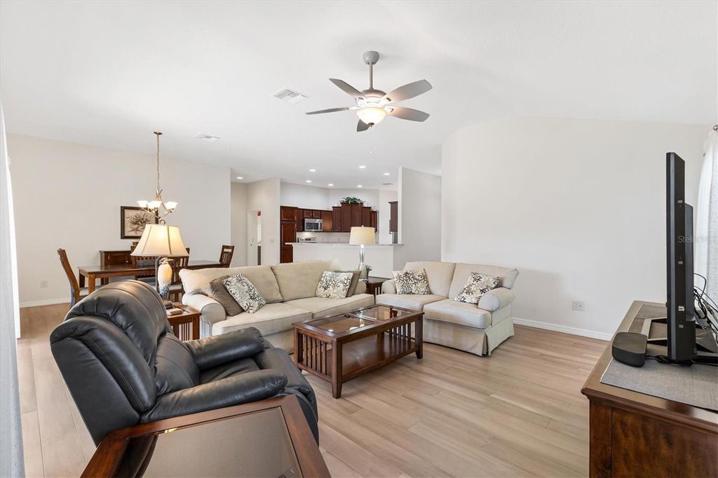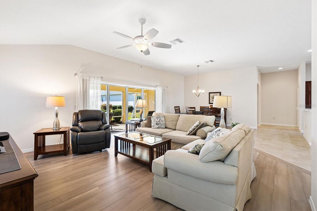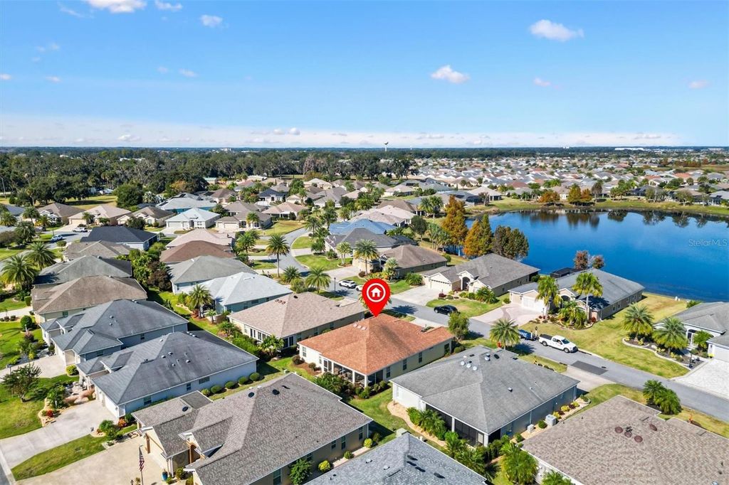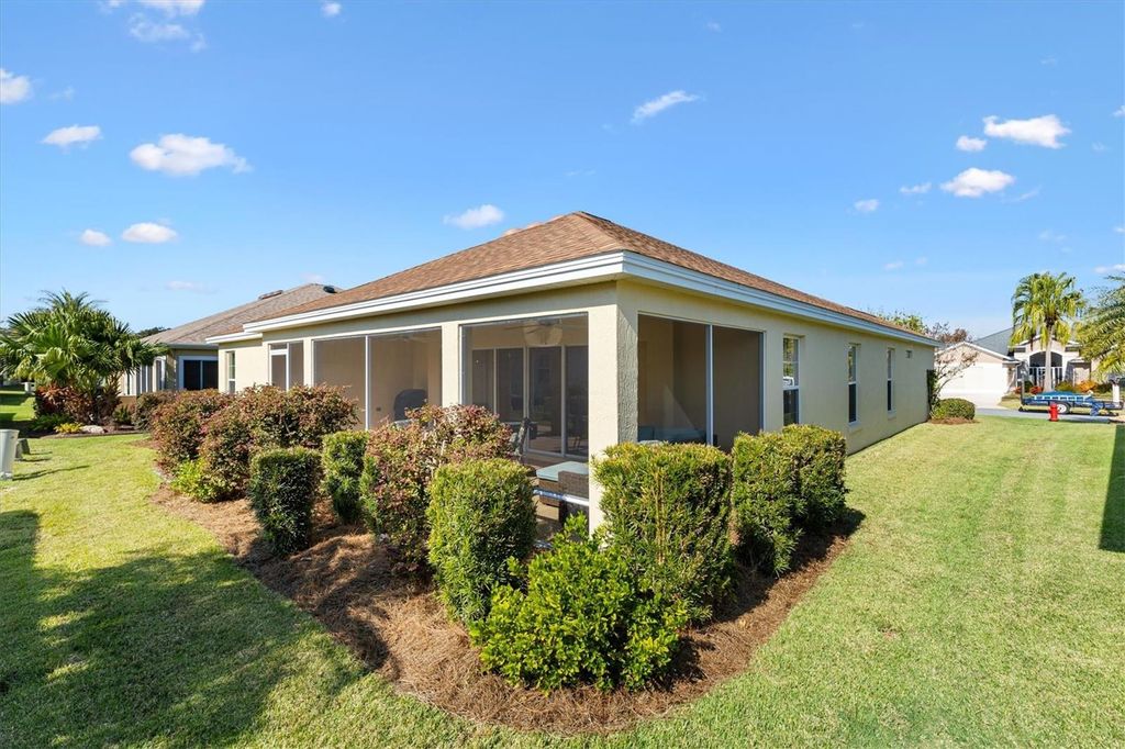 WHAT AN AMAZING PRICE AND A GREAT LOCATION -- Minutes to BROWNWOOD PADDOCK SQUARE. Mrs. CLEAN LIVES here and there is NO CARPET! This beautiful 3 bedroom 2 bath GARDENIA is 1963 sq ft, has had 1 OWNER and has been used as a snowbird home. It's being sold **TURNKEY** <>Nestled in VILLAGE OF LAKE DEATON, this lovely home has great curb appeal with Florida plants and a peek-a-boo of the pond. Step inside to an OPEN CONCEPT floor plan with CERAMIC TILE flooring in the kitchen and wet areas with BEAUTIFUL ENGINEERED HARDWOOD FLOORING throughout the rest of the home! NO TRANSITION STRIP between tile and engineered hardwood flooring. The kitchen has stair stepped cabinetry, high definition laminate counters and STAINLESS STEEL appliances (NEW OVEN). The dining and living room open out to a 27 x 10 screened lanai. The spacious primary suite has 2 WALK-IN closets an EN-SUITE bath w/a tiled ROMAN SHOWER, dual vanities and a separate water closet. The guest bedrooms are on the other side of the home and have a shared guest bath with laminate countertops and a tub/shower combo. LAKE DEATON is one of The Villages most sought-after locations, situated just north of Highway 44 and close to BROWNWOOD PADDOCK SQUARE, where you'll enjoy GOLF, shopping, dining, and nightly ENTERTAINMENT. This home has been meticulously maintained and barely lived in....Don't walk....RUN...Make your appointment to see this home today! Roof (2014) HVAC (2014) Water Heater (2014). Bond balance is $16,850.14.