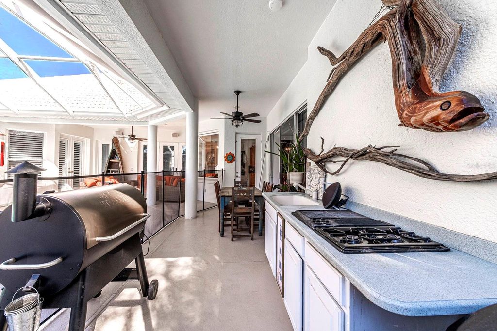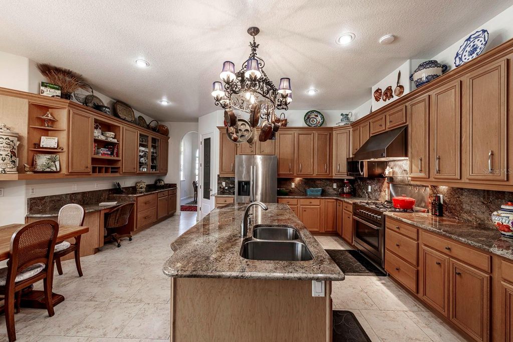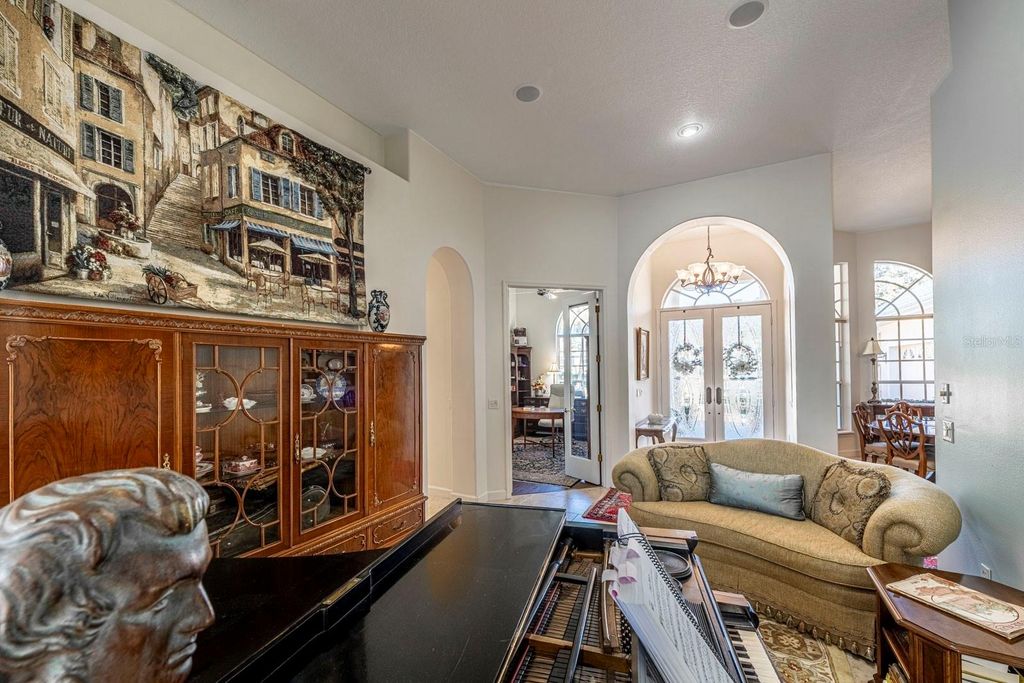 Situated in the highly desired Greenbriar Trail area of the Country Club of Mount Dora, this home stands among the community's most impressive properties. A palm-lined driveway leads to a stunning tile roof, bubbling fountain, and elegant double front doors adorned with full-length cut-glass panels setting the tone for the quality found throughout the home. Stepping inside, your gaze is immediately drawn through the formal living room to the infinity-edge pool, which blends seamlessly with the tranquil pond beyond. French doors from the living room open directly onto the pool deck, enhancing the home's indoor-outdoor flow. The formal dining room features tall arched windows that bathe the room in natural light "”perfect for memorable gatherings. A beautifully appointed home office offers large windows and generous space. With a closet and a full bath across the hall, this room can also function as a guest suite. The primary bedroom suite is a true retreat, offering two spacious walk-in closets, new plantation shutters, and French doors that open directly to the pool deck. Its luxurious ensuite bathroom offers a large walk-in shower, soaking tub, and dual vanities. The home is designed with a split-bedroom plan incorporating two guest bedrooms on the opposite side of the home which share a large full bath. One of the guest rooms features a walk-in closet large enough to accommodate a twin bed! The chef's kitchen is exceptional in both design and functionality. A central island anchors the space, surrounded by granite countertops and a matching backsplash. The kitchen boasts extra-tall maple cabinetry"”so abundant that the owner counted 67 cabinet doors"”in addition to a deluxe walk-in pantry. A professional-quality gas range, new refrigerator, Fisher Paykel double-drawer dishwasher, and expansive prep areas make this a cook's dream. Integrated into the kitchen is an inviting informal dining area with seamless windows overlooking the pool and the pond beyond. The connected family room sits across an informal bar ready for relaxing entertaining. The space flows seamlessly through pocketed sliding glass doors to the screened pool deck. The infinity pool appears to merge with the pond below, and the attached Jacuzzi sits perfectly for relaxation. A new Wi-Fi pool heater can warm the spa and pool remotely so it's ready whenever you are. The pool deck is set up for outdoor dining, has an outdoor kitchen, and includes a comfortable outdoor seating space overlooking 120 feet of waterfront, part of a series of interconnected ponds managed throughout this golfing community. The extra-large double car garage includes a separate golf-cart area offering outstanding storage and functional convenience. The home's infrastructure is equally impressive, providing a central vacuum system, whole-house water filtration and softener, wiring for a small generator. Living in the Country Club of Mount Dora offers more than just a home"”it's a lifestyle. Optional membership gives access to golf, tennis, pickleball, a large pool, and year-round social events. The charming Mount Dora downtown, just minutes away, is filled with boutique shops, dining, and popular festivals. Plus, with Orlando and its international airport less than an hour away, travel and city conveniences are always within easy reach. Whether you're seeking a peaceful retreat or an engaging community to call home, this property delivers!