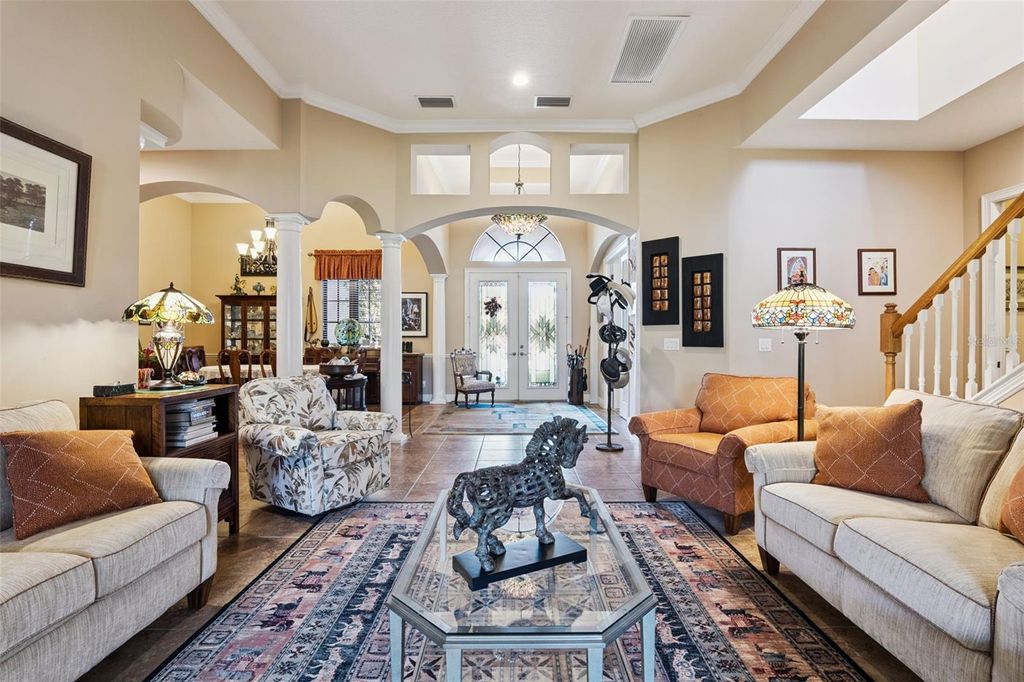 Nestled in the exclusive gated community of Loch Leven, this elegant executive home sits on one of the community's largest lakes and enjoys a stunning view of the fountain. A grand, airy foyer welcomes you into an open floor plan featuring formal living and dining rooms, a spacious family room with a fireplace, and a gourmet kitchen with abundant cabinetry, a butler's pantry, and a dedicated wine storage room. The separated three-car garage adds both convenience and privacy. The luxurious primary suite offers a raised sitting area overlooking the lake, an expansive bathroom with a separate tub and shower, an oversized walk-in closet, and an additional room ideal for an office or nursery. Two private bedroom wings provide excellent flexibility"”one with an en-suite bedroom plus an additional bedroom and bath, and the other with 2 bedrooms and 2 separate baths. A separate office and an upstairs bonus room"”perfect for a guest suite, game room, or media space"”enhance the home's versatility. Outdoors, the "L"-shaped screened patio offers serene lakefront views, complemented by a tile roof, paver-stone driveway, and beautiful landscaping that completes this exceptional property.