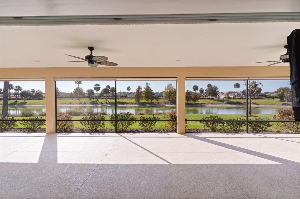 One or more photo(s) has been virtually staged. Welcome to this beautifully expanded Laurel Oak model in the desirable Fenney Village of The Villages, Florida. Offering 3 bedrooms, 2 bathrooms, and 2,309 sq ft, this meticulously maintained home blends thoughtful upgrades with elegant design. This home has ROOM FOR A POOL and also has a POND VIEW. The exterior features Landmark Designer premium shingles, full-house gutters, and enhanced, weather-tolerant landscaping accented with burgundy Seminole chip rock. A painted driveway, charming sitting porch, and screened entry create a warm welcome. The oversized 28' x 23' garage accommodates two large vehicles plus a golf cart, with additional storage, attic access with pull-down stairs, thermal attic insulation, attic fan, and vented garage door for improved comfort. The house faces Northwest, so there is no direct sun on either the garage or the lanai. Inside, enjoy high ceilings, wood-look tile flooring, carpeted bedrooms, and tray ceilings in both the front guest room and the luxurious primary suite. The home is equipped with a Pegasus whole-house filtration system, new matching contemporary quartz countertops, pull-outs throughout the kitchen and primary closet, crown molding, built-in entertainment center with bookcases, and plantation shutters on every window. Four solar tubes"”two with night lights"”brighten the living spaces. The laundry room offers an additional office area and built-in cabinetry. The kitchen showcases light-colored cabinetry, stainless steel appliances, a working island, porcelain sink, and ample storage. The primary suite includes a spacious roll-in Roman shower, while the guest bath features a tiled walk-in shower. A tankless water heater enhances efficiency. Relax and unwind in the expansive 52' x 14' lanai, complete with A pond view and pull-down shades for comfort. The four wall-mounted TVs convey with the home. Existing furniture is available separately. This exceptional home offers premium features, abundant storage, and serene water views"”an ideal retreat in the heart of Fenney Village.
