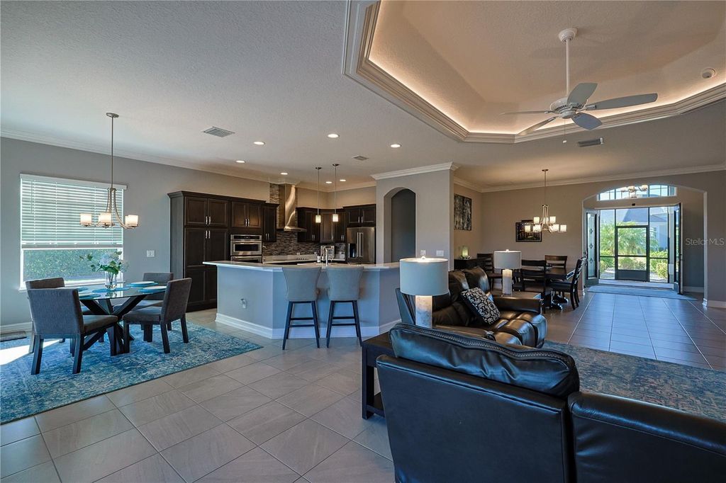 If you're looking for privacy and elegance in The Villages, this four bedroom, three bath Premiere Avalon model checks all the boxes. Perfectly located in the highly desirable "The Preserve" neighborhood, this meticulously maintained home abuts a protected natural wildlife preserve with unobstructed views across the expansive lanai. The BOND was PAID for this 2019 home with upgraded appliances, a brand-new pool pump and water softener. Step inside to see the open floor plan with 10-14-foot ceilings. Tray ceilings and recessed lighting is abundant throughout the home. The formal dining area is large enough to seat a party of 10, tray ceiling with a fan above the entire room. The first of two Primary bedrooms feature a huge ensuite bathroom with a large walk-in shower, walk in closet and a separate linen closet. The dual sink area also has seating to get ready for your day. There is also a tray ceiling and ceiling fan. The second primary bedroom is very spacious. The attached en-suite bathroom has a walk-in shower, a tray ceiling with fan as well as a seating area with lighting for reading your favorite book. The third bedroom has a wide closet and also has an attached ensuite bathroom. There is a professional, soundproof recording studio for music production or podcast creation. It can be easily converted to a fourth bedroom or large office. The two-car plus golf cart garage is wide and deep and features "The Magic Stairs" automatic stairs leading up to the attic with flooring and lighting. There is a 12,000-Watt dual-fuel generator with a separate circuit breaker panel. The generator has only been used with propane fuel. There is also a Ranchio irrigation system that is programmable through your smart phone. The lanai is truly amazing. This is why people move to Florida. Beautiful views of the protected preserve area extend for 180 degrees across the lanai. The heated salt-water pool has a shallow area for chairs and kids as well as a long "lap pool" section. There are five different areas for seating on the lanai, some covered and some screened. This is a great place to entertain or just revel in the serenity of the space. The Preserve is a gorgeous area in The Villages, and this home has one of the best views in The Preserve. Schedule your showing today!