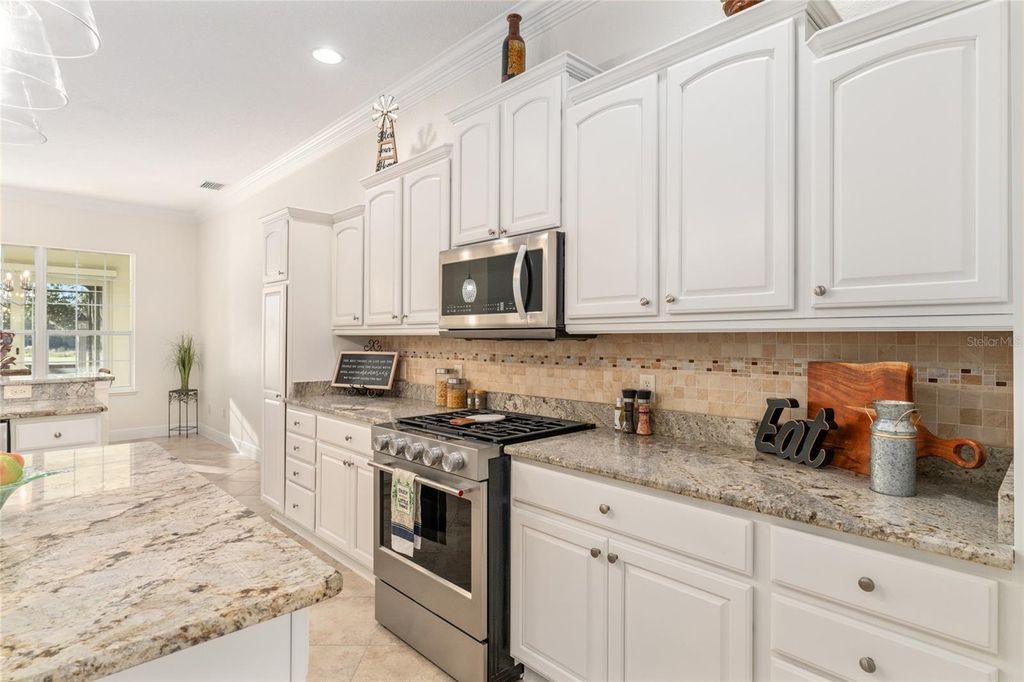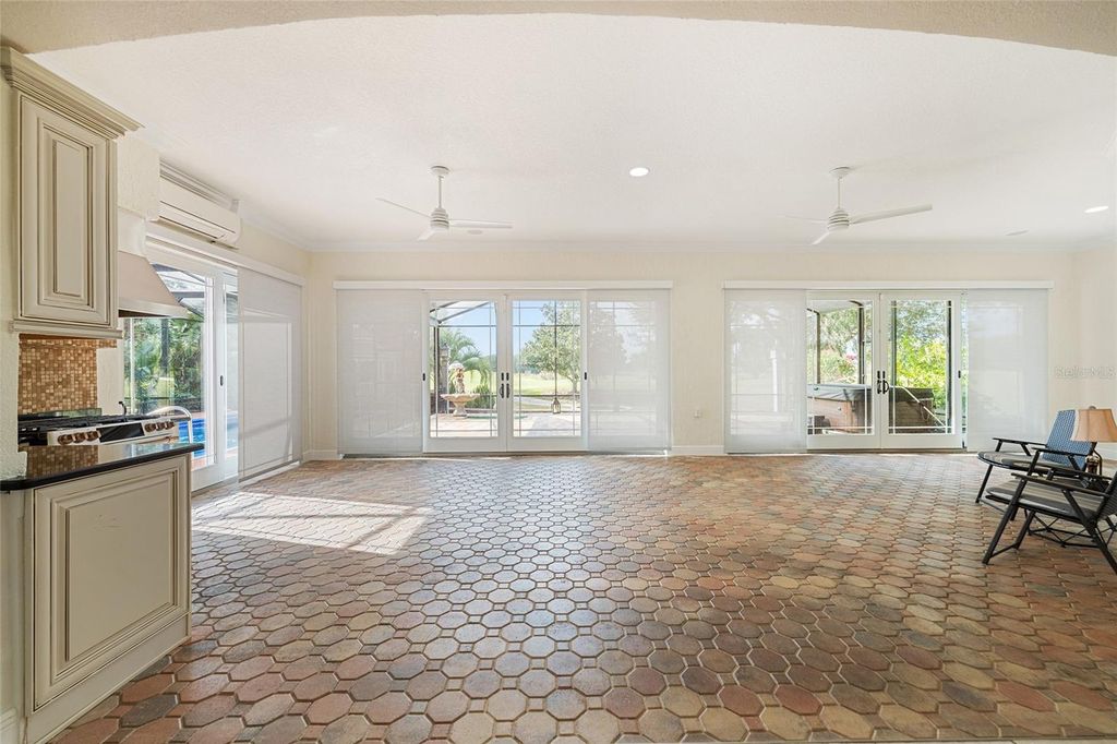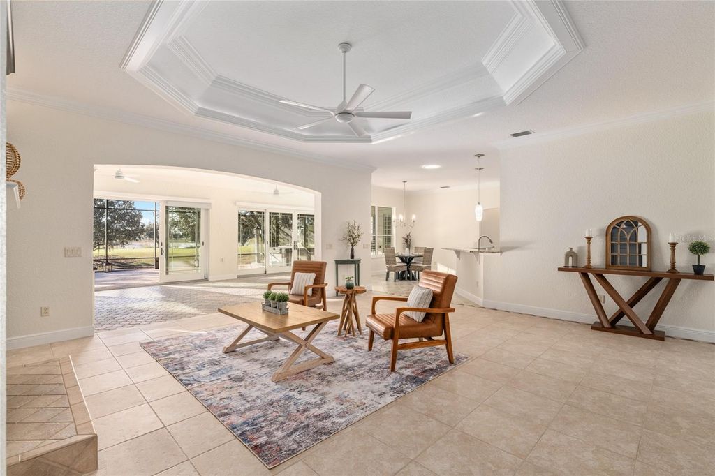 SPECTACULAR, UPGRADED 4 BEDROOM + OFFICE/DEN, 2 BATH, w/ a 2 Car plus TANDEM GOLF CART GARAGE. This Expanded SANIBEL PREMIER features an AMAZING HEATED SALTWATER POOL with/ waterfall AND AN above-ground spa, perfectly positioned on an oversized lot overlooking the Arnold Palmer Championship Golf Course with breathtaking water views, located in the all premier VILLAGE OF BRIDGEPORT AT LAKE SUMTER! This home was significantly expanded in 2022, bringing the total living space close to 4,000 sq ft, and showcases exceptional craftsmanship, thoughtful upgrades, and luxurious indoor/outdoor living. From the moment you arrive, the home radiates elegance with a PAVERED driveway and walkway, beautiful tropical landscaping with lighting, and lightning rods on the roof for added protection. Step inside to discover TILE flooring throughout, CROWN MOLDING, TRAY ceilings w/ LED lighting, SOLAR tubes, NEW electric FIREPLACE (can be converted to gas), and all-new updated light fixtures that illuminate the home with a warm, modern ambiance. The spacious kitchen is designed for both functionality and style, featuring GRANITE countertops, TILE backsplash, freshly painted cabinetry, NEW appliances, an island, a breakfast bar, a breakfast nook, and an open layout perfect for entertaining. The SPACIOUS primary bedroom has French doors that open out to the ENCLOSED FLORIDA ROOM, a LARGE WALK-IN CLOSET with solid wood custom built-ins, SOLAR tubes, an EN-SUITE BATH which offers cabinets, a vanity with GRANITE countertops, double sinks, a ROMAN SHOWER with a soaking tub, a LARGE linen closet, and a separate water closet. On the opposite side of the home are the two guest rooms with the guest bathroom featuring a lovely TILED shower and frameless sliding glass doors, GRANITE countertops, and a linen closet. The OFFICE/STORAGE room has a SOLAR tube and is located off of the laundry room and has the potential for a workout room, quilting/craft room, safe room- the sky's the limit. The 4th bedroom has a BUILT-IN closet and recessed lighting. The enclosed PAVERED lanai extends your indoor living space with a full summer kitchen that opens to your private outdoor oasis. Enjoy the saltwater pool, an extended pavered birdcage, a gazebo, and even an above-ground hot tub, all designed to maximize the stunning water and golf views. Whether hosting gatherings or relaxing quietly at sunset, this outdoor space is unmatched. Additional features include: ROOF (2022), Two AC units one replaced in 2018, the other in 2022, HWH (2022), Plenty of attic space with decking for storage, Electric garage screen door, retractable awning w/ LED lighting, ALL of the tile including the showers have been regrouted and sealed, FRESHLY painted throughout, and PLANTATION shutters. Right around the corner from Lake Sumter Landing, Arnold Palmer Country Club and Golf Course, and so many amenities close by! COME SEE THIS AMAZING HOME. Bond Bal. 13,869