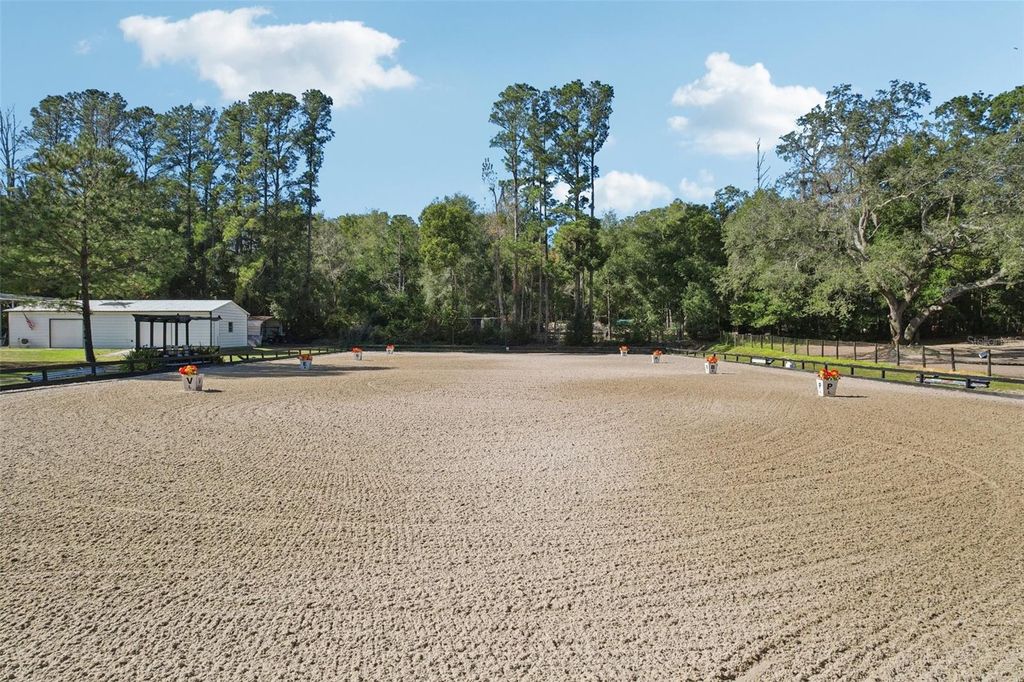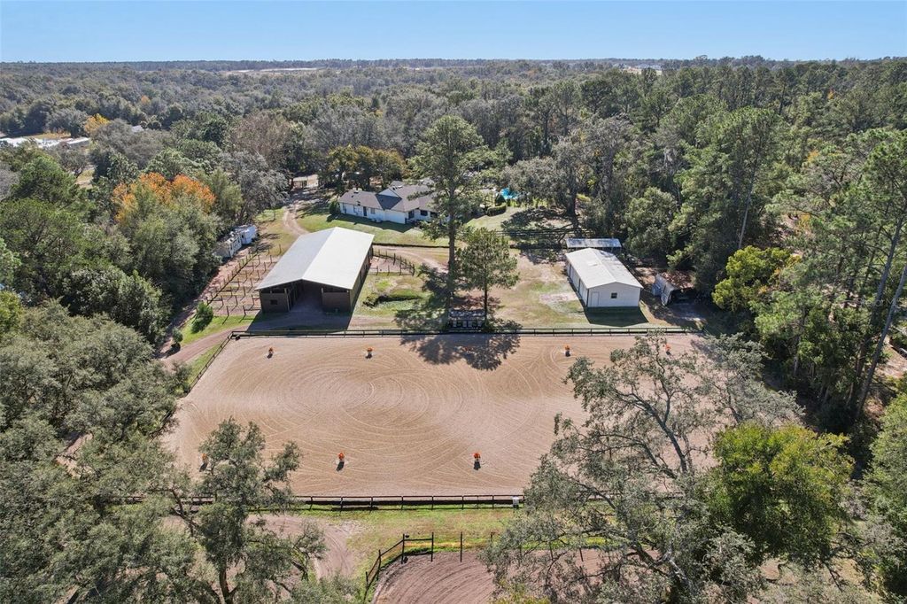 One or more photo(s) has been virtually staged. An exceptional private equestrian estate"”where refined country luxury meets world-class performance facilities"”just one hour from the renowned World Equestrian Center. Set on nearly five fenced acres, this rare offering is ideal for international buyers, professional trainers, or discerning equestrians seeking a turnkey Florida training base with privacy, infrastructure, and effortless livability. The custom 5-bedroom, 4-bath residence, including a private in-law suite. A spacious open floor plan showcases beautifully stained concrete floors throughout. The kitchen features stainless steel appliances, an eat-in dining area, expansive walk-in pantry, additional walk-in storage, and new LG stainless dishwasher, sink, and fixture installed in 2025. The kitchen flows seamlessly into the great room, anchored by a gas fireplace ideal for entertaining or everyday living. An expansive recreation/media room offers built-in bench storage, extensive electrical access, and a private exterior entrance leading directly to the resort-style pool"”ideal for entertaining, staff use, or multi-generational living. The primary suite is a serene retreat with a spa-inspired bath, soaking tub, walk-in shower, and spacious walk-in closet. A thoughtfully designed mud and utility room with separate exterior entrance allows seamless transition from barn to home. The interior in-law suite offers full independence with a private entrance, kitchenette, living area, bedroom, and handicap-accessible bath. Equestrian facilities rival professional training centers. The 3,500-sq-ft main barn features eight stalls with electric and fenced runouts, with infrastructure in place to expand to ten. Each stall includes gossip rail doors, automatic waterers, and ceiling fans. A pavered center aisle is enhanced by oversized fans and double wash racks with hot and cold water. The lockable, climate-controlled tack room includes laminate flooring, eight bay tack closets, kitchenette, bathroom, washer/dryer hookup, and a see-through window overlooking the barn aisleway. The property offers five fully electric paddocks, including one with a two-stall, plus wash rack additional barn. The 100' x 200' arena is laser-leveled with premium fiber mesh footing and a custom viewing area, highly regarded by professional trainers. Supporting infrastructure includes a 1,200-sq-ft workshop with double carport, a 14x30 camper carport on a 30x30 concrete pad with 30- and 50-amp service, plus additional 30-amp service at the front of the property"”all with water access. There is ample room for trailers, equipment, and guest parking, and the home benefits from a fully irrigated landscape. Outdoor living is resort-inspired with a pool, expansive decking, covered pergola, and tranquil stream, waterfall, and fish pond framed by rock-wall landscaping. A side yard fire pit and tree swing complete this private retreat. Gated and fully enclosed with no-climb fencing, this refined equestrian estate presents a rare opportunity to own a professionally equipped Florida horse property"”just one hour from the World Equestrian Center, Clarcona Horseman's Park, and Rocking Horse show grounds, just to name a few. Multiple riding trails where you could ride and/or camp for days and never cover the same trail twice. Minutes to major roads and shopping"”perfect for international competition, professional training facility, seasonal residency, or long-term investment.