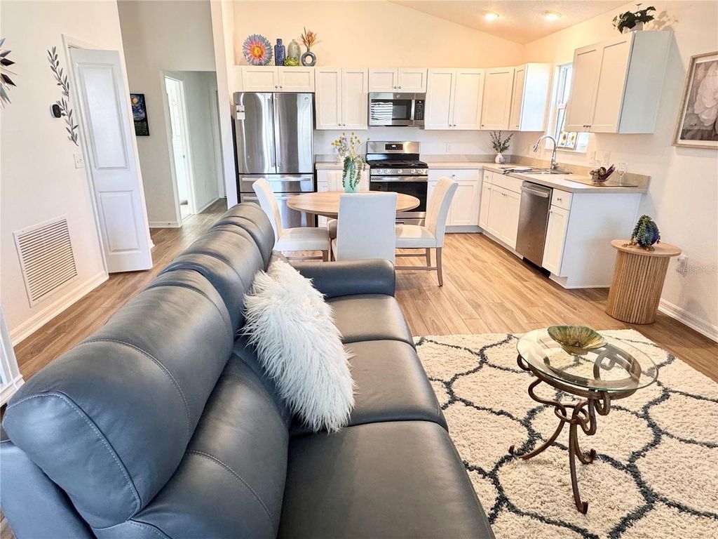 From the moment you arrive, this home welcomes you with charming curb appeal,spacious lot, and a covered front porch that invites you to slow down and enjoy the neighborhood. Inside, the open layout features vaulted ceilings, warm wood-look flooring, and natural light that flows effortlessly through the living and dining areas.The bright, open kitchen offers crisp white cabinetry, stainless steel appliances, and a seamless connection to the main living space"”perfect for everyday living or relaxed entertaining. The bedrooms provide comfortable retreats with soft carpeting, ceiling fans, and plantation-style window treatments. A clean, well-organized garage that allows a car and golf cart parking and thoughtful layout reflect a home that is truly move-in ready.Enjoy an unbeatable location just 5 minutes to Eastport, 2 minutes to Saluki Recreation Center, 1 minute to Shady Brook Neighborhood Pool and Mail Center, and 3 minutes to Moultrie Creek Recreation Center"”putting you right in the heart of The Villages lifestyle. Call for an appt today!