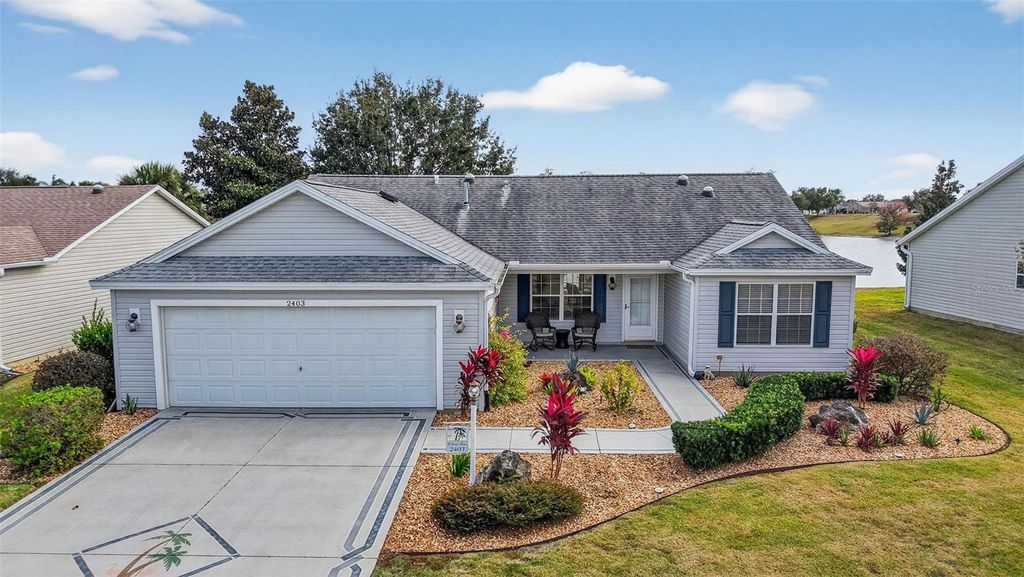 BOND PAID! ENJOY BREATHTAKING WATERFRONT VIEWS from this STUNNING, TURNKEY 3-bedroom, 2-bath Bougainvillea. IDEALLY LOCATED in the Village of Duval"”between County Roads 466 and 466A and JUST MINUTES from BOTH Lake Sumter Landing and Brownwood Paddock Squares with shopping, dining, and nightly live entertainment right at your fingertips! This MOVE-IN READY home truly has it all"”BOND PAID, HVAC (2024) and ROOM FOR A POOL! From the moment you arrive, you'll be impressed by the decorative painted drive and walkways, stone-accented landscape beds, and charming front porch"”an inviting spot to relax and enjoy Florida's beautiful weather. Inside, high VAULTED ceilings and an OPEN-CONCEPT design seamlessly connect the living, dining, and kitchen areas, creating a bright and spacious main living space. WIDE-PLANK LUXURY VINYL flooring flows throughout the home, while two SOLAR TUBES provide abundant natural light. The MODERN kitchen features NAVY lower cabinets with GRAY uppers, QUARTZ countertops, a TILE backsplash, STAINLESS appliances with GAS cooking, and a CENTER ISLAND with a counter-height breakfast bar"”perfect for casual dining and entertaining. Sliding glass doors, off the dining area, lead to the screened lanai and extended birdcage, offering a PEACEFUL OUTDOOR RETREAT to enjoy morning coffee or evening sunsets while taking in SERENE WATER VIEWS. The expansive backyard provides PRIVACY, room for a future pool, and picturesque year-round scenery! A one-year-old AUTOMATIC GARAGE SCREEN adds convenience and ease to your outdoor space. Back inside, the spacious primary suite offers TWO WALK-IN closets and an en-suite bath with NAVY cabinetry, GRANITE countertops, DUAL sinks set against a shiplap accent wall, a TILED WALK-IN shower, and a private water closet. The sliding glass door from the master bedroom opens directly to the lanai. Designed with privacy in mind, the SPLIT FLOOR PLAN includes a SEPARATE GUEST WING behind a POCKET DOOR. Bedroom two features a built-in closet and a large window with tranquil pond views. The second bathroom includes a NAVY vanity with a VESSEL sink, TILED tub and shower combination, and a convenient hallway LINEN closet. The third bedroom is outfitted with custom cabinetry and a queen MURPHY BED, double windows, and a built-in closet"”ideal for guests or a home office. A centrally located interior laundry room provides additional storage with WHITE cabinetry. Just beyond, the OVERSIZED two-car garage features EPOXY flooring, attic access with pull-down stairs, and ample room for two cars AND a golf cart! The Village of Duval is IDEALLY LOCATED between County Roads 466 and 466A; only minutes away from BOTH Lake Sumter Landing and Brownwood Paddock Squares; Surrounded by popular recreation centers, including SeaBreeze Regional Recreation Center; Duval, Truman, Sterling Heights, and Colony Cottage Recreation Centers; A short golf cart ride to DOZENS of Executive Golf Courses as well as Havana, Cane Garden, Evans Prairie, Mallory Hill, and Bonifay Country Clubs and Championship Golf Courses; Just minutes to either 466 or 466A with abundant shopping, dining, banking, medical, and more! Enjoy a myriad of tropical birds and ducks right from your backyard every day. DON'T MISS YOUR OPPORTUNITY to own this INCREDIBLE WATERFRONT HOME in one of The Villages most desirable locations"”CALL TODAY to schedule your Private Showing or Virtual Tour!
