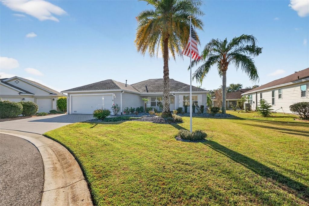Welcome to this STUNNING, TURNKEY 3/2 Bougainvillea with an EXPANSIVE 29'x15' ADDITION and an IMMENSE 841SF TWO-CAR + GOLF CART GARAGE, IDEALLY LOCATED on an EXPANSIVE CUL-DE-SAC LOT in the Village of Virginia Trace "”between County Roads 466 and 466A and JUST MINUTES from Lake Sumter Landing with shopping, dining, and live nightly entertainment right at your fingertips! This MOVE-IN READY home truly has it all"”BOND PAID! ROOF (2020), HVAC (2023) From the moment you arrive, you'll be impressed by the DECORATIVELY PAINTED drive and walkways, stone-accented CURBED landscape beds, and CHARMING front porch"”an inviting spot to relax and enjoy Florida's beautiful weather! Inside, high VAULTED ceilings and an OPEN-CONCEPT design seamlessly connect the living, dining, and kitchen. TILE flooring flows seamlessly throughout the main living area, while two SOLAR TUBES provide abundant natural light, and CHAIR RAILING adorns the walls. For a touch of ELEGANCE, PLANTATION SHUTTERS can be found on the windows throughout the home. The AMAZING kitchen features WHITE cabinetry, PULL-OUTS, STAINLESS appliances with GAS cooking, and an U-shaped CENTER ISLAND with a EAT-IN counter-height breakfast bar"”perfect for casual dining and entertaining. From the dining area, step into the EXPANSIVE 29'x15' ADDITION of the combined dinette and family room boasting RICH, WOOD-GRAIN LAMINATE flooring. This FABULOUS room adds approximately 390SF of under-air living space! A set of French doors open to the SPACIOUS lanai with TILE floors and EXTENDED OUTDOOR PATIO with MATURE PRIVACY LANDSCAPING. This WONDERFUL OUTDOOR RETREAT offers the perfect spot to enjoy your morning coffee, sip an evening cocktail, or relax with a good book! Back inside, the luxurious primary suite offers RICH, WOOD-GRAIN LAMINATE floors, CROWN MOLDING, TWO WALK-IN closets, and an en-suite bath with WOOD cabinetry, GRANITE countertops, DUAL sinks, and a TILED WALK-IN shower. Designed with PRIVACY in mind, the SPLIT FLOOR PLAN includes a SEPARATE guest wing and/or home office behind a POCKET DOOR. Bedroom two features a built-in closet and a large window. The second bathroom includes a WOOD vanity with a GRANITE top, TILED tub and shower combination, and a convenient hallway LINEN closet. The third bedroom offers double windows and a built-in closet. A centrally located interior laundry room provides additional storage with WHITE cabinetry and an extra refrigerator. Just beyond, the OVERSIZED two-car garage features PAINTED flooring, WHITE cabinetry, UTILITY sink, and a WORKBENCH. There's also an ADJACENT GOLF CART GARAGE boasting EPOXIED flooring, attic access with pull-down stairs, and a convenient door to the lanai. Together, both garages total approximately 841SF of parking and storage area! DON'T MISS YOUR OPPORTUNITY TO MAKE THIS INCREDIBLE TURNKEY HOME YOUR OWN! The Village of Virginia Trace offers an UNBEATABLE LOCATION - JUST MINUTES to Lake Sumter Landing - where you'll find an array of shopping, dining, and live nightly entertainment! You'll also be close to Mallory Hill and Arnold Palmer Country Clubs and Championship Golf Courses. Health enthusiasts will love the proximity to the Lake Miona Regional Recreation Center and Fitness Trail. This home is truly a gem, located in one of the most desirable neighborhoods in The Villages! PLEASE WATCH OUR WALKTHROUGH VIDEO of this GORGEOUS, MOVE-IN READY HOME in a FANTASTIC LOCATION and call today to schedule your Private Showing or Virtual Tour!