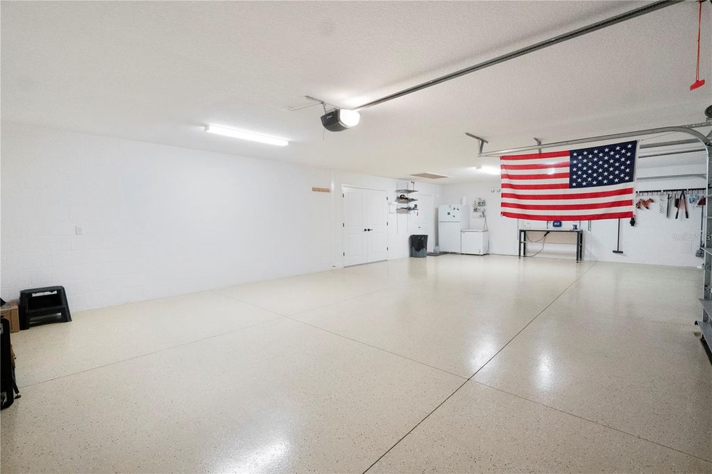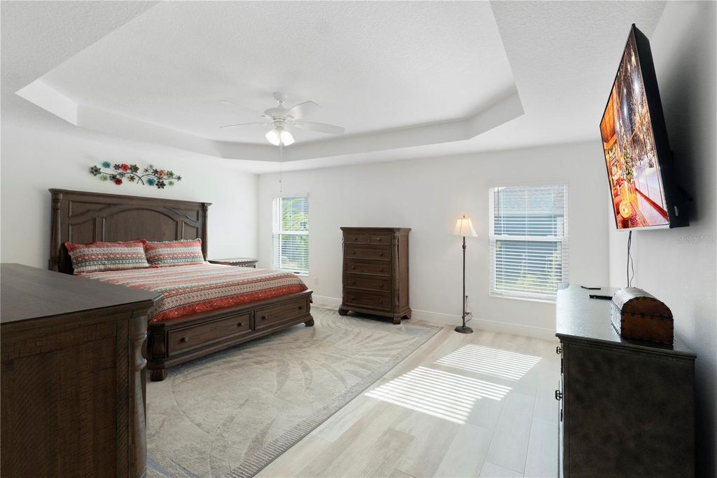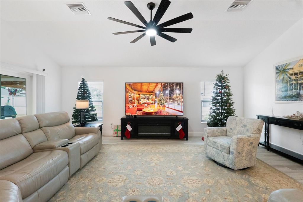 One or more photo(s) has been virtually staged. Just in time for the Holidays! ROOM FOR A POOL/HOBBY ROOM, etc, 4-CAR GARAGE, TILE PLANK FLOORING THROUGHOUT, QUARTZ COUNTERTOPS, SUPERB LOCATION. This home is located in the Village of St. Johns and is stunning. This block and stucco, Aspen Designer model home with exceptional curb appeal has a massive epoxy painted 4-car garage, it's on a corner homesite and is large enough for a pool, hobby room, pool house or whatever you desire. Lots of room for expansion on this lot! The inside is light and bright with vaulted ceilings, 5 ¼ inch baseboards, wide tile plank flooring throughout, 42" kitchen cabinets, quartz countertops, a fully enclosed lanai with a Mitsubishi mini split system to heat and cool the large lanai with vertical Blinds and Landscaping for privacy. The pergola installed over the patio area will help kept your outdoor grilling cooler and dryer. The Driveway has been painted and a front courtyard installed for your outdoor comfort and visiting with the neighbors. The primary suite is spacious and comfortably fits a King size bedroom set. The ensuite has a Roman Walk-In shower, linen closet, and a separate toilet room. This home is centrally located to Brownwood Paddock Square and Grand Traverse Shopping Plaza and Harry and The Natives can all be accessed by golf cart. Call today for a private showing, there is much more to see!