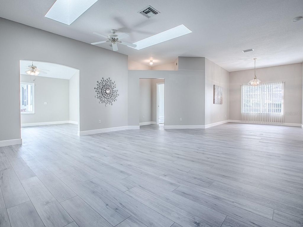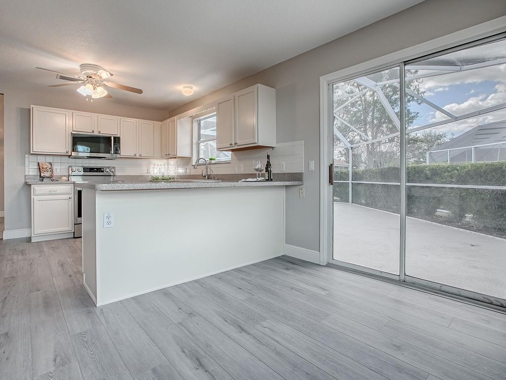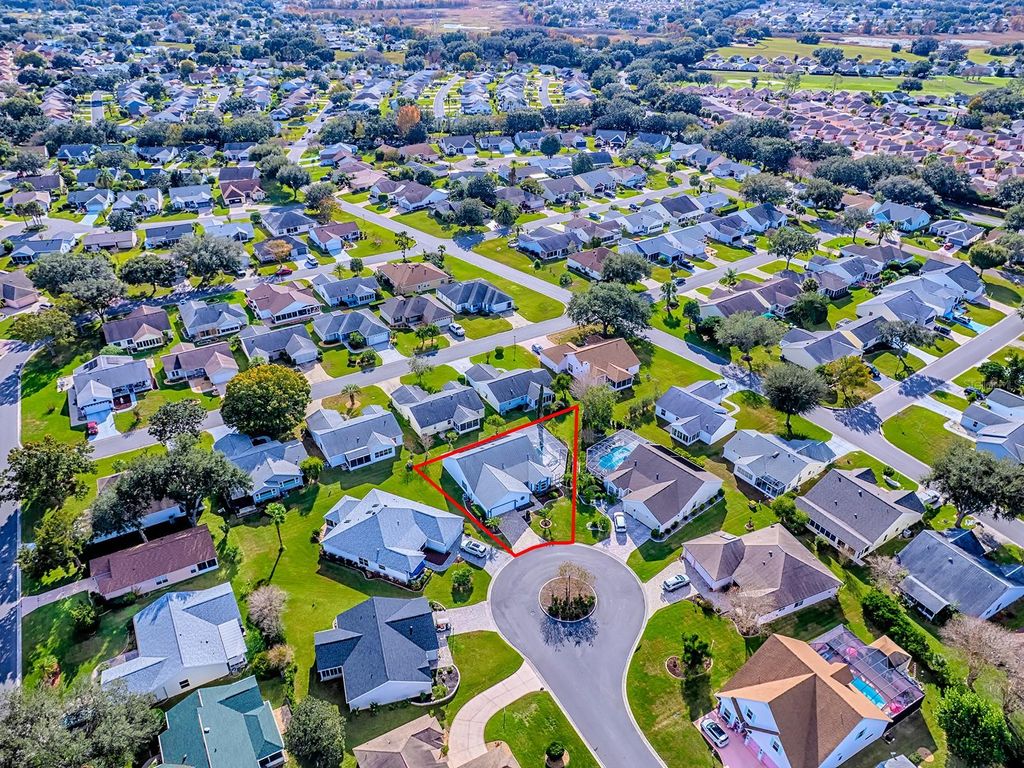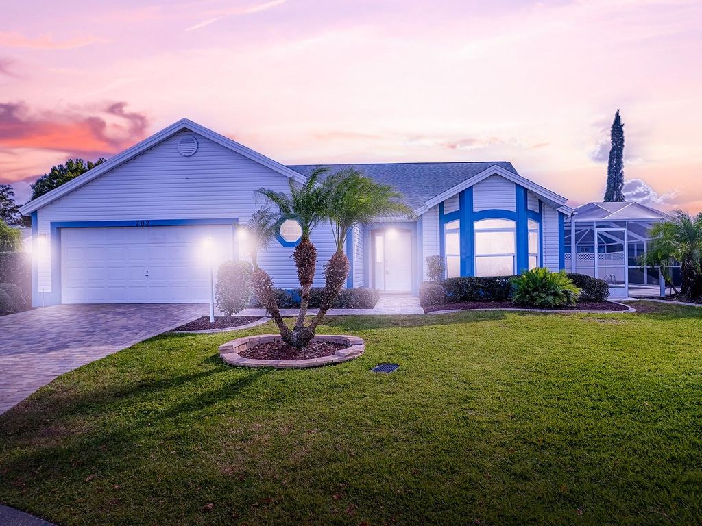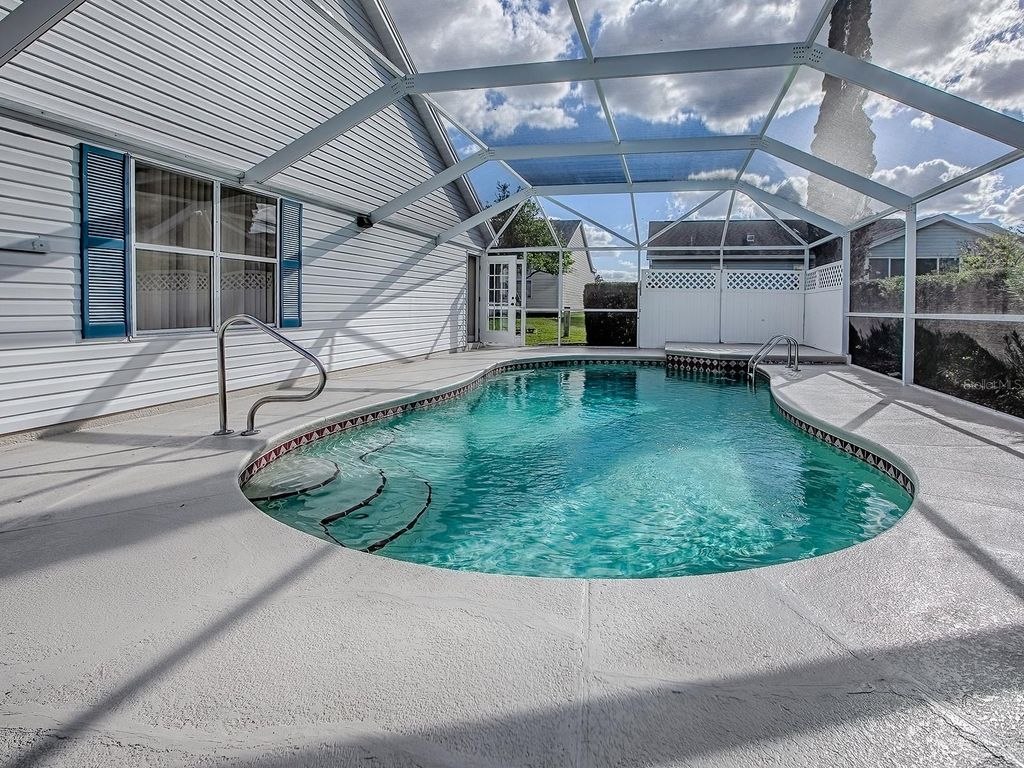 BOND PAID! Welcome to this beautifully updated Santa Domingo POOL HOME, perfectly situated on a quiet cul-de-sac in the Village of Rio Grande. If you are looking for a move-in-ready home, this one is sure to impress! Attractive landscaping and fresh exterior trim paint create wonderful curb appeal. Inside, you're greeted by a welcoming foyer with a convenient coat closet, vaulted ceilings with NO POPCORN, and NEW luxury vinyl plank flooring throughout. The bright, updated kitchen features freshly painted cabinetry, brand-new stainless-steel appliances, Quartz countertops, a pantry, built-in desk space, and a window overlooking the pool. A cozy dinette just off the kitchen features sliding glass doors that lead directly to the pool area, perfect for casual dining and indoor-outdoor living. The spacious living room has two skylights that illuminate the space and showcase volume ceilings, and flows seamlessly into the formal dining area. At the same time, the Florida Room adds valuable living space and is ideally located just off the living room, great for entertaining. The owner's suite offers dual closets and private access to the pool, along with an updated en-suite bath featuring QUARTZ countertops, dual sinks, a walk-in shower, and a linen closet. Step outside to enjoy the SPARKLING HEATED POOL with a newly screened birdcage, ideal for relaxing or entertaining in the Florida sunshine. The guest wing includes two comfortable bedrooms with double-door closets, separated by an updated guest bath with a new vanity and decorative glass door in the tub/shower combo. The laundry room is equipped with storage cabinets, a set sink, and an additional refrigerator. You will love the OVERSIZED GARAGE with room for two cars plus a golf cart! Recent improvements include NEW interior paint, NEW flooring, removal of popcorn ceilings, NEW front and back windows, freshly painted pool decking, NEW birdcage screens, NEW garage paint and floor, NEW exterior trim paint, NEW water heater, and all NEW appliances. Roof 2014, HVAC 2018. Conveniently located between Lake Sumter and Spanish Springs Town Squares. Located just 1/2 mile to the Rio Grande Neighborhood Pool and minutes to County Road 466 with numerous grocery stores, restaurants, banks, and medical. Close to three large Regional Recreation Centers, Laurel Manor, Savannah Center, and La Hacienda. Plus, this home is also close to several Country Clubs & Championship Golf Courses such as Tierra Del Sol, Hacienda Hills, and Orange Blossom Hills. This meticulously updated home is truly move-in ready. Don't miss your opportunity to enjoy the best of Village living!