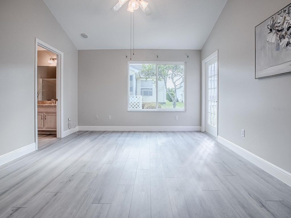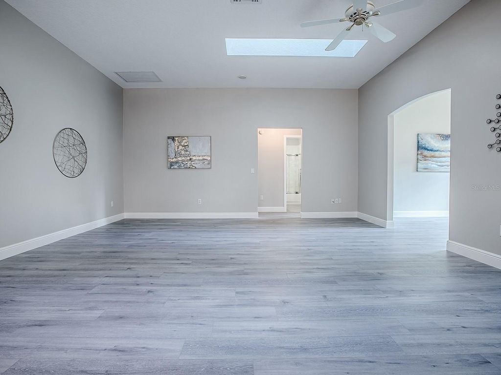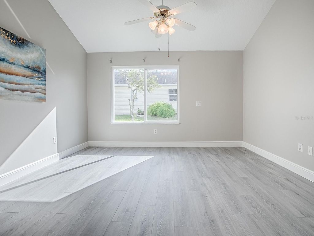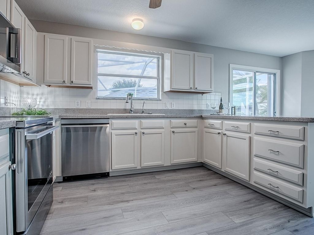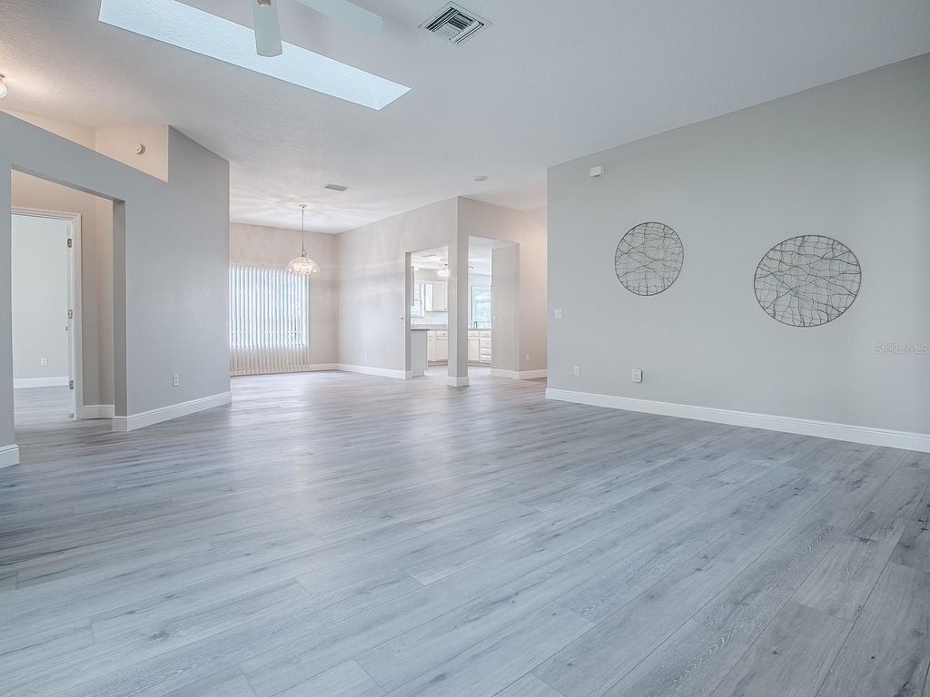 BOND PAID! Welcome to this beautifully updated Santa Domingo POOL HOME, perfectly situated on a quiet cul-de-sac in the Village of Rio Grande. If you are looking for a move-in-ready home, this one is sure to impress! Attractive landscaping and fresh exterior trim paint create wonderful curb appeal. Inside, you're greeted by a welcoming foyer with a convenient coat closet, vaulted ceilings with NO POPCORN, and NEW luxury vinyl plank flooring throughout. The bright, updated kitchen features freshly painted cabinetry, brand-new stainless-steel appliances, Quartz countertops, a pantry, built-in desk space, and a window overlooking the pool. A cozy dinette just off the kitchen features sliding glass doors that lead directly to the pool area, perfect for casual dining and indoor-outdoor living. The spacious living room has two skylights that illuminate the space and showcase volume ceilings, and flows seamlessly into the formal dining area. At the same time, the Florida Room adds valuable living space and is ideally located just off the living room, great for entertaining. The owner's suite offers dual closets and private access to the pool, along with an updated en-suite bath featuring QUARTZ countertops, dual sinks, a walk-in shower, and a linen closet. Step outside to enjoy the SPARKLING HEATED POOL with a newly screened birdcage, ideal for relaxing or entertaining in the Florida sunshine. The guest wing includes two comfortable bedrooms with double-door closets, separated by an updated guest bath with a new vanity and decorative glass door in the tub/shower combo. The laundry room is equipped with storage cabinets, a set sink, and an additional refrigerator. You will love the OVERSIZED GARAGE with room for two cars plus a golf cart! Recent improvements include NEW interior paint, NEW flooring, removal of popcorn ceilings, NEW front and back windows, freshly painted pool decking, NEW birdcage screens, NEW garage paint and floor, NEW exterior trim paint, NEW water heater, and all NEW appliances. Roof 2014, HVAC 2018. Conveniently located between Lake Sumter and Spanish Springs Town Squares. Located just 1/2 mile to the Rio Grande Neighborhood Pool and minutes to County Road 466 with numerous grocery stores, restaurants, banks, and medical. Close to three large Regional Recreation Centers, Laurel Manor, Savannah Center, and La Hacienda. Plus, this home is also close to several Country Clubs & Championship Golf Courses such as Tierra Del Sol, Hacienda Hills, and Orange Blossom Hills. This meticulously updated home is truly move-in ready. Don't miss your opportunity to enjoy the best of Village living!