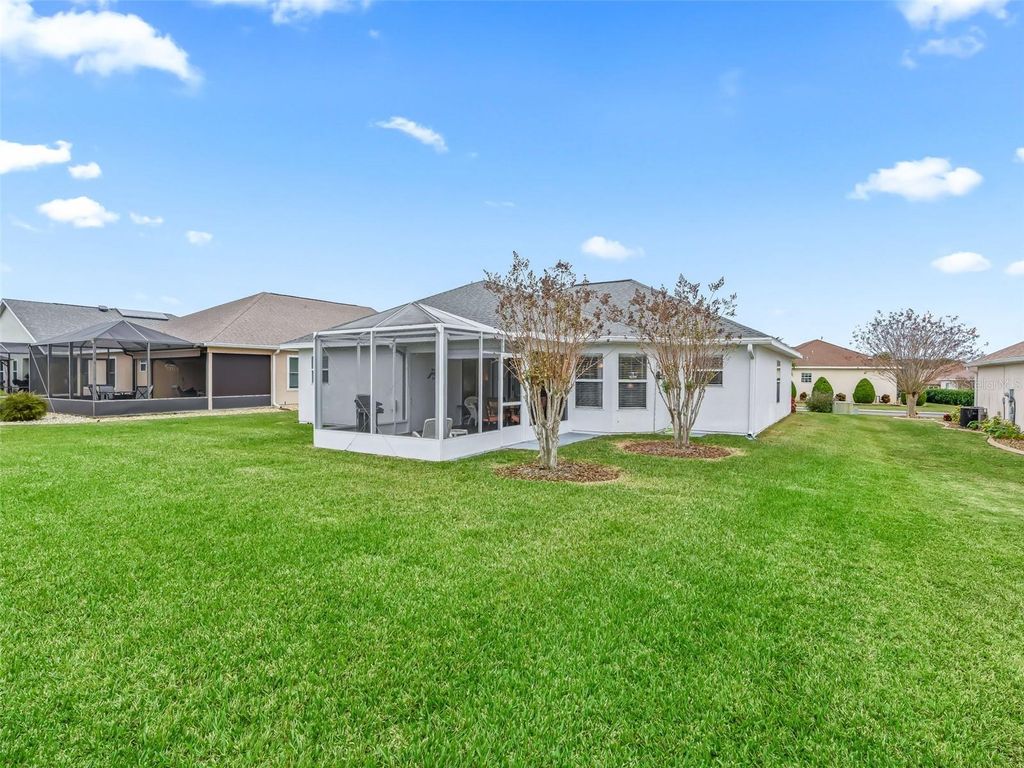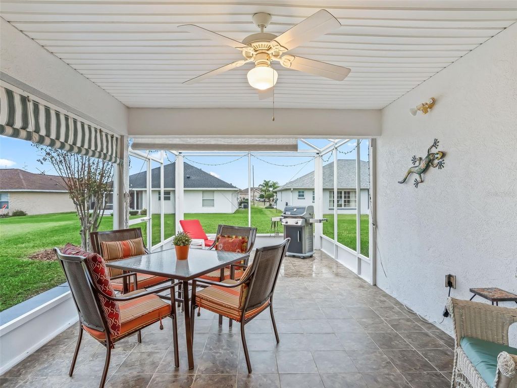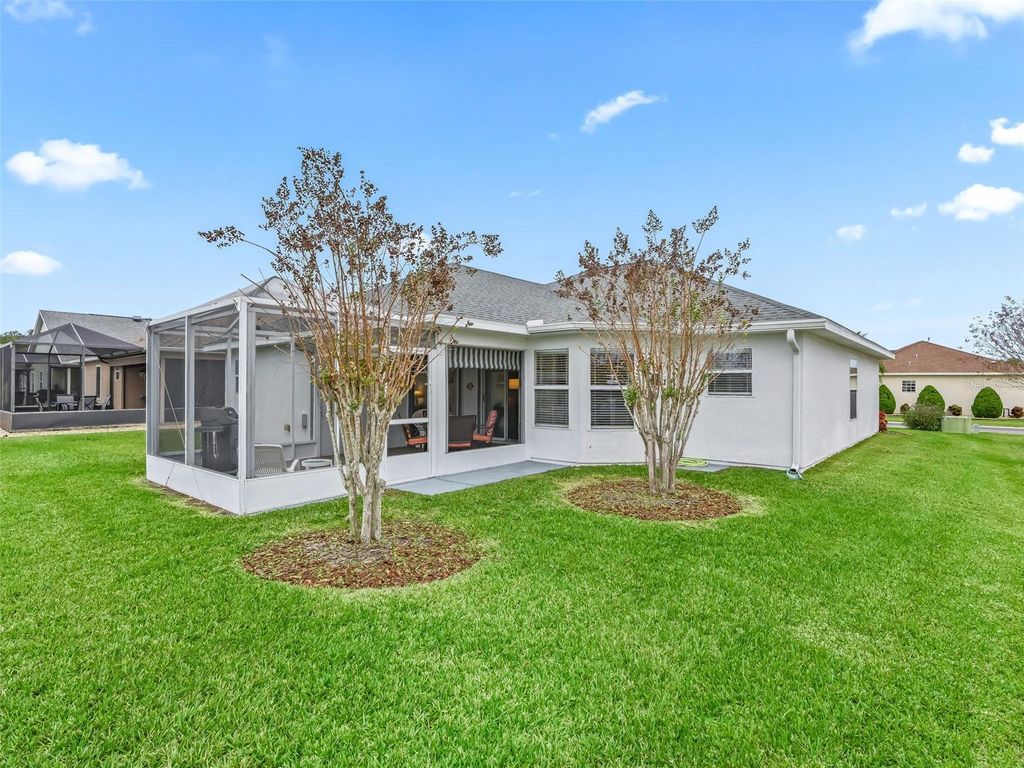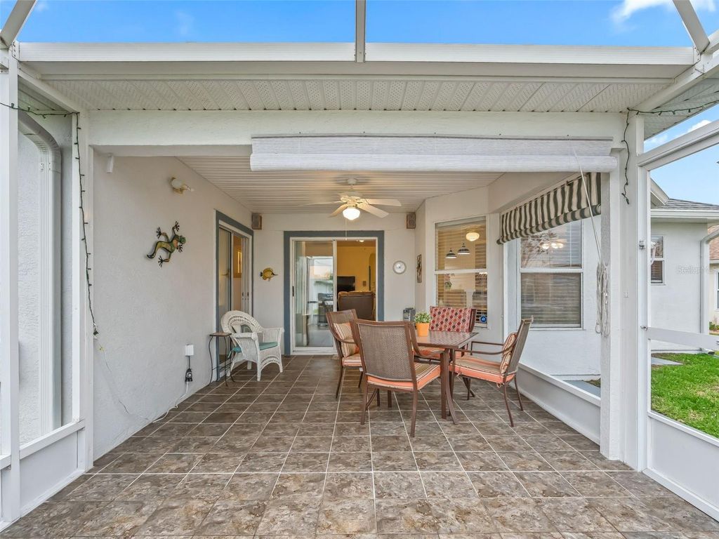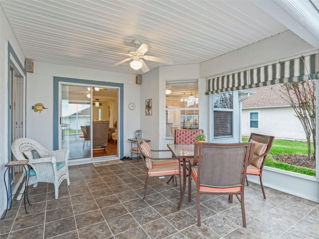 Welcome to this beautifully maintained 3-bedroom, 2-bath home with a spacious 2-car garage, located in the highly sought-after Stonecrest 55+ gated community. Lush landscaping and a screened front entry with elegant tiled flooring create an inviting first impression. Step inside to a welcoming foyer featuring tile flooring and graceful arched entryways throughout the home. A tasteful combination of luxury vinyl, wood laminate, and tile flooring adds both style and durability. The bright kitchen offers an eating area, light wood cabinetry, granite-look countertops, light appliances, tile backsplash, and a convenient closet pantry. An elevated counter with pendant lighting provides additional counter space, while above AND below-cabinet lighting and a ceiling fan complete the space. A separate formal dining room is perfect for entertaining. The spacious primary suite features sliding glass doors leading to the lanai, a ceiling fan, walk-in closet, linen closet, and a beautifully tiled glass walk-in shower. Two additional bedrooms are located near the second bath, which includes a vanity and a tub/shower combination for added convenience. The open great room boasts vaulted ceilings and sliding glass doors that lead to the lovely, partially covered lanai. The expansive screened lanai features roll-down shades and attractive tiled flooring, ideal for relaxing or enjoying Florida's beautiful weather year-round. Additional highlights include an indoor laundry room and a large two-car garage. Furnishings may be available separately. Stonecrest is a truly gated, active 55+ community offering spacious lots, 24-hour security, private roads, and an impressive array of amenities. Residents enjoy an 18-hole championship golf course, multiple pools, pickleball courts, softball, the Broad Stripes Golf & Social Club, and over 80 clubs to join. Conveniently located off Highway 441, Stonecrest provides easy access to shopping, banking, dining, and more. Schedule your private viewing now!