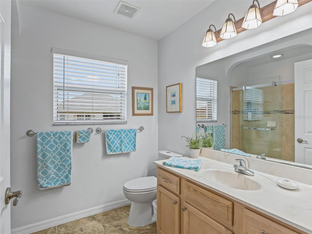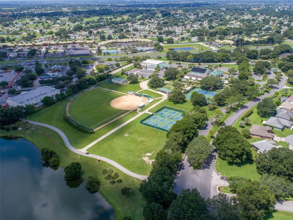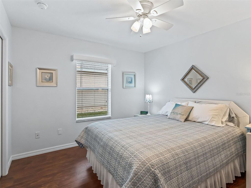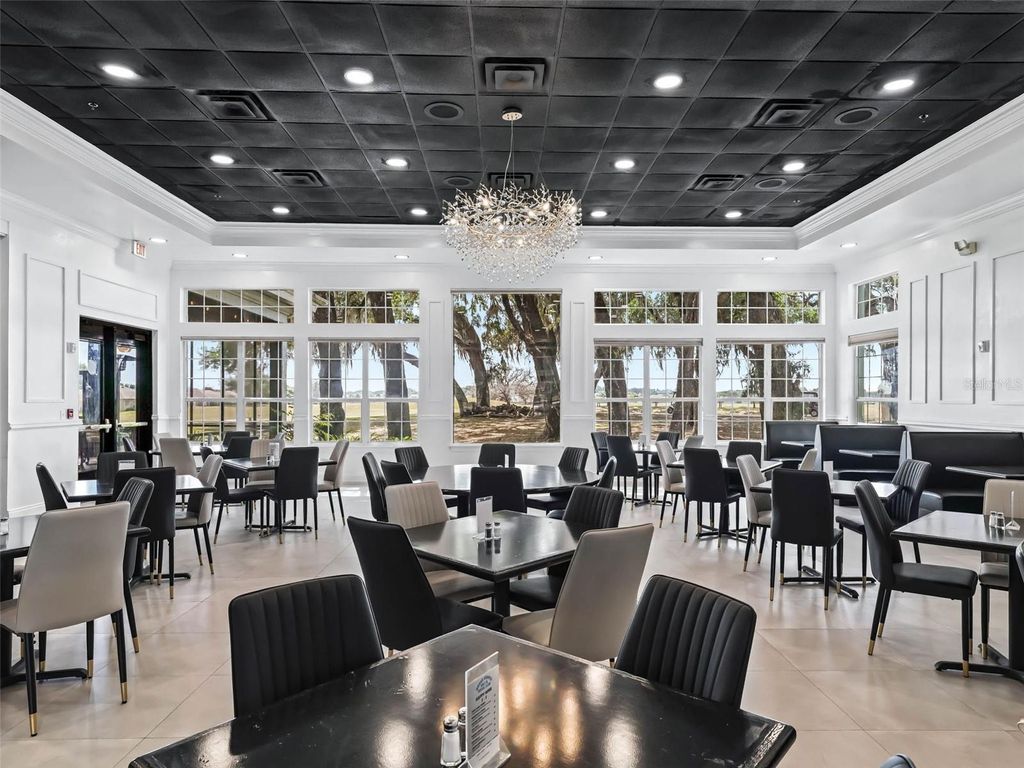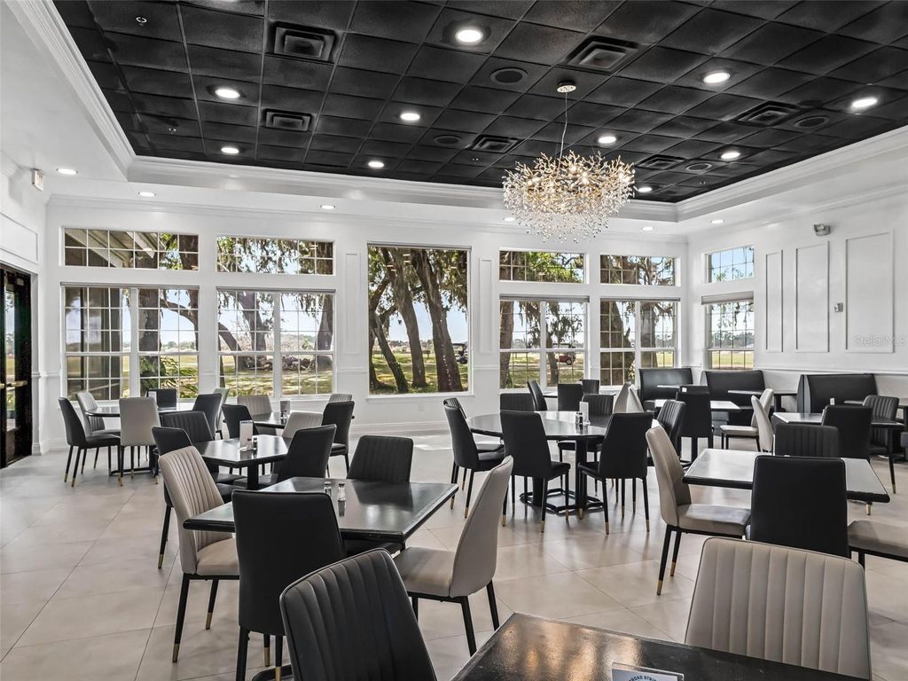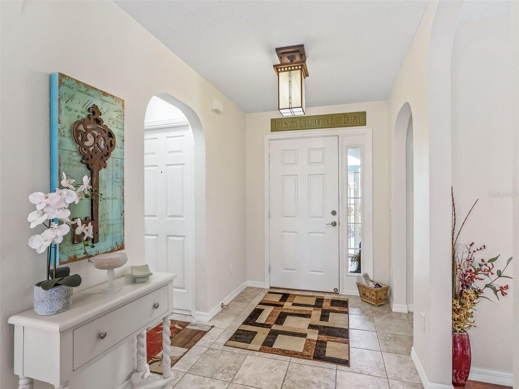 Welcome to this beautifully maintained 3-bedroom, 2-bath home with a spacious 2-car garage, located in the highly sought-after Stonecrest 55+ gated community. Lush landscaping and a screened front entry with elegant tiled flooring create an inviting first impression. Step inside to a welcoming foyer featuring tile flooring and graceful arched entryways throughout the home. A tasteful combination of luxury vinyl, wood laminate, and tile flooring adds both style and durability. The bright kitchen offers an eating area, light wood cabinetry, granite-look countertops, light appliances, tile backsplash, and a convenient closet pantry. An elevated counter with pendant lighting provides additional counter space, while above AND below-cabinet lighting and a ceiling fan complete the space. A separate formal dining room is perfect for entertaining. The spacious primary suite features sliding glass doors leading to the lanai, a ceiling fan, walk-in closet, linen closet, and a beautifully tiled glass walk-in shower. Two additional bedrooms are located near the second bath, which includes a vanity and a tub/shower combination for added convenience. The open great room boasts vaulted ceilings and sliding glass doors that lead to the lovely, partially covered lanai. The expansive screened lanai features roll-down shades and attractive tiled flooring, ideal for relaxing or enjoying Florida's beautiful weather year-round. Additional highlights include an indoor laundry room and a large two-car garage. Furnishings may be available separately. Stonecrest is a truly gated, active 55+ community offering spacious lots, 24-hour security, private roads, and an impressive array of amenities. Residents enjoy an 18-hole championship golf course, multiple pools, pickleball courts, softball, the Broad Stripes Golf & Social Club, and over 80 clubs to join. Conveniently located off Highway 441, Stonecrest provides easy access to shopping, banking, dining, and more. Schedule your private viewing now!