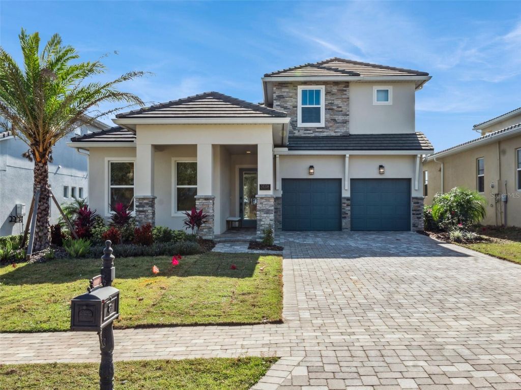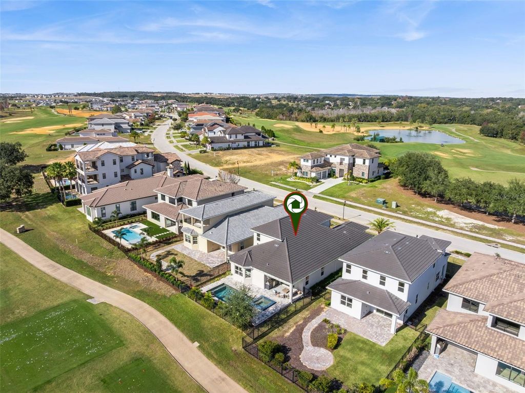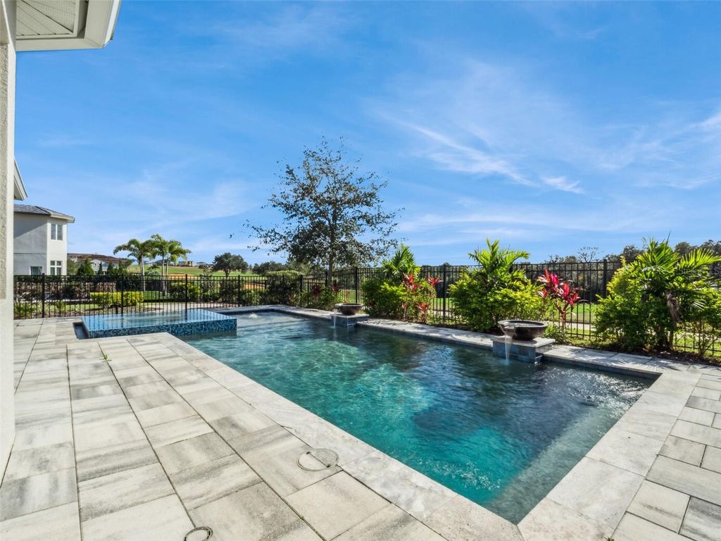 Former model home! Loaded with UPGRADES! Nestled within the gates of Bella Collina, this stunning five-bedroom pool home offers a masterclass in modern luxury overlooking the 16th hole of the championship golf course. This lot features an added unique benefit with no direct front neighbors, being across from hole 1 green in addition to no rear neighbors. The exterior makes a grand first impression with a concrete paver driveway and walkways, complemented by professional aluminum gutters. Inside, the home feels incredibly spacious with ten-foot ceilings on the first floor and nine-foot ceilings on the second, accented by eight-foot doors and custom wood-capped window sills throughout. The designer kitchen is a chef's dream, featuring granite countertops with a custom edge, upgraded stainless appliances, and luxury Emser ceramic tile flooring that extends through the foyer, laundry, and all bathrooms. The primary suite serves as a true sanctuary, boasting a spa-inspired bathroom with raised-height double vanities, a modern walk-in shower, and a beautiful free-standing tub perfect for unwinding. High-end finishes continue through the additional three and a half bathrooms, ensuring comfort for guests and family alike. Transitioning to the outdoors is seamless through the expansive living area to a magnificent covered lanai. This outdoor retreat features a fully equipped summer kitchen and a sparkling pool and spa, all framed by breathtaking views of the lush green fairways. With its blend of architectural details and an unbeatable golf course location, this home provides an unparalleled lifestyle in one of Montverde's most sought-after communities. Behind the 24 hours guarded gates residents enjoy exclusive access to The Club at Bella Collina, which offers Har-Tru tennis courts, a resort-style pool complex, fitness center, 2 restaurants, pickle ball, a Nick Faldo-designed 18-hole championship golf course, Pro shop, incredible spa and year-round social and culinary events.
