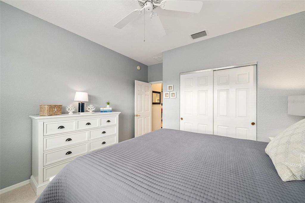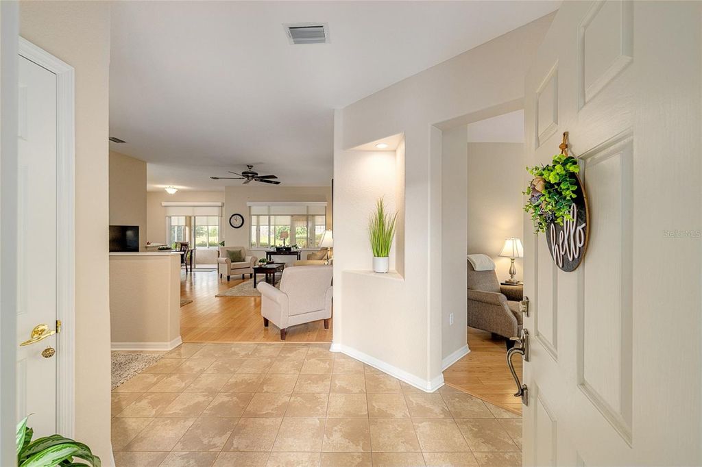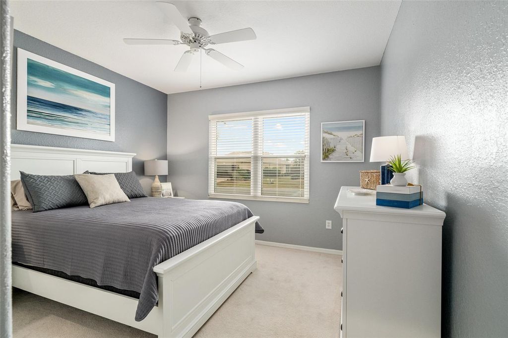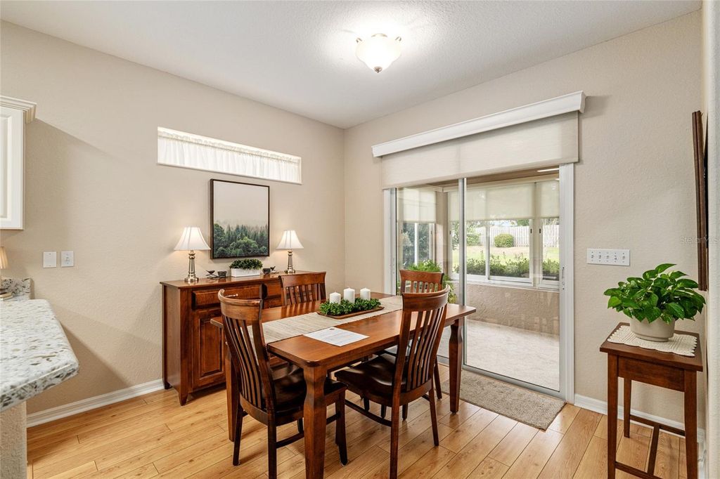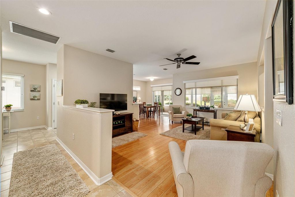 One of Del Webb's most popular models is now available and truly a must-see. Situated on a very private lot with room for a pool, this beautifully upgraded home offers exceptional indoor and outdoor living. From the moment you review the description, photos, and video, you'll want to schedule a personal tour. The upgraded kitchen features tall white refaced cabinets with custom hardware, granite countertops, stainless steel appliances, recessed lighting, and ceramic tile flooring. The spacious primary suite includes bay windows, a ceiling fan, carpeted flooring, and a completely renovated ensuite with a large walk-in shower, skylight, and tile flooring. The guest bedroom, located at the front of the home, offers carpeted flooring, wood valances, and a ceiling fan. The fully remodeled guest bath features tile flooring. A versatile study/den with engineered wood flooring is positioned between the bedrooms and provides ample space for an office, seating area, and even a hide-a-bed. The living and dining areas feature engineered wood flooring, mini blinds, and white wood valances. The enclosed lanai is under heat and air with acrylic windows and sunshades, overlooking a private fenced area just inside the boundary lines. An adjacent outdoor patio provides the perfect spot for grilling and enjoying the Florida sunshine. Additional highlights include beautifully manicured landscaping, a designer concrete driveway and walkway, fresh interior paint, and recently painted exterior. Major updates provide peace of mind with a new roof in 2021 and a new HVAC system and electric hot water heater installed in 2025 (converted from gas). Some furniture is available. Termite Bond with Massey is assumable. This move-in-ready home has been thoughtfully maintained with no major expenses anticipated. Call today to schedule your private showing.