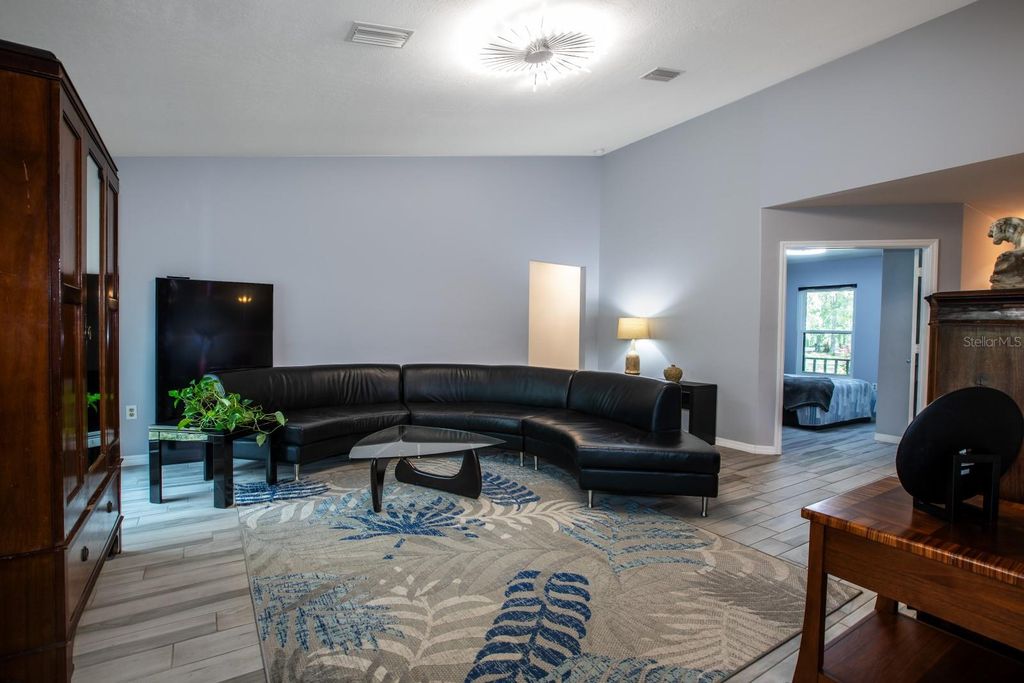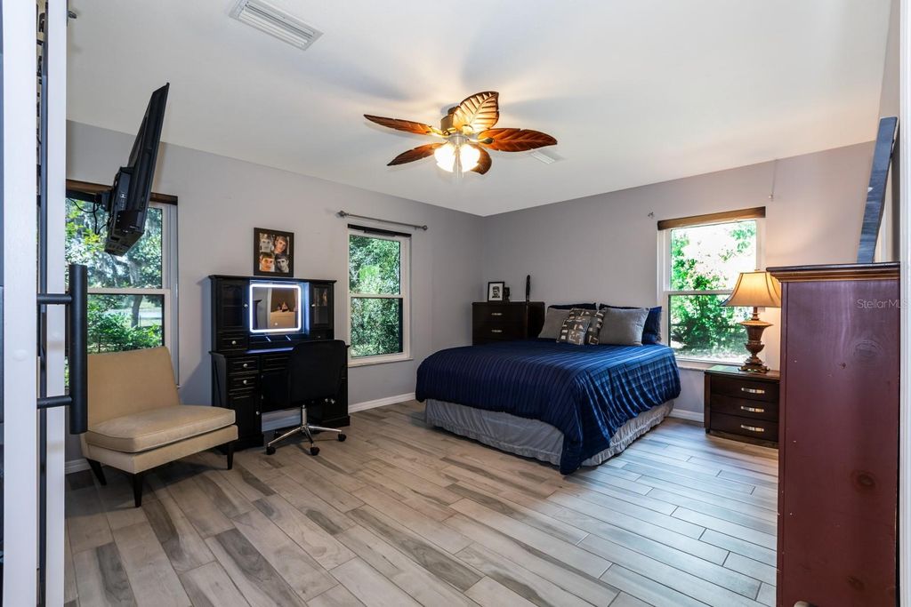 MOTIVATED SELLER - Nestled on 3.5 acres of serene waterfront countryside, this immaculate lakefront home offers the ultimate escape to peaceful rural living with no HOA! This charming 3-bedroom, 2.5-bath main residence includes a newly built 2-bedroom, 1-bath in-law suite with its own private entrance, perfect for guests or extended family. Embrace the tranquility of country life on a sparkling private lake, surrounded by sprawling acreage. The home boasts a 2015 metal roof, a security system, and updated windows, with a new A/C installed in 2019 and a whole-home gas generator for worry-free living. Fresh neutral paint graces both the interior and exterior, and the property is fully fenced, complete with a new chicken coop and resident egg-laying hens for that authentic farmstead feel. Step outside to a newly renovated private dock and a screened-in lakeside retreat ideal for soaking in the beauty of outdoor country living. A majestic canopy of trees lines the driveway, welcoming you to the home's inviting foyer. Inside, the expansive living room opens up with large windows showcasing breathtaking lake views. Luxury vinyl and tile flooring flow throughout, complemented by a kitchen and separate dining room that share the same stunning waterfront vistas. A fully glassed-in sunroom off the kitchen invites you to bask in the natural beauty, while a screened pergola with an upper deck leads to an above-ground pool for warm summer days. The spacious primary bedroom captures the lake's serene beauty. It features two closets, including a walk-in, plus a renovated en-suite bath with a walk-in tub, double vanity, and updated cabinetry. The fully renovated guest bath adds modern comfort, while the guest bedroom overlooks the front yard's newly planted orchard, brimming with avocado, orange, peach, and banana trees. Just minutes from The Villages and Lake Weir, with boat ramps a half-mile away for access to the Chain of Lakes and Silver Springs, this property is a haven for outdoor enthusiasts. Enjoy endless recreational activities, from fishing and boating to soaking in spectacular sunsets. If you dream of peaceful country living by the water, with wide-open spaces and rural charm, this lakefront gem is your perfect home!