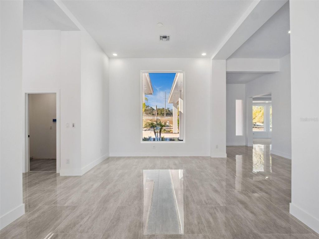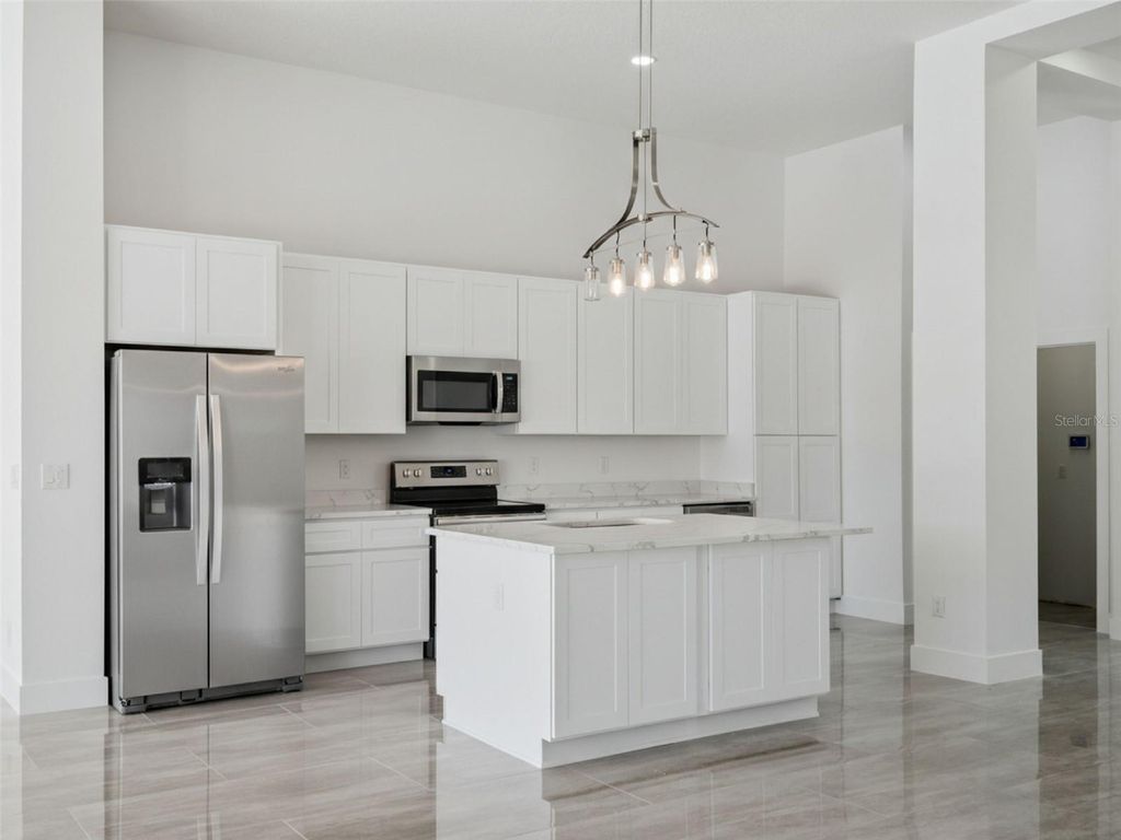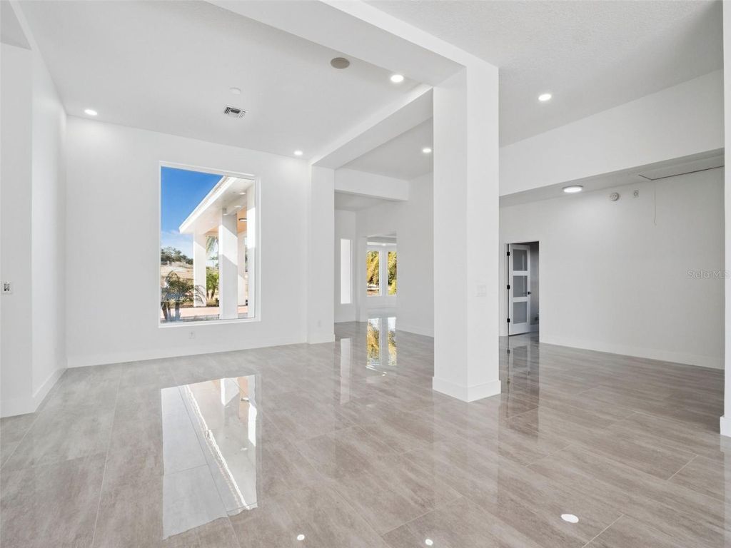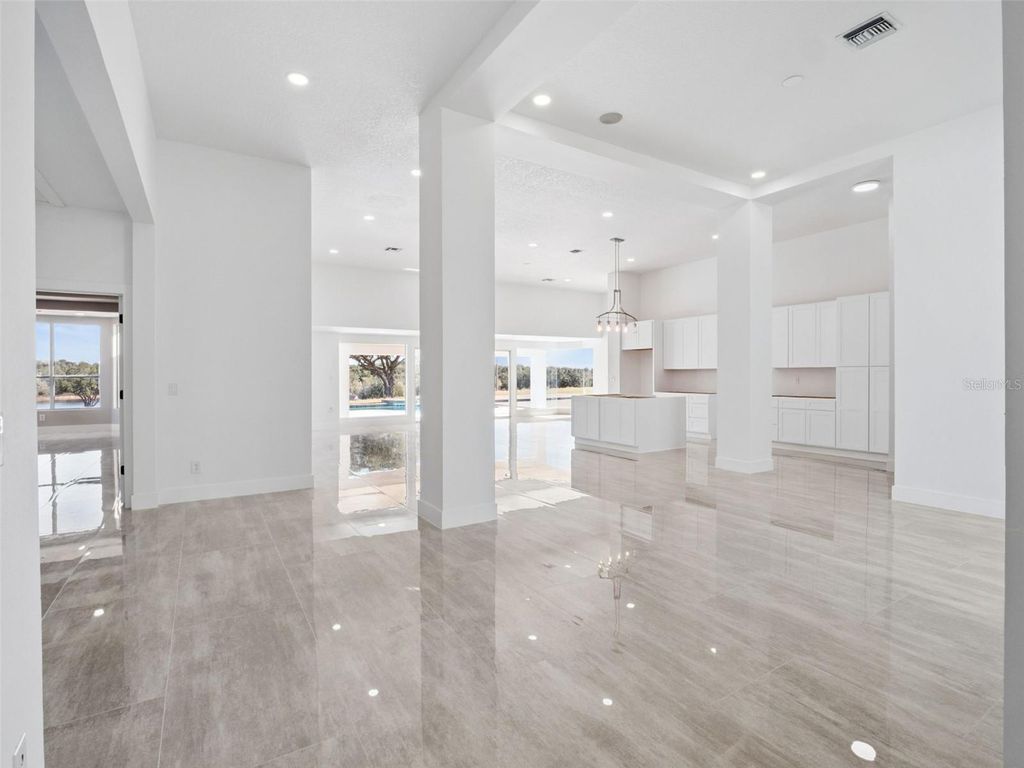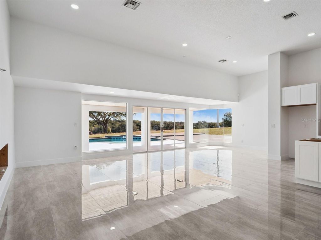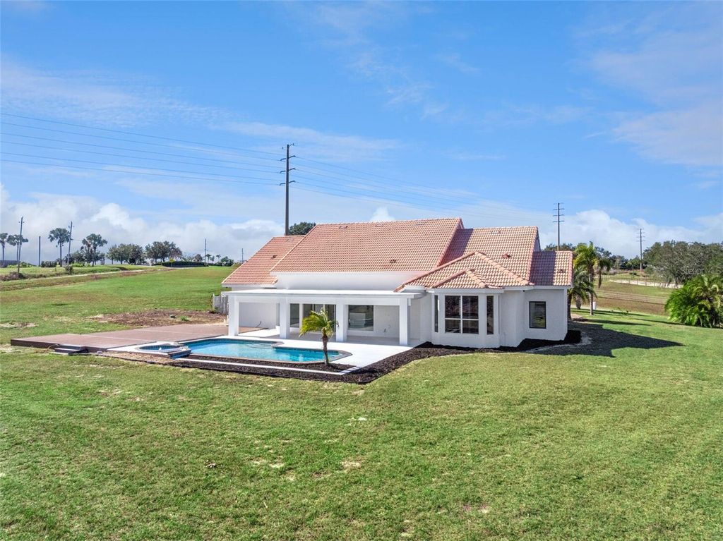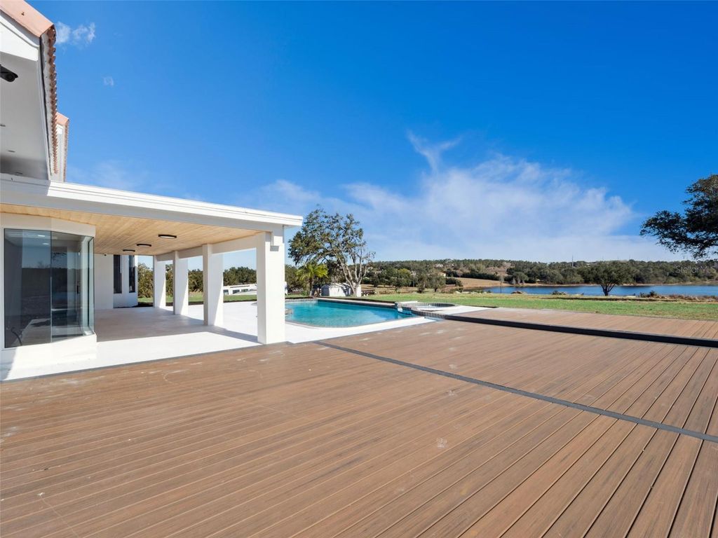 One or more photo(s) has been virtually staged. Discover the perfect blend of modern luxury and serene country living in this stunningly remodeled pool home. Situated on nearly two acres of lush land in Groveland, (with 5+ more acres available to purchase next door) this expansive estate offers over 3,800 square feet of meticulously designed living space, featuring 5 bedrooms and 3 full bathrooms. The heart of the home is a bright, open-concept kitchen and living area, showcasing polished oversized tile floors and abundant natural light. The kitchen is a showstopper, featuring sleek white cabinetry, a large central island, and modern pendant lighting. Retreat to the primary suite, which includes a spa-like bathroom with a massive walk-in shower, a contemporary soaking tub, and a double vanity with an integrated LED mirror. Exceptional flexibility defines this floor plan, which includes an additional flex room and a dedicated media room"”perfect for a home office, gym, or theater. Large sliding glass doors lead you to a private outdoor oasis, where a sparkling pool and integrated spa await. The sprawling patio provides the ideal backdrop for entertaining while enjoying peaceful views of the expansive backyard and distant lake. With a spacious circular driveway and no HOA, this property offers the freedom and privacy you've been searching for. Come experience the quality craftsmanship and thoughtful upgrades that make this house a true retreat. (kitchen countertops & appliances virtually staged - buyer can pick out finishes- samples of counter tops inside the home)