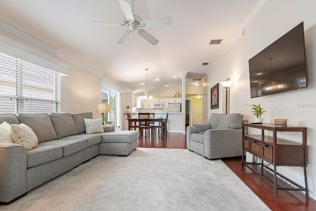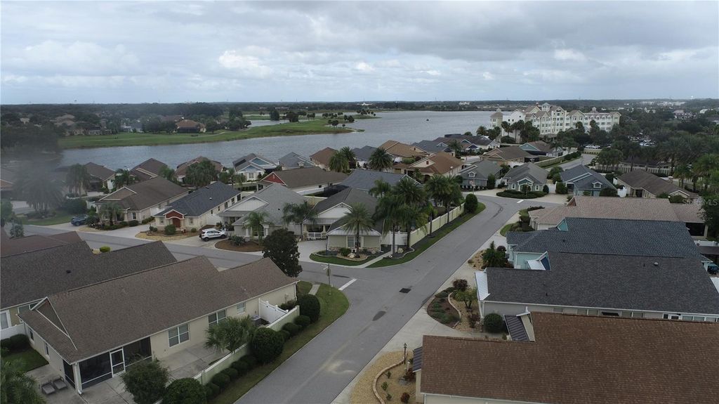 Welcome to the highly sought-after Village of Bridgeport at Lake Sumter. These Edgewater Bungalows are where luxury meets a walk-to-town lifestyle. This TURNKEY 3BR/2BA block and stucco Glen Arbor Model Courtyard Villa is ideally situated just steps from the Waterfront Hotel and Lake Sumter Landing. Covered front porch with seating area in front. Private courtyard retreat in back that is also perfect for pets. Major premium updates completed September 2025 include a new roof (HD shingles), high-efficiency HVAC system, and new water heater, providing peace of mind for years to come. Inside, the home sparkles with upscale finishes. New stunning Miaggio Quartz countertops grace the kitchen and baths, engineered hardwood flooring throughout with Armstrong Premium ceramic tile in the wet areas, custom 5¾" crown molding, and handcrafted wood cornice boxes accent every window and add timeless elegance. Big beautiful all-white kitchen. White cabinets with champagne gold hardware, white appliances, stunning white quartz counters, white subway tile backsplash, extra deep stainless steel sink, and new garbage disposal. A must see! Vaulted floor plan throughout. The primary suite features an elegant tray ceiling, walk-in closet, private ensuite, and sliding doors leading directly to the screened lanai. The lanai has a freshly painted attractive floor. The second bedroom sits beside a full bathroom, and a pocket door creates a private guest suite when desired. The third bedroom offers flexibility such as a hobby room, home office, or den, complete with built-in shelving. Indoor laundry room with a window, utility sink, and pocket door that can close it off from the hall. The garage features a new epoxy floor, freshly painted white walls, and two bright windows, plus TWO NEW Bianchi bicycles"”so you can begin enjoying The Villages lifestyle from day one. Freshly painted inside and out with premium Sherwin Williams paint. Keyless entry front door. This model is comparable to the Foxglove model only this one has a covered patio in front where the Foxglove has none. Schedule your private showing soon. Owners are licensed Real Estate Professionals. Bond Balance: $5,452.