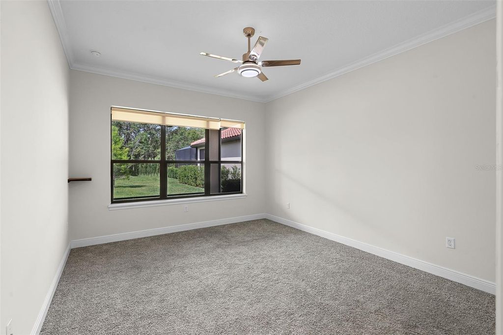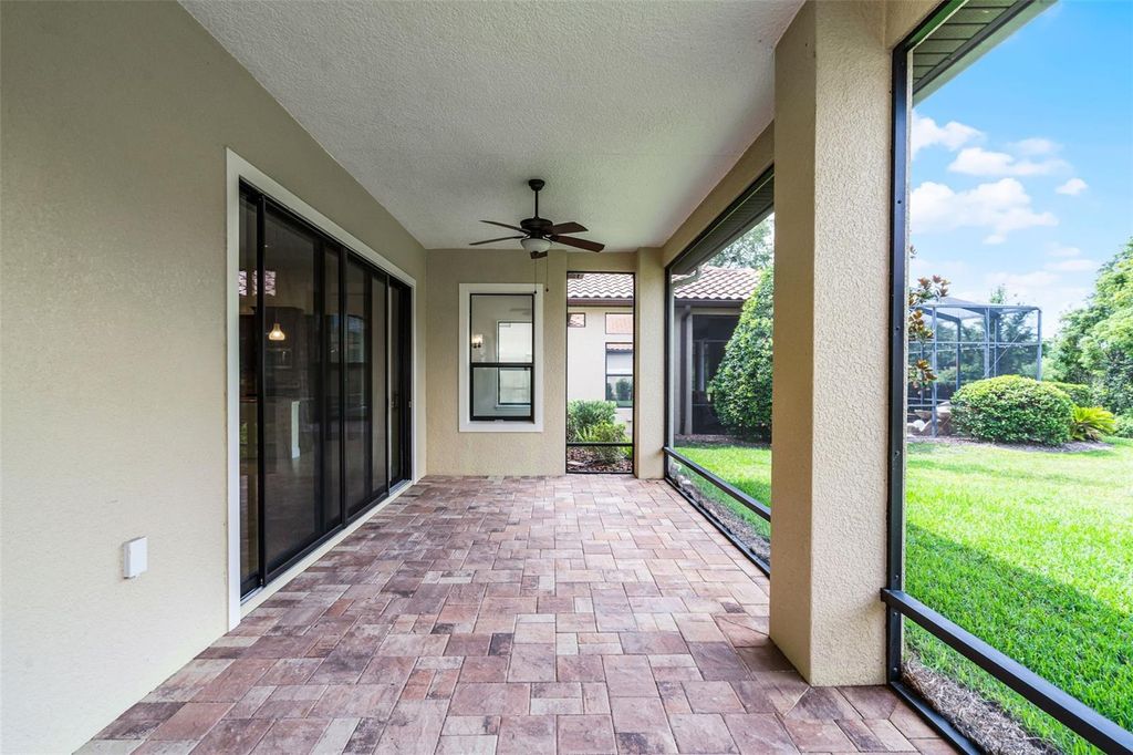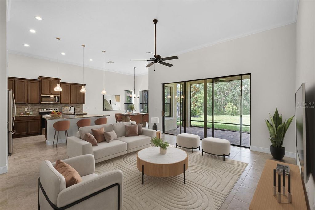 One or more photo(s) has been virtually staged. This beautifully crafted KEVCO-built residence offers timeless Mediterranean design paired with quality craftsmanship and thoughtful details throughout. One of only a limited number of KEVCO homes within Las Colinas, this 3-bedroom, 2-bath split floor plan blends elegance with everyday functionality. Step through the impressive leaded-glass double entry doors into a light-filled interior highlighted by soaring 12-foot ceilings with crown molding in every room, solid wood interior doors accented with detailed architrave trim and casing, custom softwood cabinetry, and granite countertops throughout. Expansive triple glass sliding doors open to a covered rear lanai overlooking a deep, private backyard with peaceful greenbelt views and ample room to design and build your own pool. Beyond the home itself, residents enjoy the distinctive charm of Las Colinas, a professionally maintained enclave known for its tile-roof custom homes and beautiful tree-lined streets. The neighborhood is located within the gates of the newly renovated Mission Resort + Club, set among the rolling hills, majestic live oaks, and scenic lakes of Lake County. Mission Resort + Club has been recognized among the Top 25 Historic Golf Resorts in America and features two championship golf courses ranked among Florida's finest. Membership (Golf or Social) is required and provides access to the resort's exceptional amenities including championship golf, a full-service pro shop, three on-site restaurants, a spa, fitness center, resort-style pool, hot tub, tennis courts, pickleball courts, and close proximity to the Harris Chain of Lakes, known for world-class bass fishing and boat-up dining. Lawn care is included as well for an additional monthly fee of $153. Conveniently located approximately 10 miles from the Florida Turnpike, about 20 minutes to historic downtown Mount Dora, and under an hour to Orlando International Airport and Central Florida attractions, this home offers a rare opportunity to enjoy resort-style living in one of the area's most distinguished gated communities. Schedule your private showing and experience the Mission Resort lifestyle for yourself.