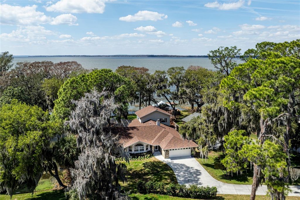 Welcome to a rare opportunity to own a private waterfront retreat on the shores of Lake Harris, one of the many lakes that make up the highly sought-after Harris Chain of Lakes. Offering over 3,100+ square feet of living space, this beautifully updated 3-bedroom, 2-bath home is perfectly positioned on a .67-acre lot on a quiet dead-end road, delivering exceptional privacy and breathtaking lake views. Located in unincorporated Lake County, you'll enjoy the benefit of lower property taxes while still being just minutes from downtown Tavares, shopping, dining, and medical facilities. Inside, the home has been extensively updated and thoughtfully designed. The fully renovated kitchen features granite countertops, updated appliances, custom backsplash, abundant cabinetry, and a spacious breakfast bar overlooking the living areas. New hickory hardwood floors run throughout the home, complemented by updated plumbing, luxury ceiling fans, and beautifully renovated bathrooms with new vanities and one-piece luxury toilets. A redesigned fireplace and mantel add warmth and character, while new windows, doors, and a panoramic glass frame that fill the home with natural light and stunning lake views. The open-concept living area flows seamlessly to the outdoor space, where a large, screened pool enclosure opens to new paver patios, a custom paver firepit, and mature oak trees that create a park-like setting. The decorative stone façade and decorative concrete driveway (2021) provide outstanding curb appeal. Upstairs, the spacious loft area is ideal for a home office, creative studio, or quiet reading retreat, offering flexibility to suit your lifestyle while overlooking the main living space. For boating enthusiasts, the property features direct Lake Harris frontage along with a private canal leading to a covered boathouse equipped with a new lift and automatic boat cover. Enjoy year-round navigable access to the entire Harris Chain of Lakes "” perfect for boating, fishing, waterfront dining, and sunset cruises right from your backyard. Major improvements include a new roof (2021) and a three-zone HVAC system (2021), providing peace of mind for years to come. This is more than a home ~ it's a private Lake Harris lifestyle defined by space, sunsets, and endless waterfront possibilities.