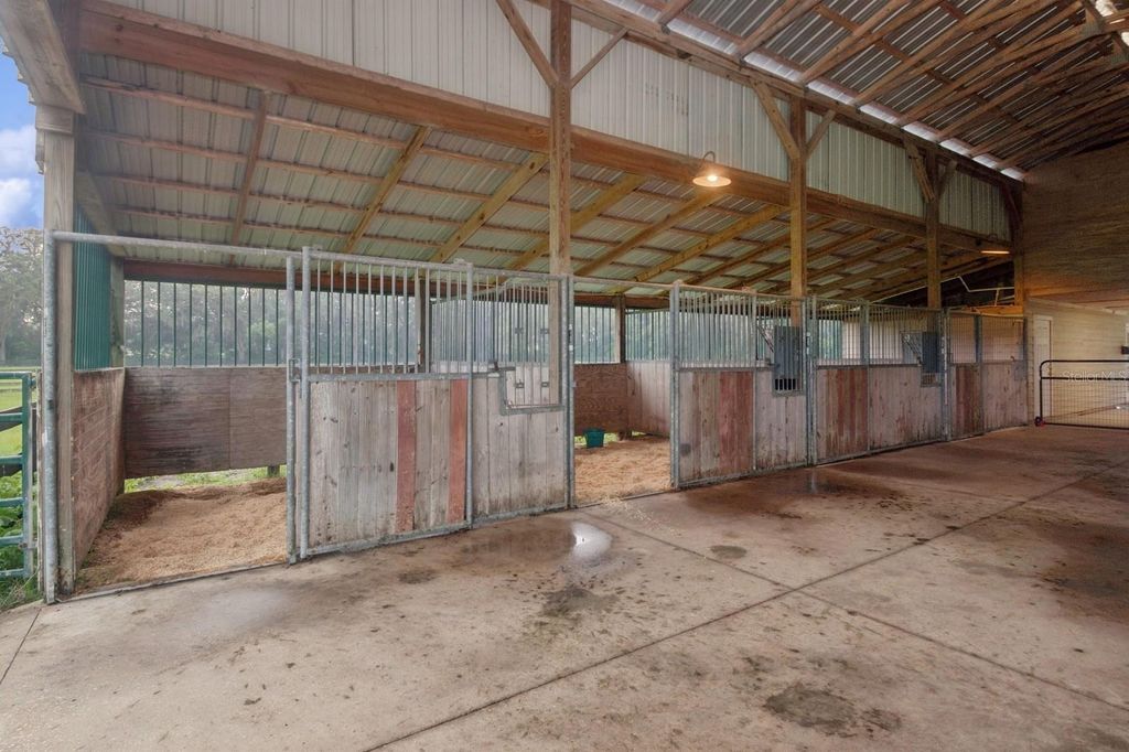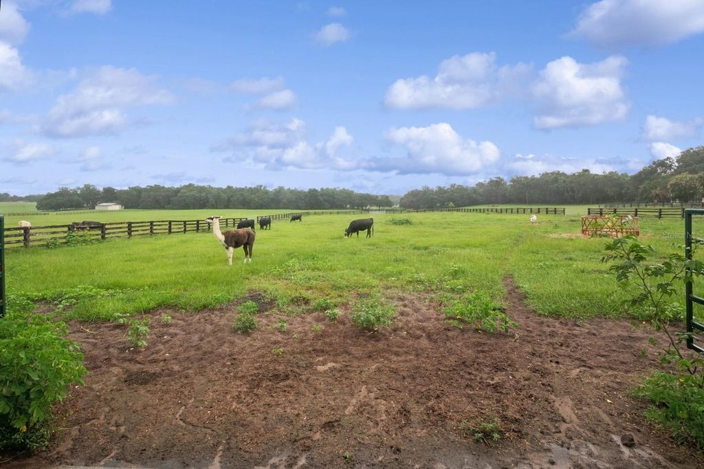 Welcome to an extraordinary 13-acre equestrian estate that delivers not just a home, but a way of life. The main residence features 5 spacious bedrooms and 3.5 bathrooms, while two additional private bedroom suites are thoughtfully integrated into the expansive guest and recreation quarters on the property. With 7 total bedrooms and 5.5 bathrooms, there's more than enough space for everyone to live, unwind, and entertain in comfort. Wake each morning to peaceful views across rolling pastures, where soft morning light filters through a canopy of towering oak trees, some with trunks more than five feet wide, offering both shade and timeless charm. Whether you're an equestrian enthusiast, hobby farmer, or simply craving space and serenity, this estate delivers the perfect blend of modern comfort and country charm. The main residence spans 3,890 square feet of thoughtfully designed living space with soaring 20-foot tongue-and-groove pine ceilings, a two-story stone fireplace, and a grand staircase made for memory-making. The first-floor primary suite offers dual walk-in closets and a spacious ensuite bath, while four additional upstairs bedrooms"”including one nearly the size of a studio apartment"”surround an open loft overlooking the great room. The living room (20x16) is perfect for cozy nights or lively gatherings, and the oversized kitchen (25x14) comes equipped with new Samsung appliances (2023) and two sets of washers and dryers in the separate laundry room to make everyday living effortless. This home also includes a new A/C system and a new roof installed in 2024, offering peace of mind for years to come. This home was built with both beauty and practicality in mind"”from laundry chutes and storage galore to real hardwood floors and luxury finishes. Step outside and picture yourself relaxing by the heated pool and elevated spa under a screened enclosure, or casting a line into your private pond. Majestic oak trees provide the perfect shade for hammocks and picnics, and every acre is bordered with four-board wood fencing to keep your animals secure and your privacy intact. The equestrian amenities include a massive 80+ foot by 40+ foot covered barn with four completed stalls, room for four more, a tack room, a storage room, and two private apartment-style suites. One is an approximately 300 SF in-law or ranch-hand apartment with its own en suite, and the other is an upstairs approximately 350 SF guest suite, also with its own en suite"”perfect for multigenerational living or rental income. The high-end recreation barn"”complete with horse stalls, a tack and feed room, and two stunning apartment-style suites"”offers luxury and flexibility for family, guests, or ranch staff. With two wells, one for the home and one for the barn, both serviced by premium Kinetico water systems, you'll enjoy fresh, clean water no matter where you are on the property. All of this sits just minutes from The Villages for shopping and dining, only 40 miles from the World Equestrian Center in Ocala, and about an hour from the magic of Walt Disney World or the sandy shores of either Florida coast. There are no HOA restrictions, just wide-open freedom to create the lifestyle you've always dreamed of. This is your chance to own more than a home. It's a place to plant roots, raise animals, host unforgettable gatherings, and live out your dreams in one of Central Florida's most unique and desirable locations.