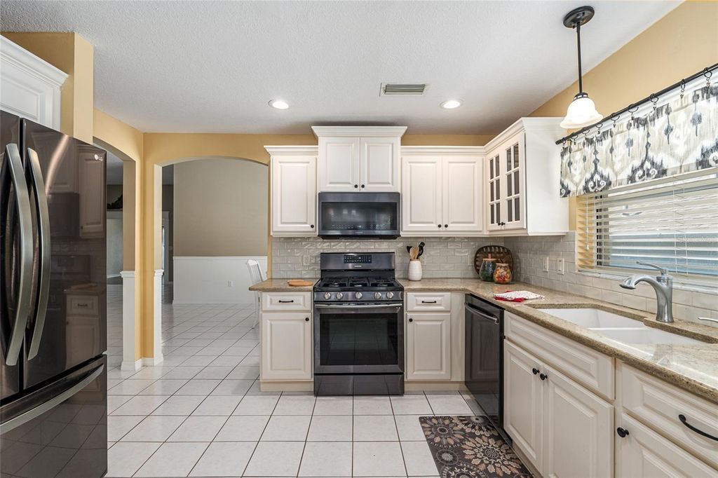 Located in the Village of La Zamora, this Vera Cruz model offers a prime setting near Chula Vista Recreation Center, Spanish Springs Town Square, shopping, dining, and the Villages bike trail. Bond is paid. Roof replaced in 2020. This 3-bedroom, 2-bath home with an additional 11' x 13' bonus room has been thoughtfully updated throughout with no carpets, no popcorn ceilings, vaulted ceilings, and enhanced natural light from two solar tubes. The interior showcases a well-designed split floor plan with upgraded finishes and modern touches. The kitchen features smudge-resistant black stainless steel appliances, granite countertops, recessed lighting, gas stove, and convenient pull-out cabinet drawers. A spacious breakfast nook with wooden window blinds"”featured throughout the home"”complements the open living space, highlighted by a gas fireplace. Both the master and guest bathrooms have been recently remodeled, while the primary suite includes dual walk-in closets for optimal storage. Additional interior features include a large mudroom/laundry room with newer washer and dryer, mini-fridge, built-in cabinetry, storage bench, and ample workspace. French doors and a screened front entry create excellent airflow leading to the screened lanai, enhancing indoor-outdoor living. Exterior highlights include mature landscaping with exceptional curb appeal, a programmable lawn irrigation system, leaf-protected gutters, and a covered front porch seating area. The extended garage offers substantial storage with a workbench, upper and lower cabinets, additional shelving, utility sink, and a freshly painted floor. This well-maintained block and stucco home combines functional upgrades, quality finishes, and an unbeatable location in The Villages. SHOWINGS ARE BY APPOINTMENT ONLY - NO OPEN HOUSES!