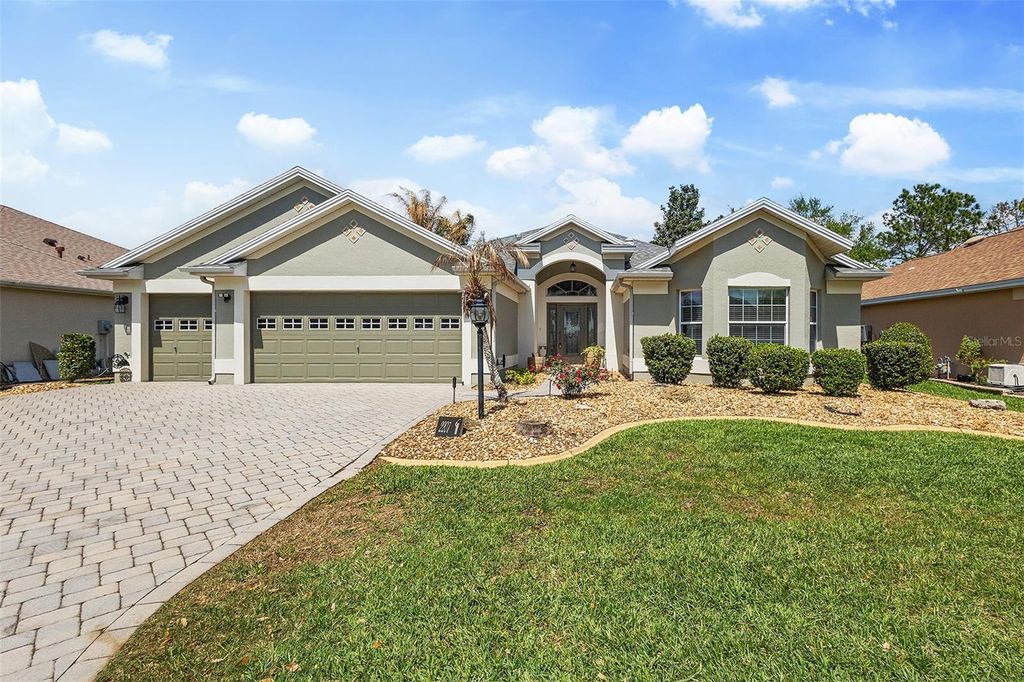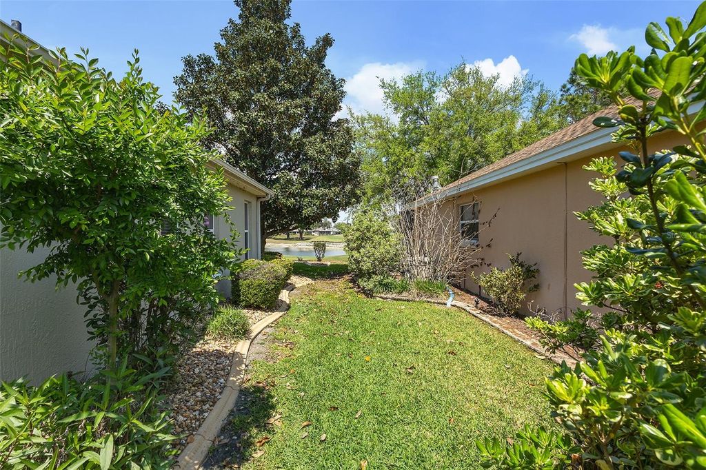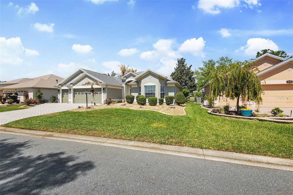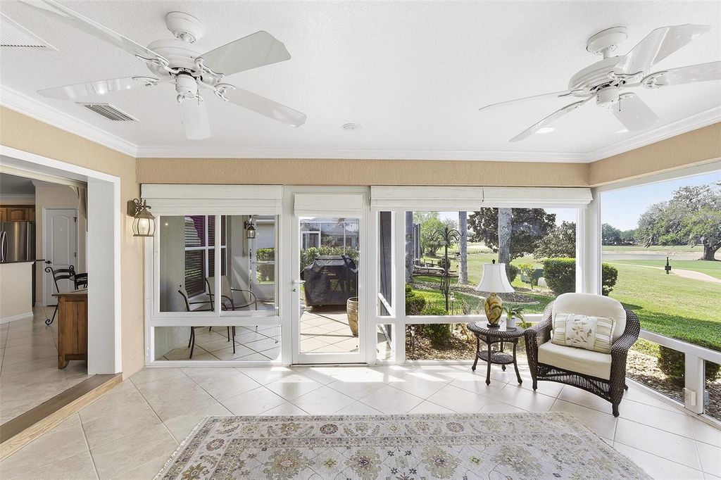Panoramic Golf & Water Views | Turnkey Furnished | ROOF 2022 | HVAC 2021 | 2-Car + Golf Cart Garage with Carts Included * NO BOND Welcome Home to this beautifully expanded Lantana model in the highly desirable Village of Bonnybrook, where breathtaking panoramic views of the golf course and a shimmering pond create a truly unforgettable backdrop. From the moment you arrive, the pavered driveway, enhanced by low-maintenance landscaping, sets the tone for the care and quality found throughout this exceptional home. Step inside to discover a light-filled interior with VOLUME CEILINGS and CROWN MOLDING that elevate the space, while tile flooring flows seamlessly through the main living areas. The thoughtfully expanded layout offers additional living space, highlighted by an ENCLOSED GLASS LANAI that brings the outdoors in and allows you to enjoy the SPECTACULAR VIEWS year-round. Solar tubes add an abundance of natural light, creating a warm and inviting atmosphere throughout the home. The kitchen is both stylish and functional, featuring granite countertops, stainless steel appliances with gas stove, ample cabinetry, and a layout that opens effortlessly to the dining and living areas"”perfect for entertaining or everyday living. The home is offered turnkey with TASTEFUL FURNISHINGS and home goods, making it truly move-in ready. The spacious primary suite serves as a private retreat, designed for both comfort and functionality. Enjoy a SPACIOUS custom walk-in closet outfitted with tailored shelving to maximize organization and storage. The en-suite bathroom is equally impressive, featuring dual vanities with granite countertops, abundant cabinetry, and a beautifully tiled shower complete with a built-in bench for added comfort and ease. Two additional guest bedrooms"”each with closets"”offer flexibility for visiting guests, a home office, or hobby space, while the guest bathroom is thoughtfully appointed with matching granite finishes and includes a solid surface tub/shower combination. Step out back to your private outdoor oasis where the BIRDCAGE and open patio space create the perfect setting for grilling, relaxing, and soaking in the sweeping golf and water views. Whether enjoying a quiet morning coffee or entertaining friends at sunset, this outdoor space is simply unmatched. The garage offers both functionality and convenience with a full two-car plus golf cart configuration, complete with windows for natural light and 2 GOLF CARTS INCLUDED for easy access to all The Villages has to offer. Perfectly positioned in Bonnybrook, you're just minutes from Lake Sumter Landing, executive and championship golf courses, recreation centers, pools, shopping, and dining"”placing the very best of The Villages lifestyle right at your fingertips. This is more than a home"”it's a front-row seat to some of the most stunning views in The Villages.