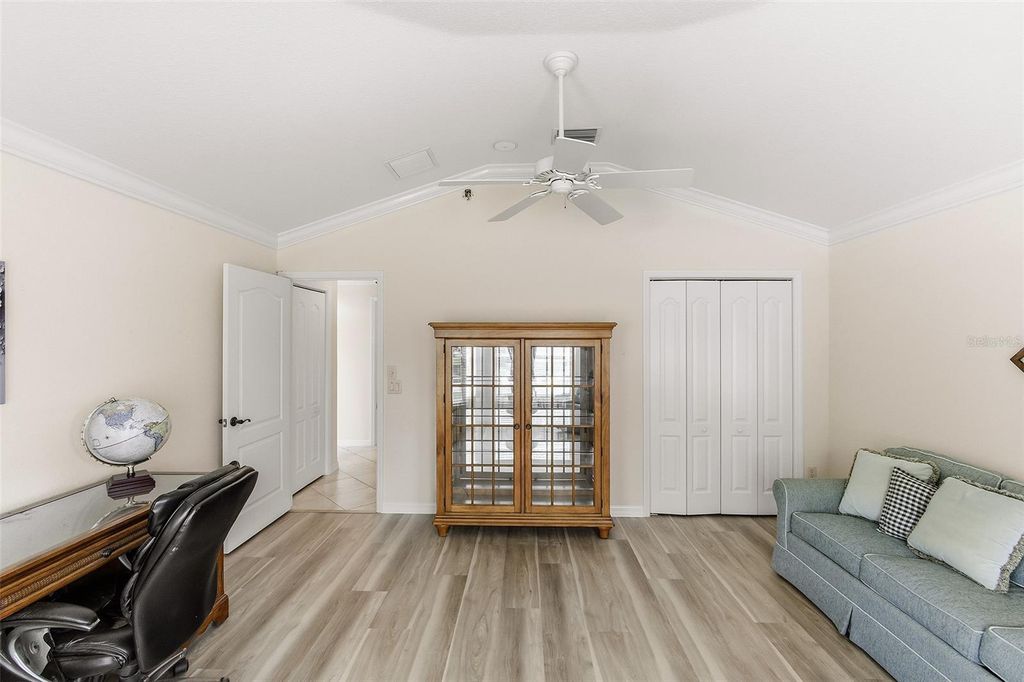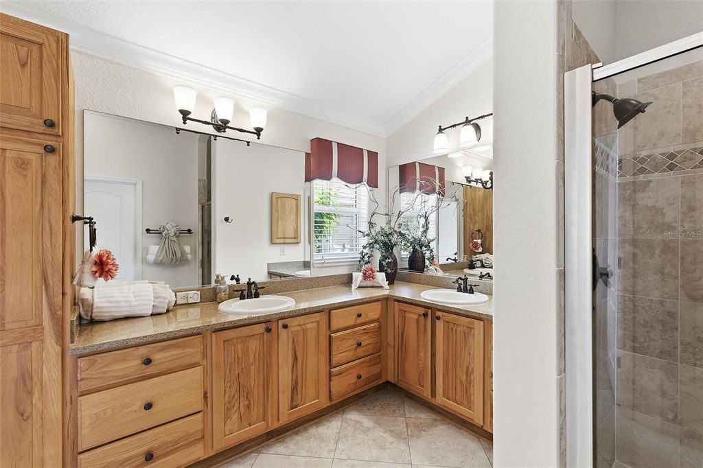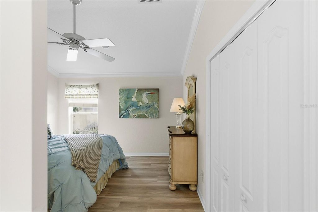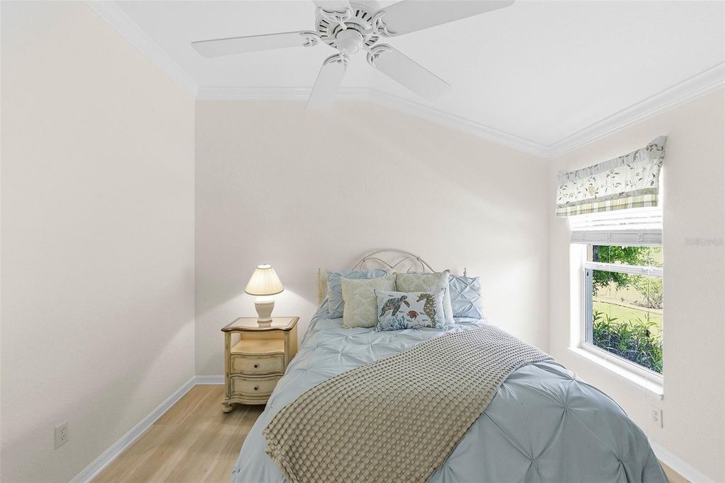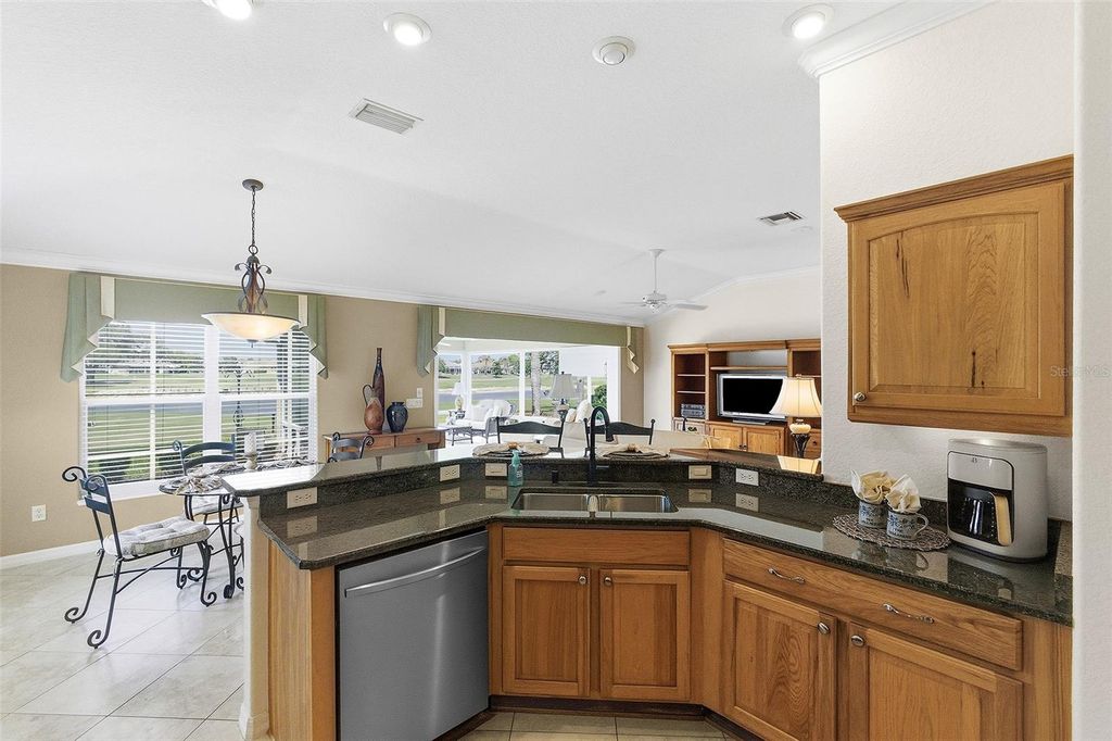 Panoramic Golf & Water Views | Turnkey Furnished | ROOF 2022 | HVAC 2021 | 2-Car + Golf Cart Garage with Carts Included * NO BOND Welcome Home to this beautifully expanded Lantana model in the highly desirable Village of Bonnybrook, where breathtaking panoramic views of the golf course and a shimmering pond create a truly unforgettable backdrop. From the moment you arrive, the pavered driveway, enhanced by low-maintenance landscaping, sets the tone for the care and quality found throughout this exceptional home. Step inside to discover a light-filled interior with VOLUME CEILINGS and CROWN MOLDING that elevate the space, while tile flooring flows seamlessly through the main living areas. The thoughtfully expanded layout offers additional living space, highlighted by an ENCLOSED GLASS LANAI that brings the outdoors in and allows you to enjoy the SPECTACULAR VIEWS year-round. Solar tubes add an abundance of natural light, creating a warm and inviting atmosphere throughout the home. The kitchen is both stylish and functional, featuring granite countertops, stainless steel appliances with gas stove, ample cabinetry, and a layout that opens effortlessly to the dining and living areas"”perfect for entertaining or everyday living. The home is offered turnkey with TASTEFUL FURNISHINGS and home goods, making it truly move-in ready. The spacious primary suite serves as a private retreat, designed for both comfort and functionality. Enjoy a SPACIOUS custom walk-in closet outfitted with tailored shelving to maximize organization and storage. The en-suite bathroom is equally impressive, featuring dual vanities with granite countertops, abundant cabinetry, and a beautifully tiled shower complete with a built-in bench for added comfort and ease. Two additional guest bedrooms"”each with closets"”offer flexibility for visiting guests, a home office, or hobby space, while the guest bathroom is thoughtfully appointed with matching granite finishes and includes a solid surface tub/shower combination. Step out back to your private outdoor oasis where the BIRDCAGE and open patio space create the perfect setting for grilling, relaxing, and soaking in the sweeping golf and water views. Whether enjoying a quiet morning coffee or entertaining friends at sunset, this outdoor space is simply unmatched. The garage offers both functionality and convenience with a full two-car plus golf cart configuration, complete with windows for natural light and 2 GOLF CARTS INCLUDED for easy access to all The Villages has to offer. Perfectly positioned in Bonnybrook, you're just minutes from Lake Sumter Landing, executive and championship golf courses, recreation centers, pools, shopping, and dining"”placing the very best of The Villages lifestyle right at your fingertips. This is more than a home"”it's a front-row seat to some of the most stunning views in The Villages.