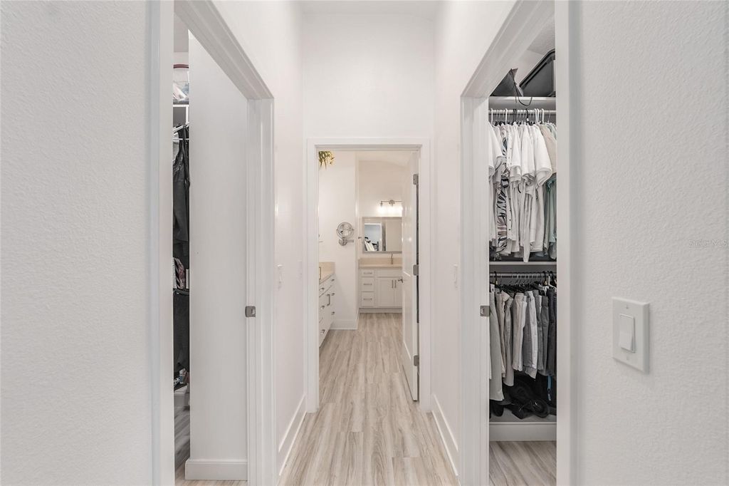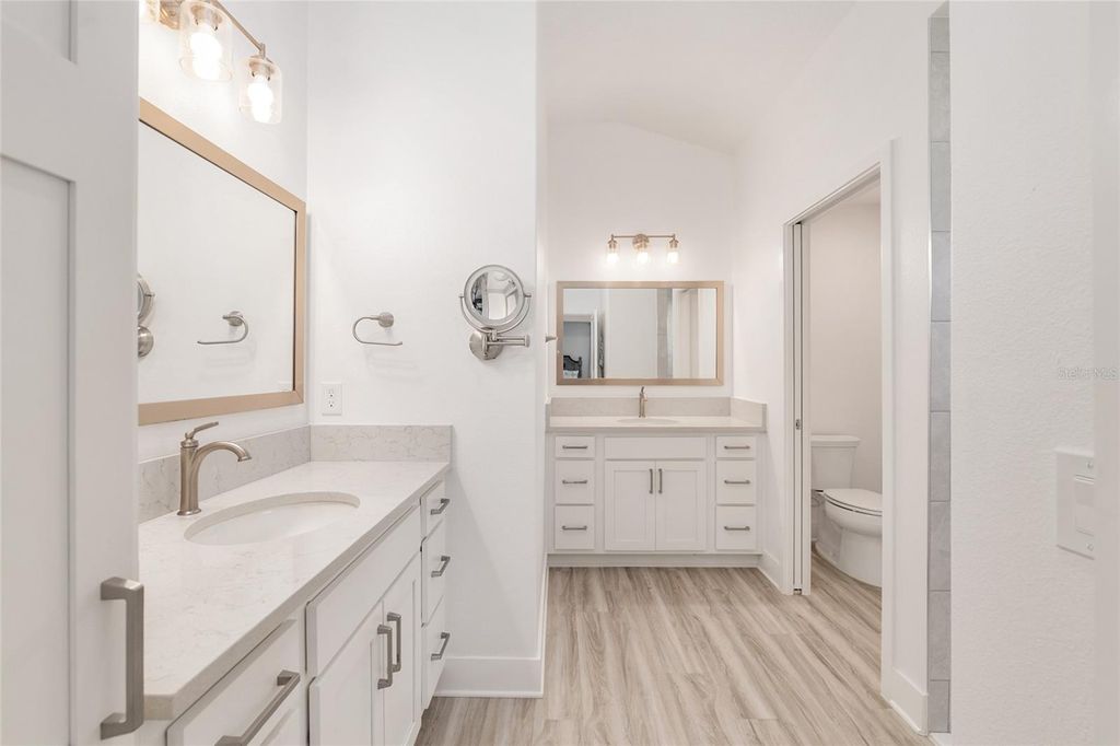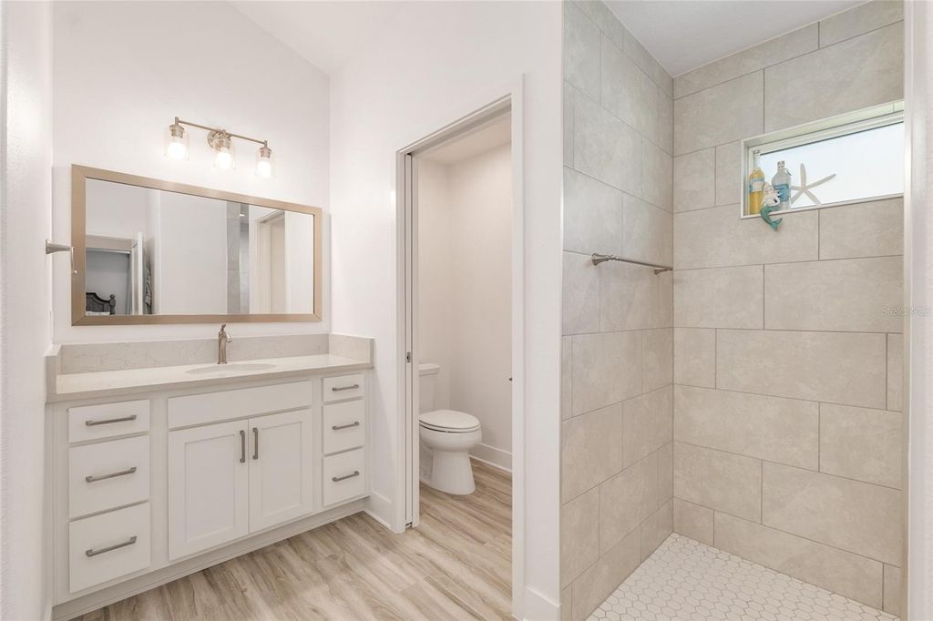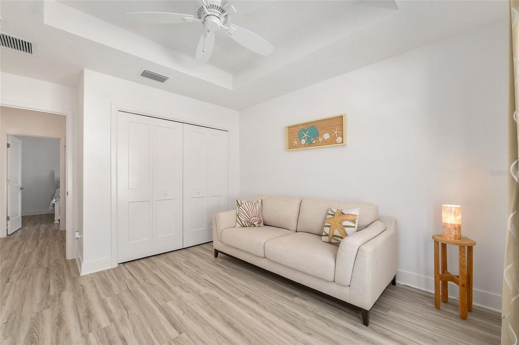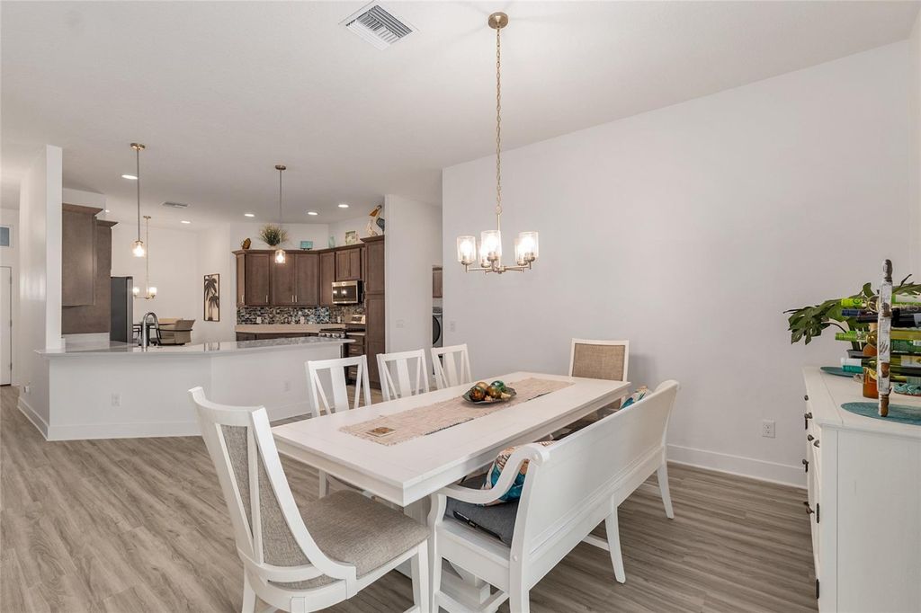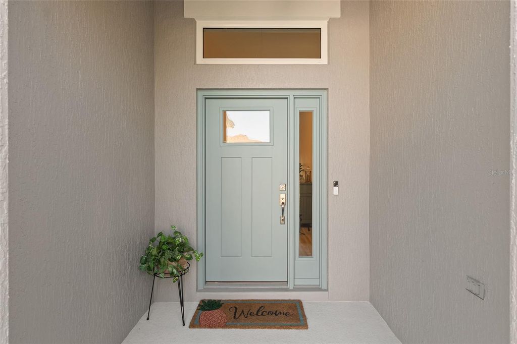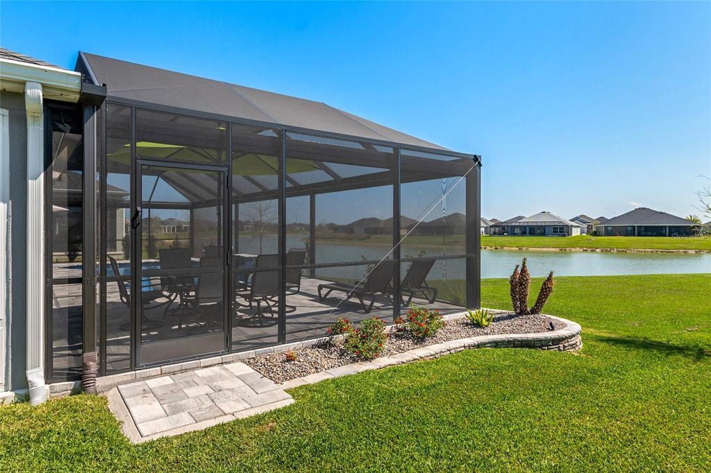 Step into elevated Florida living with this beautifully upgraded 2024-built 3-bedroom, 2-bath BLOCK & STUCCO, MOCKINGBIRD floorplan offering 1,959 sq ft of thoughtfully designed living space in the Village of Moultrie Creek in The Villages. Perfectly positioned with a serene WATER VIEW and just minutes from the highly anticipated EASTPORT TOWN CENTER, this home delivers an exceptional combination of space, style, and location. From the moment you arrive, the ELEVATED, STONE-CURBED LANDSCAPING surrounding the home creates a polished and inviting first impression. The expanded driveway leads to a highly desirable 2-CAR GARAGE PLUS GOLF CART GARAGE, providing ample space for all vehicles and the signature Villages lifestyle. Inside, the SPLIT OPEN FLOORPLAN is designed for both everyday living and entertaining, featuring VAULTED CEILINGS, abundant natural light, and LUXURY VINYL FLOORING THROUGHOUT for a clean, modern, and low-maintenance finish. The kitchen serves as the heart of the home, showcasing QUARTZ COUNTERTOPS, CROWNED UPGRADED CABINETRY, TILE BACKSPLASH, PENDANT LIGHTING, and STAINLESS STEEL APPLIANCES, including a GAS STOVE with a built-in AIR FRYER and a FARMHOUSE SINK. The seamless flow into the dining and living areas makes it ideal for both hosting and daily comfort. The primary suite offers a private retreat with a TRAY CEILING, abundant natural light, and HIS AND HERS CUSTOM CLOSETS. The en suite bathroom features DUAL SINKS, FRAMED MIRRORS, WHITE CABINETRY, and a WALK-IN TILE SHOWER with A BUILT-IN BENCH. Guest accommodations are thoughtfully positioned for privacy, with one guest bedroom featuring a TRAY CEILING and the other offering a VAULTED CEILING, and both including closets. The guest bathroom continues the upgraded finishes with QUARTZ COUNTERS, a FRAMED MIRROR, and a TUB AND SHOWER COMBINATION WITH TILE. SLIDING GLASS DOORS open to a HUGE GLASS-ENCLOSED FLORIDA ROOM with EPOXY FLOORING, PRIVACY SHADES, and LARGE CEILING FANS. Followed by a RESORT-STYLE IN-GROUND POOL under a BIRDCAGE ENCLOSURE with ELECTRIC PRIVACY SCREENS, a PAVER POOL DECK, and an OUTDOOR SUMMER KITCHEN that is perfect for entertaining. Additional highlights include an INSIDE LAUNDRY ROOM with BUILT-IN CABINETS and a UTILITY SINK for added convenience and storage. Location is a true standout, with close proximity to GOLF COURSES, RECREATION CENTERS, SHOPPING, DINING, and NIGHTLY ENTERTAINMENT, as well as the upcoming EASTPORT MEGA CENTER and TOWN SQUARES. Furniture is available as a separate purchase!